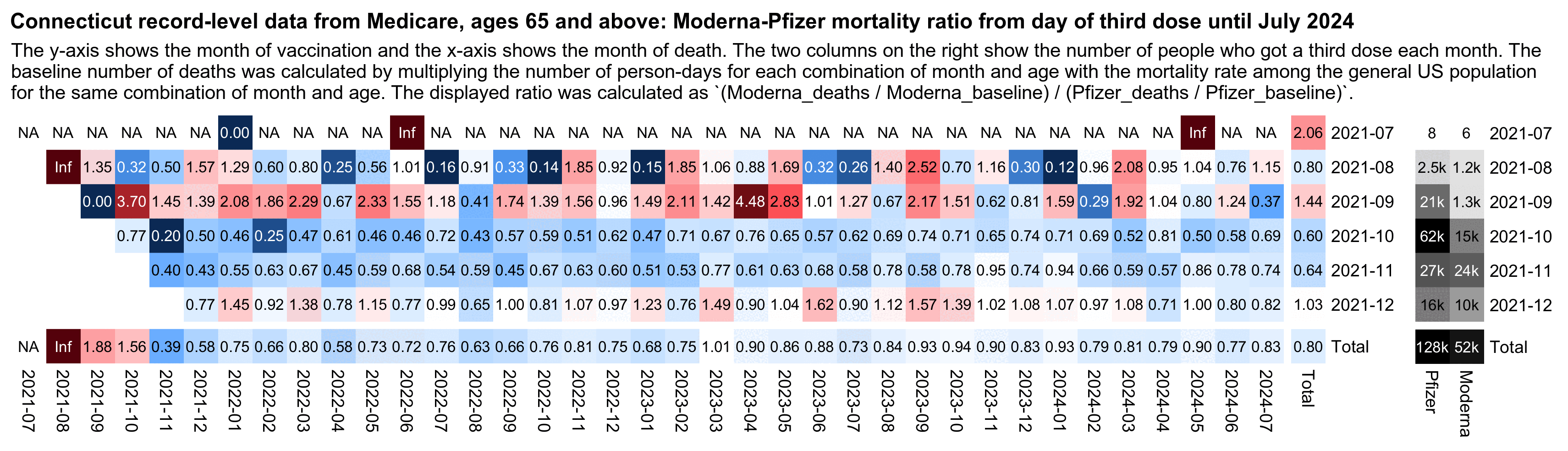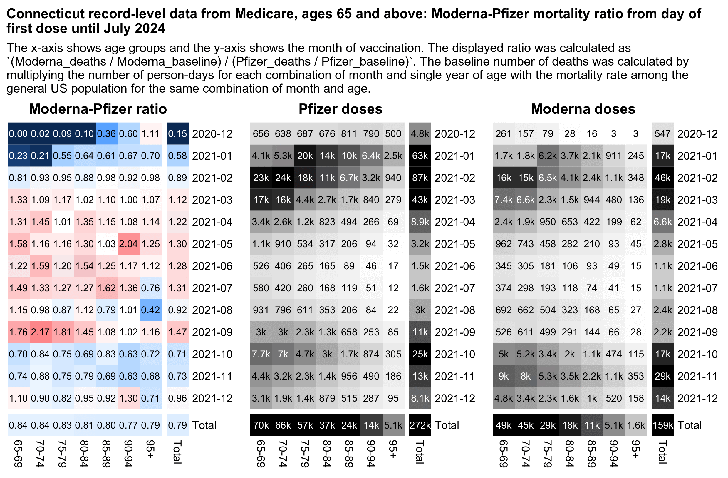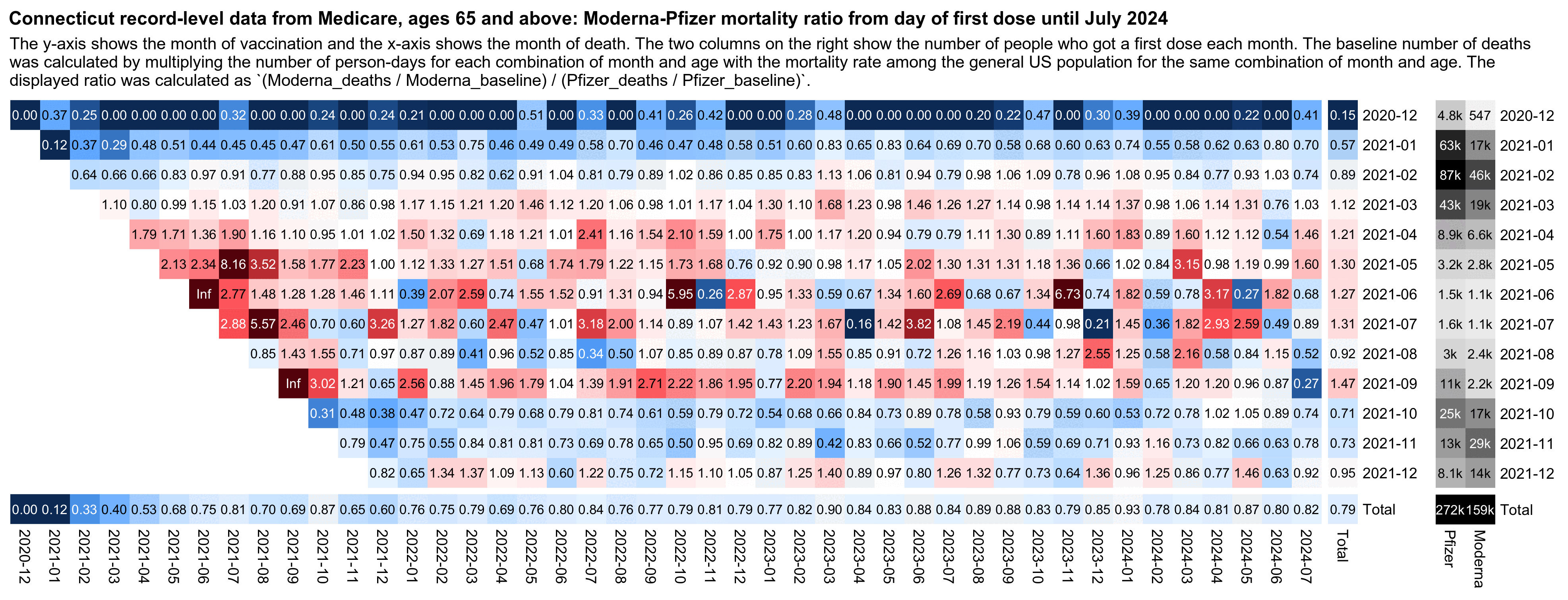 In the following code I calculated age-normalized mortality rates in the Connecticut data for each combination of vaccination month, ongoing month, and vaccine brand. And when I divided the rate for Moderna with the rate for Pfizer, the total ratio for all months of vaccination was about 0.79. Moderna got a higher rate among people who got the first dose in March, April, May, June, July, or September 2021, even though during other months the age-normalized rate was higher for Pfizer. So I think it shows that people who got Pfizer and Moderna vaccines had different profiles of confounders during different months of vaccination, even though I guess Kirsch might argue it was rather because some batches were more deadly than others: