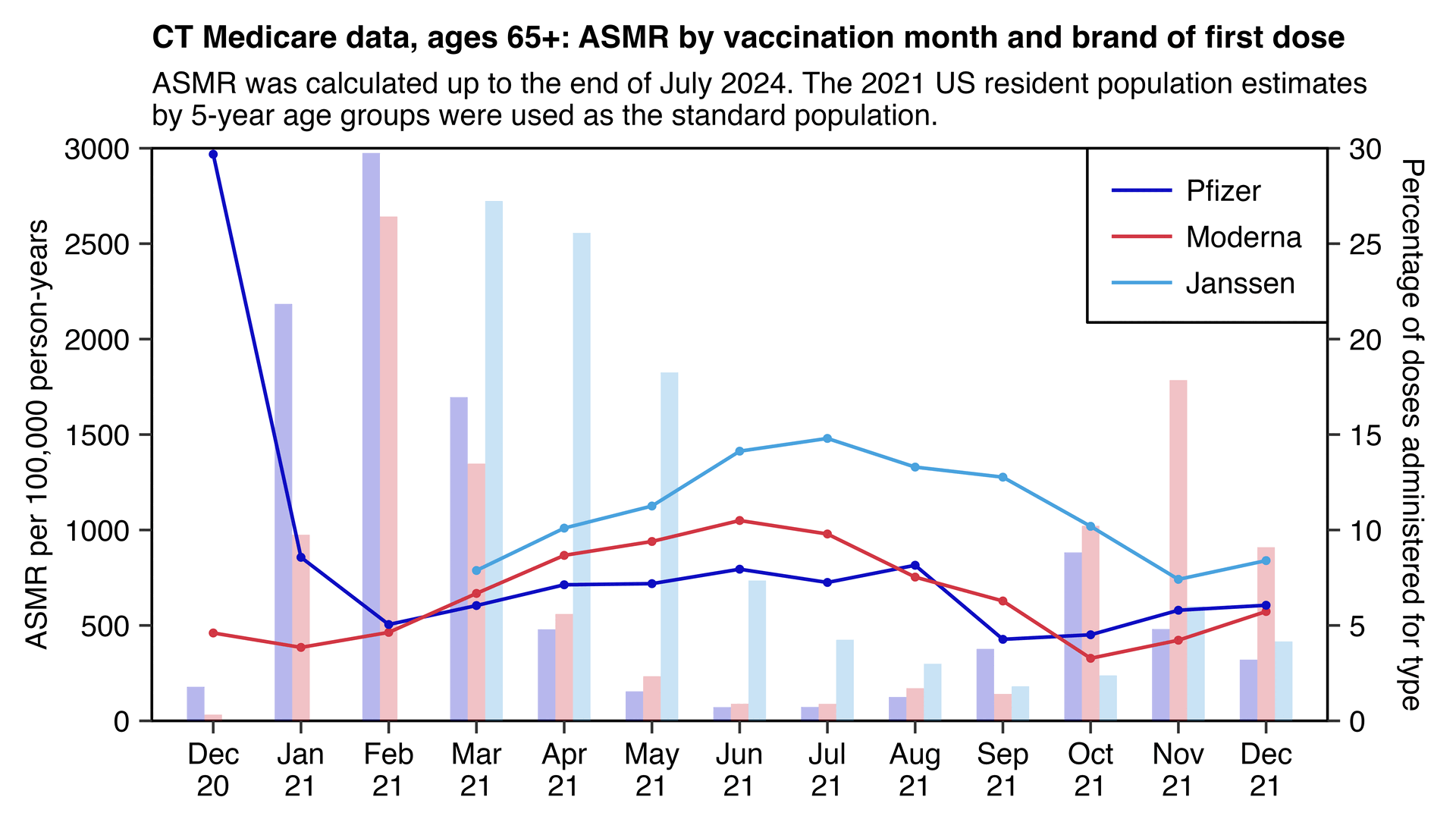 labs(title="CT Medicare data, ages 65+: ASMR by vaccination month and brand of first dose",subtitle=paste0("ASMR was calculated by 5-year age groups so that the 2021 US resident population estimates were used as the standard population.")|>stringr::str_wrap(90),x=NULL,y="ASMR per 100,000 person-years")+