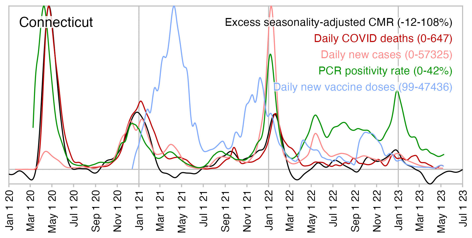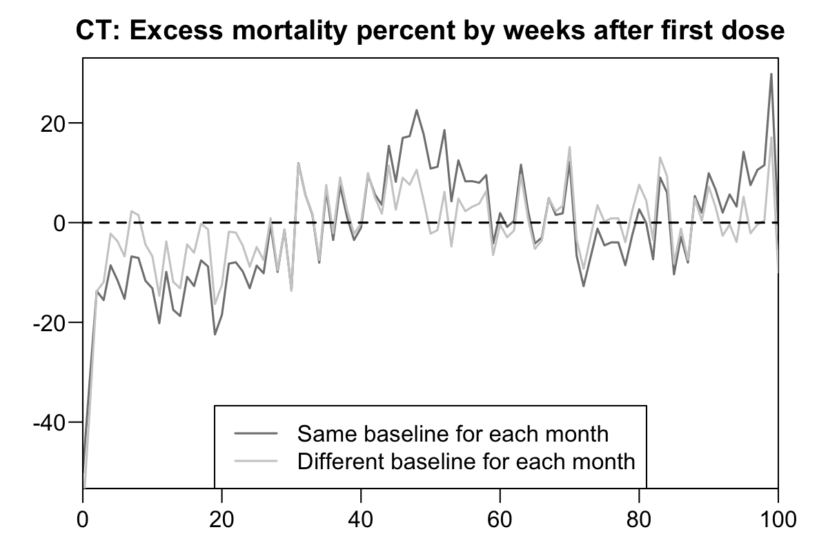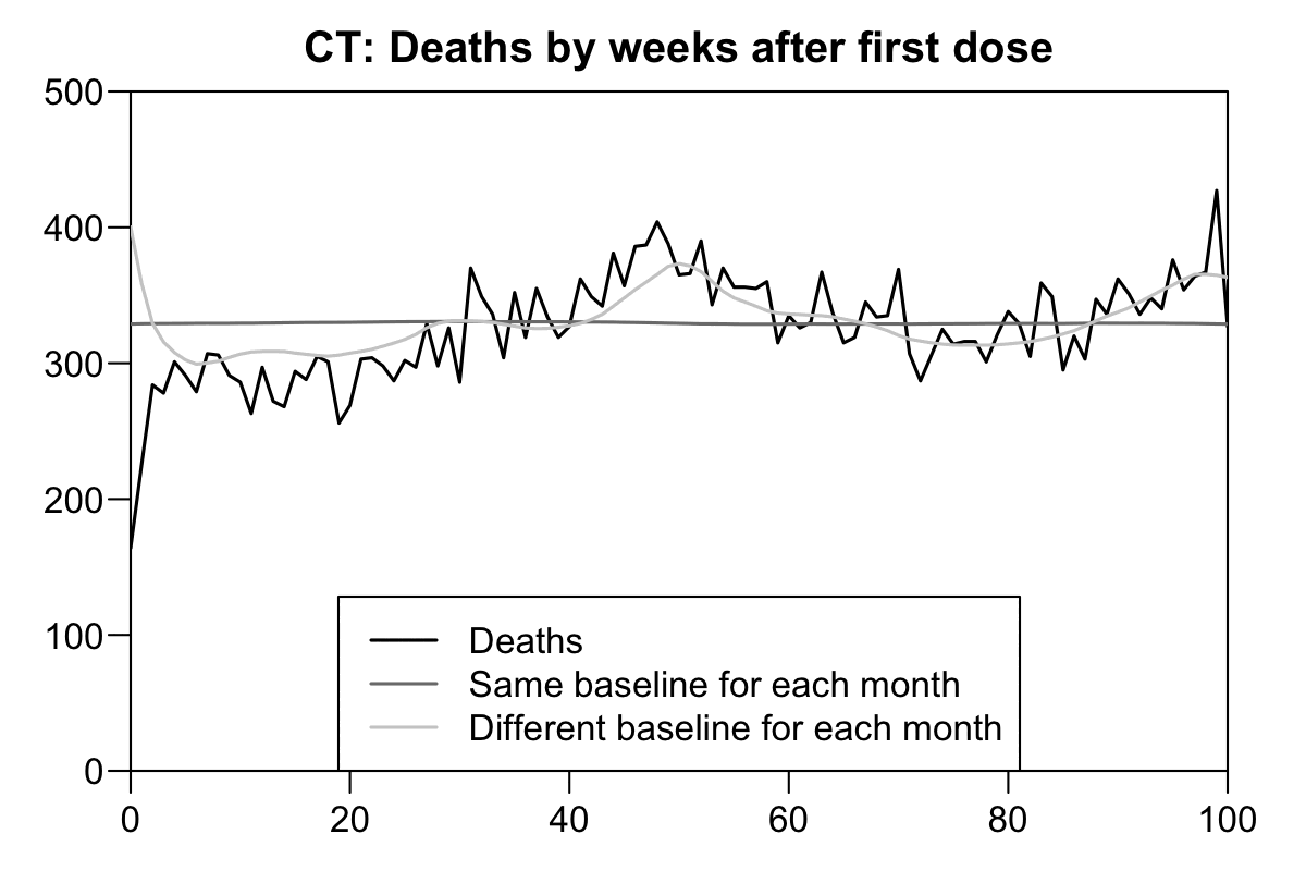 A similar effect can be seen in the plot below which shows deaths by weeks since the first dose in the new Connecticut Medicare data and in the Czech record-level data, because in both Connecticut and the Czech Republic many people got first doses at a time when there was a sharply decreasing background mortality rate because a COVID wave was passing by. But in New Zealand the period after vaccination when there was reduced mortality seems to last longer, because New Zealand had not yet been hit by COVID in 2021 when first dose was rolled out: