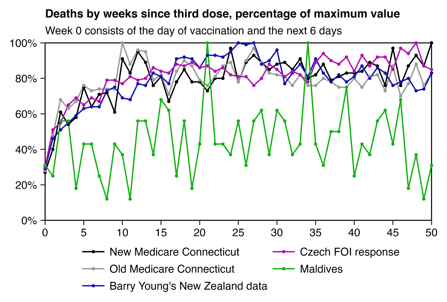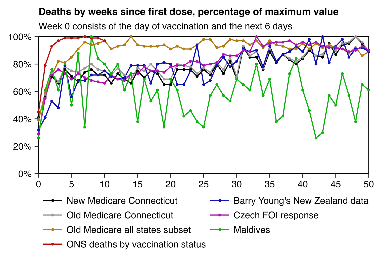 However there is also a very low number of deaths in the first few weeks after vaccination in the old record-level datasets that Kirsch has published from New Zealand, the Maldives, and the United States. The datasets show the date of vaccination and date of death of individual people, so you can calculate the number of deaths by weeks since vaccination manually so that you know for sure that there is no trick used where vaccinated people would be classified as unvaccinated for 1 to 3 weeks after vaccination. I have pointed it out to Neil and Fenton and I have tried to get them to look at Kirsch's record-level datasets, but I don't think I have been successful.