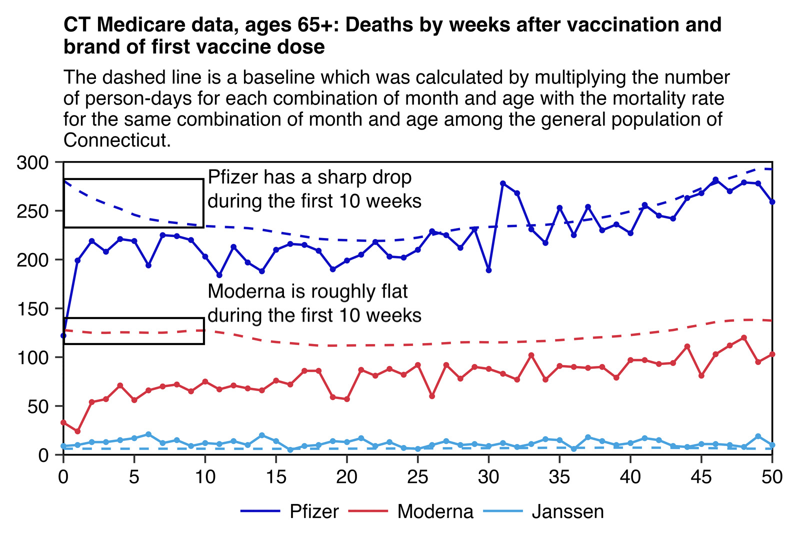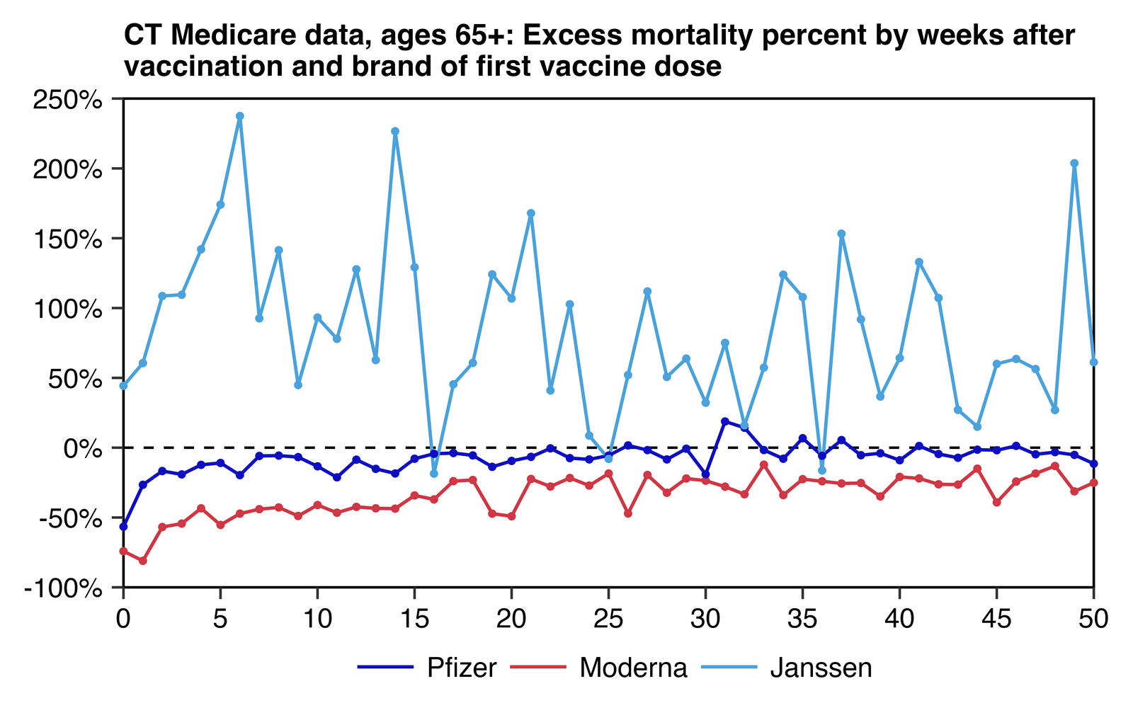 In the new Connecticut data Kirsch now got about 10% higher mortality rate for Pfizer than Moderna, but he again attributed the difference to a difference in vaccine safety, even though this time Pfizer got higher mortality rates than Moderna. When someone asked Kirsch to explain why his results were now different to the Czech data, Kirsch replied: "it's a QA issue. Moderna is more deadly, but the batches are even a greater problem." [https://kirschsubstack.com/p/i-have-been-fully-vindicated-by-the/comment/70688177]