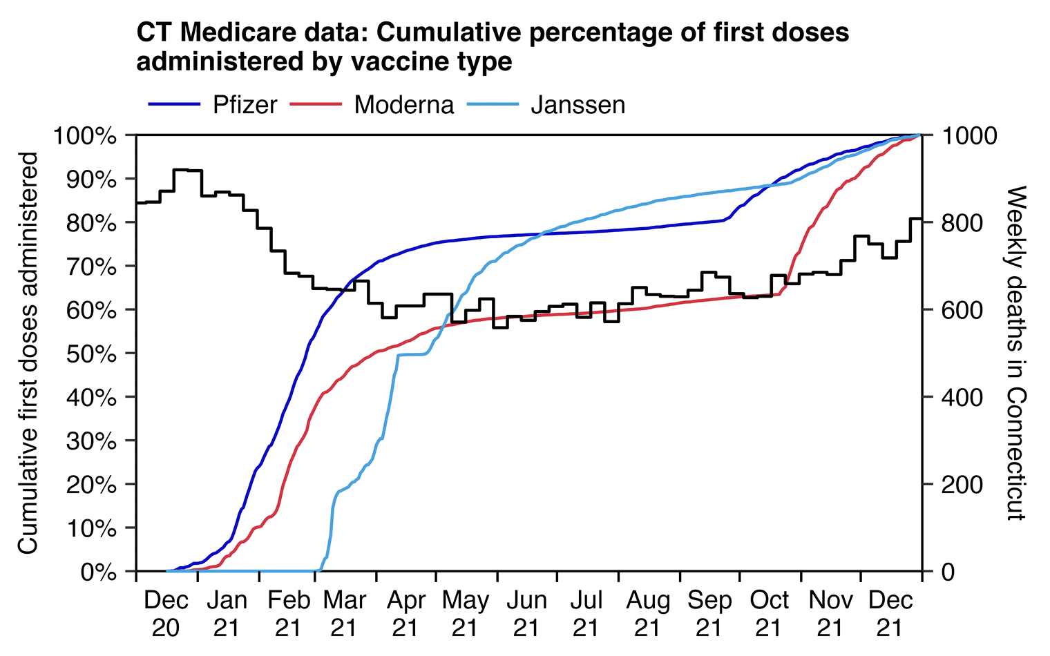 In September 2024 Steve Kirsch published a spreadsheet for data from Connecticut that contains rows for a total of about 500,000 people who were enrolled on Medicare: https://kirschsubstack.com/p/i-have-been-fully-vindicated-by-the. The file has columns for sex, date of death, vaccine brand, the dates of the first 3 vaccine doses, and age at the time of the first dose. The vaccine brand is presumably the brand of the first dose.