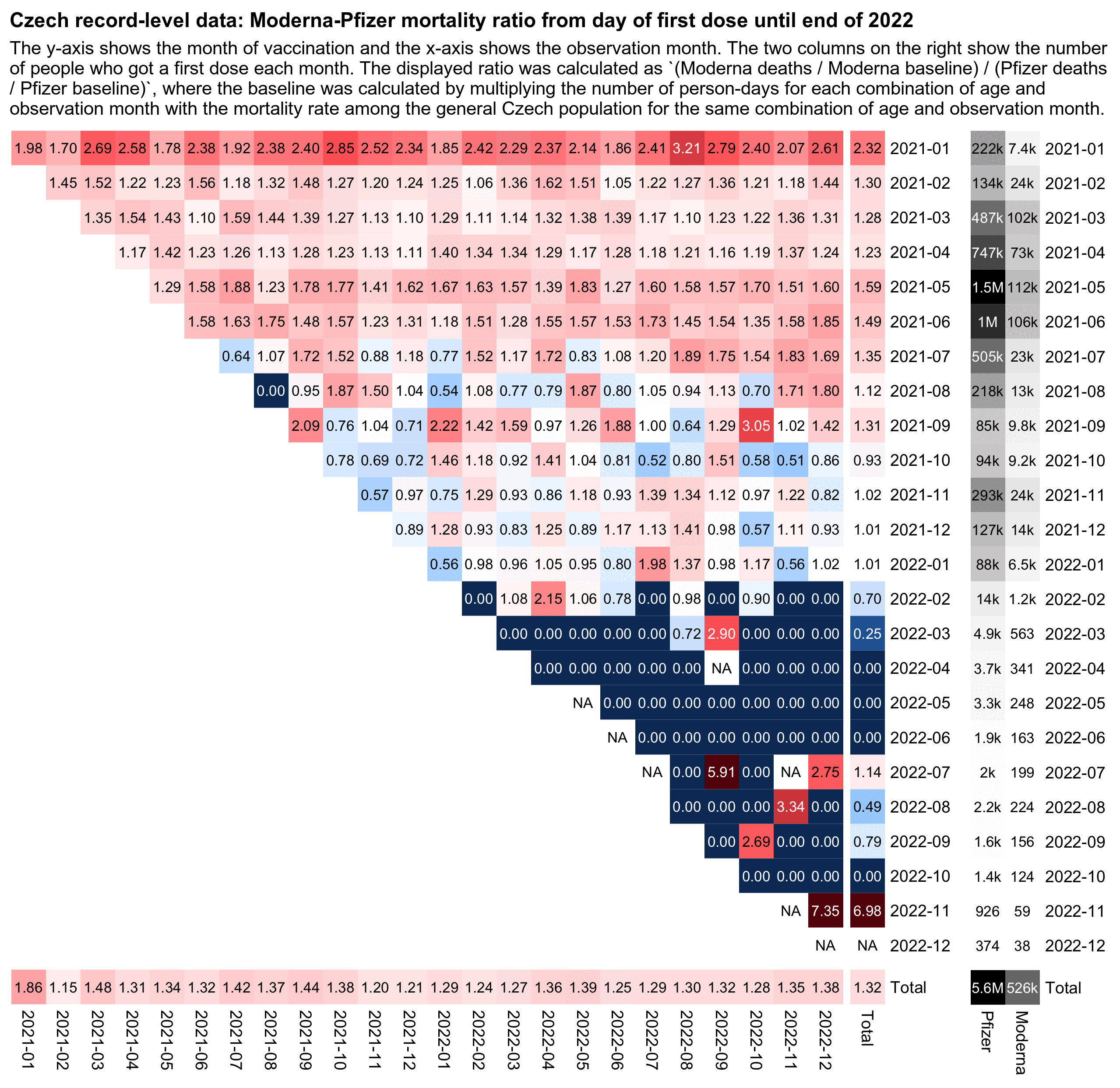 In Kirsch's analysis of the Czech record-level data, his main argument why Moderna vaccinese were unsafe than Pfizer vaccines was that when he calculated age-specific mortality rates during the first year from the first dose, Moderna got about 1.3 higher mortality rate than Pfizer across various age groups. However I pointed out to him that it might have been due to some confounders he didn't adjust for in his analysis. In the plot below where I calculated an age-normalized Moderna-Pfizer mortality ratio in the Czech data, my total ratio for all months of vaccination aggregated together was about 1.3 like in Kirsch's analysis, but my ratio fell close to 1.0 among people who were vaccinated in the fourth quarter of 2021: [czech2.html#Triangle_plot_of_Moderna_Pfizer_ratio]