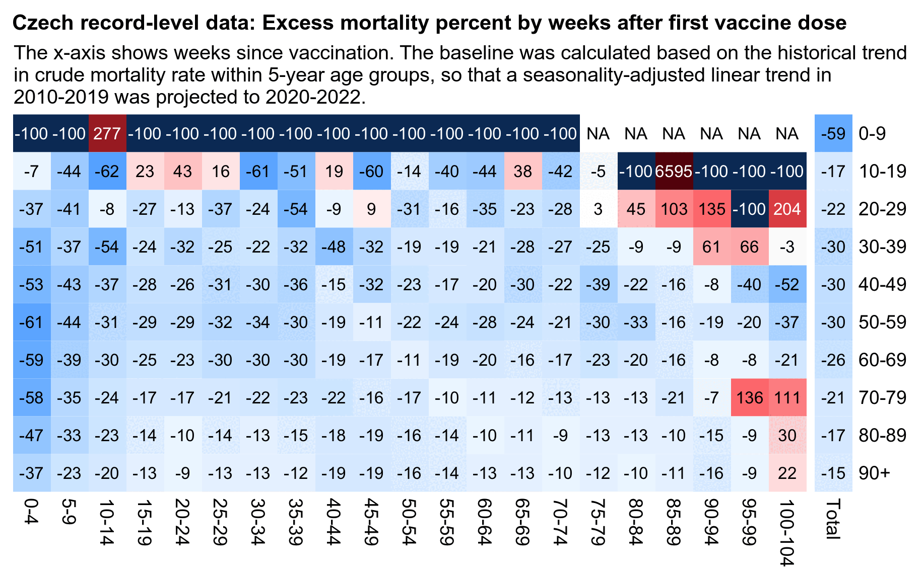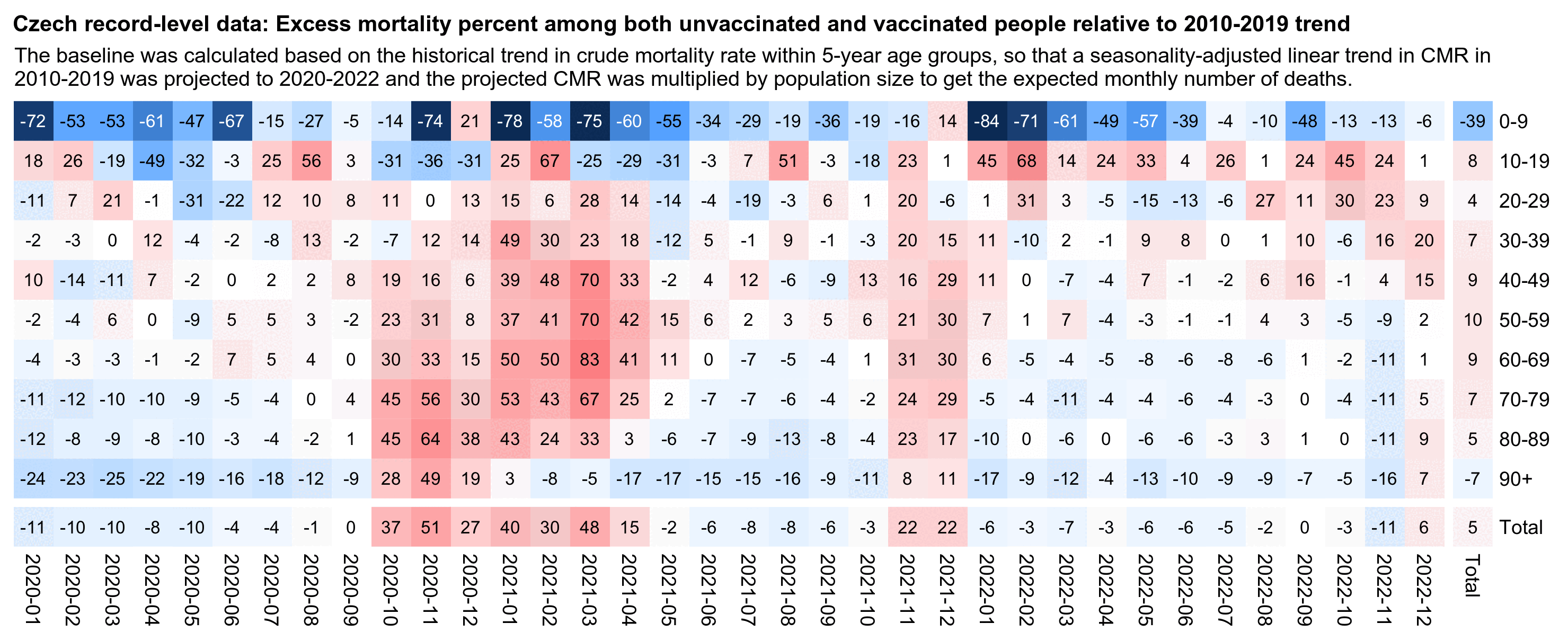 In the code below I calculated a linear trend in mortality rate in 2013-2019 for each single year of age, I projected the trend to 2021-2022, and I multiplied the projected mortality rates by the population estimates for each age in 2021 and 2022 to get the expected number of deaths. But it gave me a total excess mortality of only about 17% in 2021-2022, which is less than half of Kirsch's 46% increase: