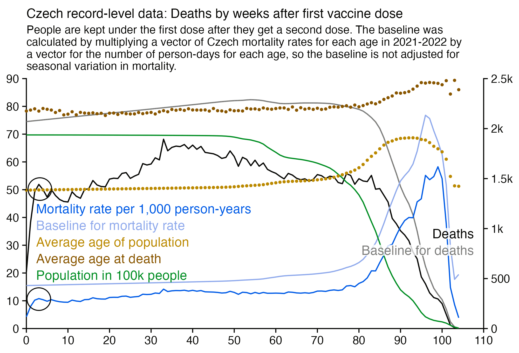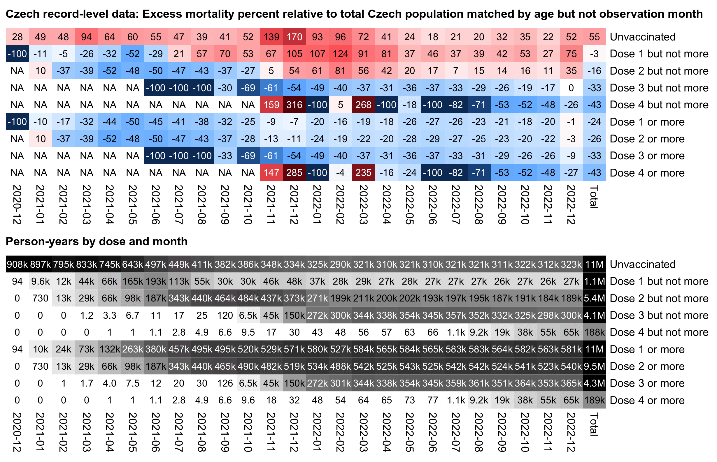 The following code generates a file for deaths and person-days grouped by ongoing month, month of vaccination, weeks since vaccination, single year of age, dose number, and vaccine type.