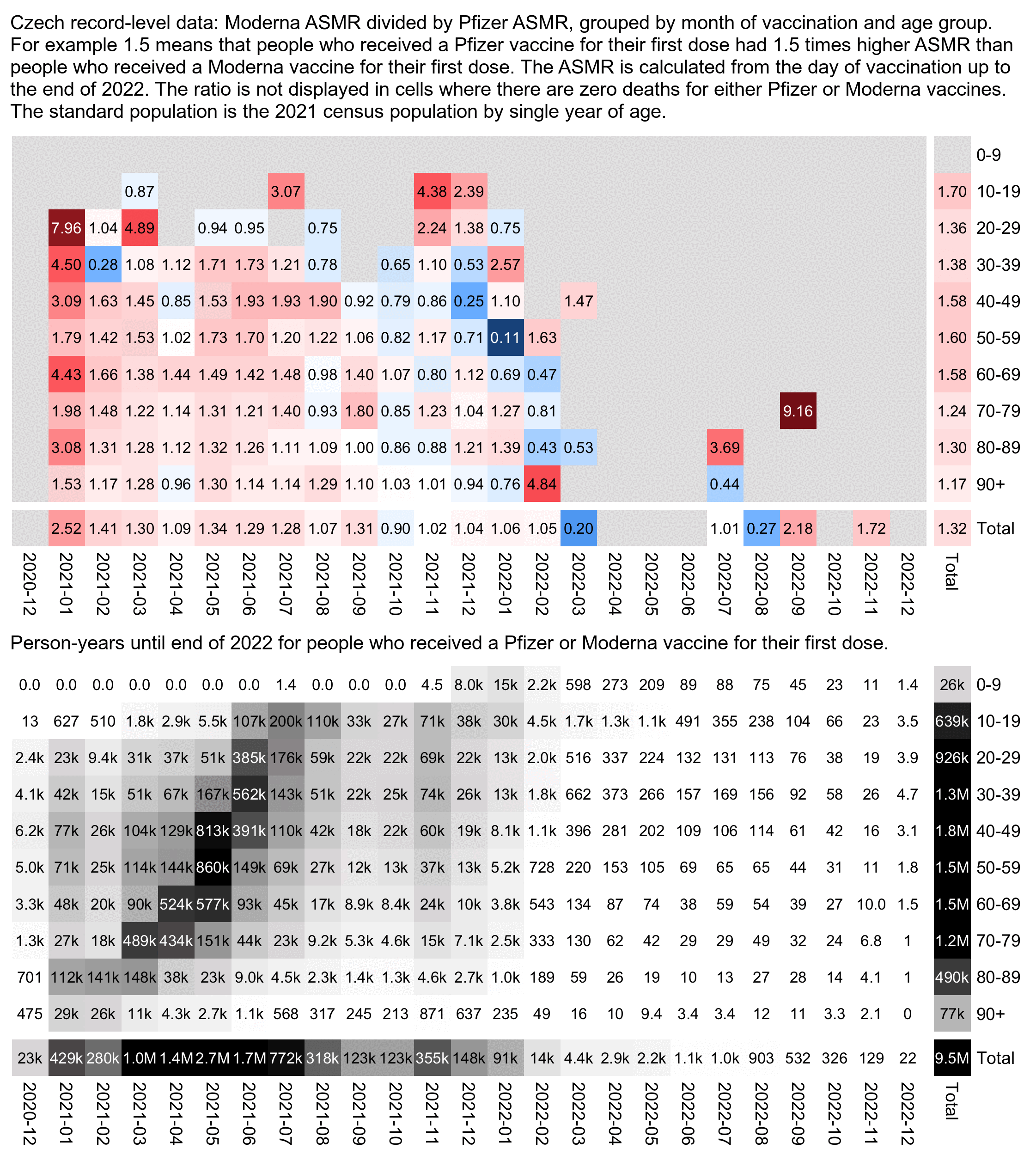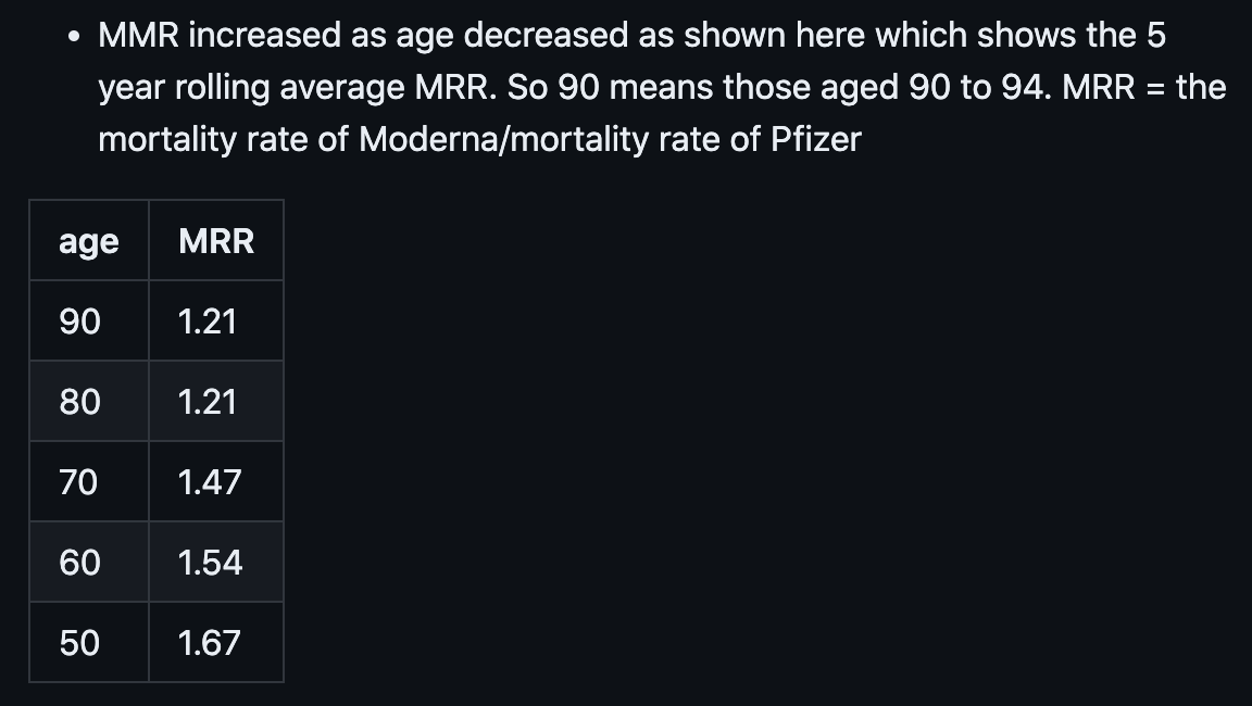 There is a really interesting simpson's paradox due to ratios. For each individual age, the MRR (mortality rate ratio) rarely go above 2.25. Yet when you divide the CMR for Moderna/Pfizer, you get 2.25.