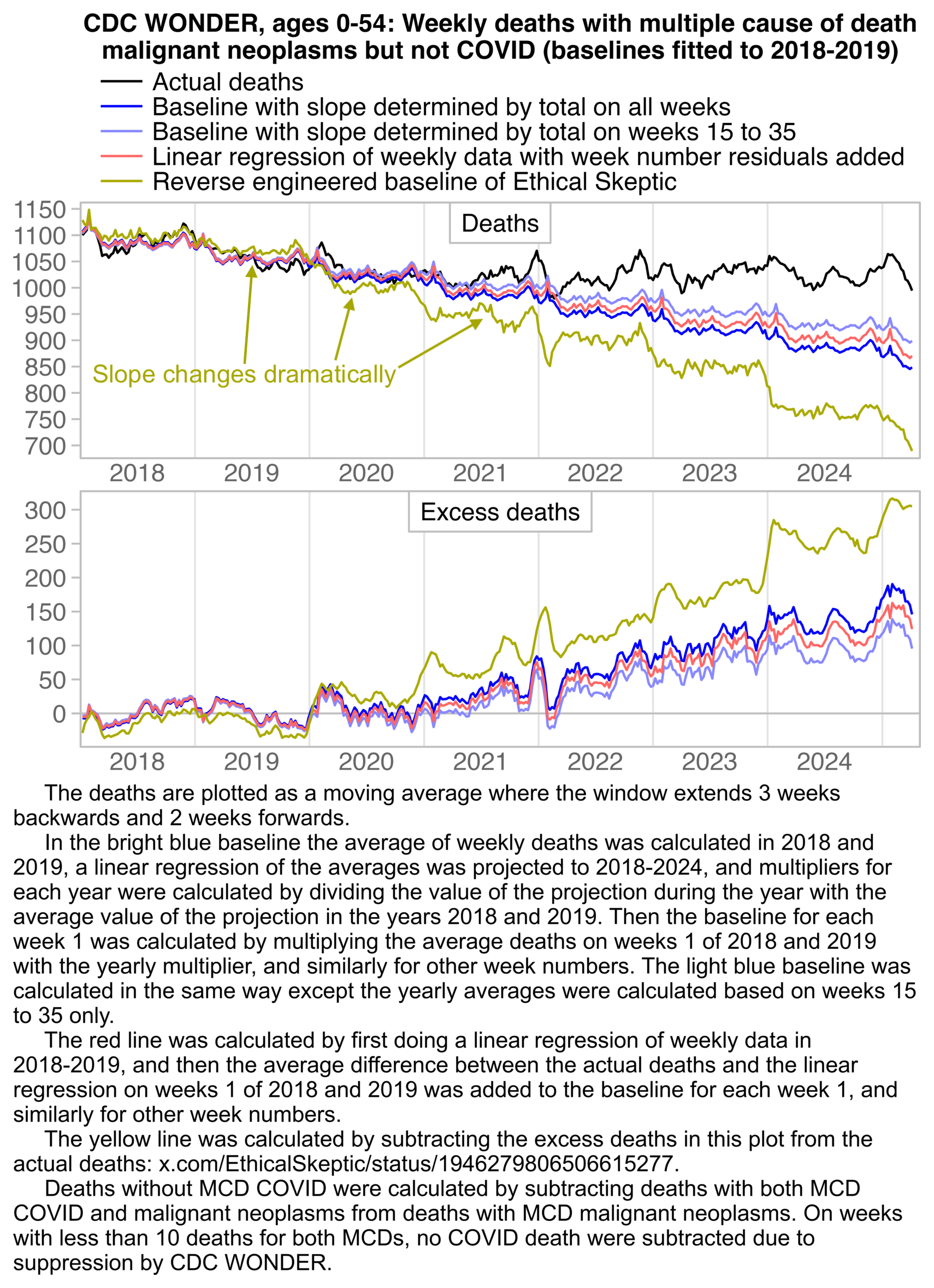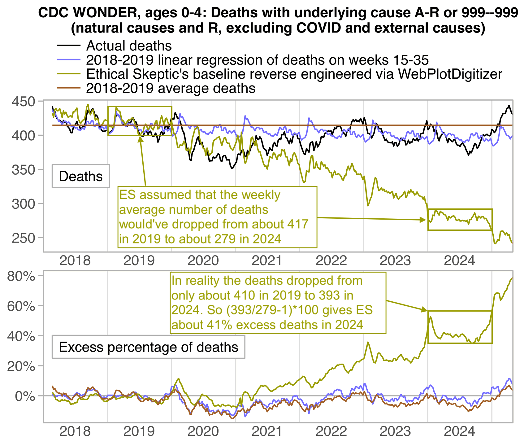 lab=c("Actual deaths","2018-2019 linear regression of deaths on weeks 15-35","Ethical Skeptic's baseline reverse engineered via WebPlotDigitizer","2018-2019 average deaths")