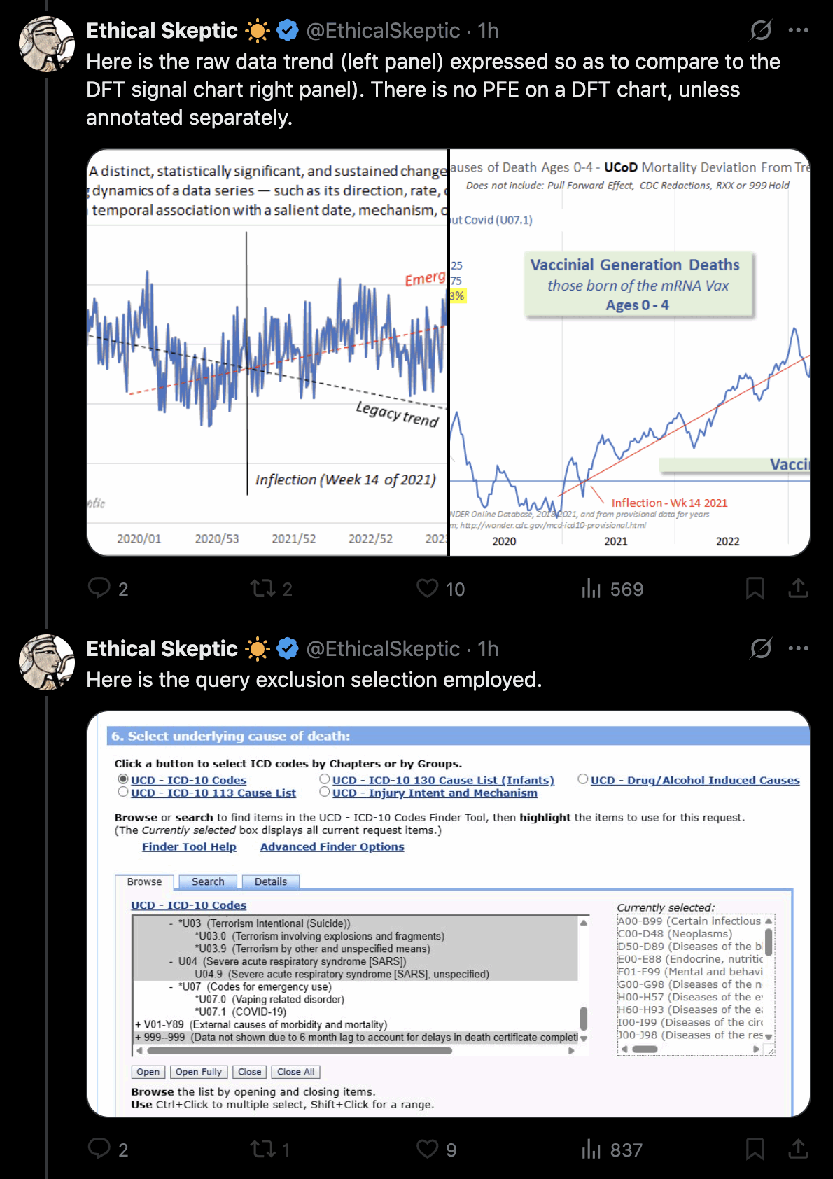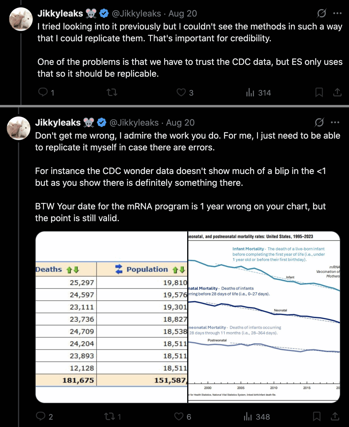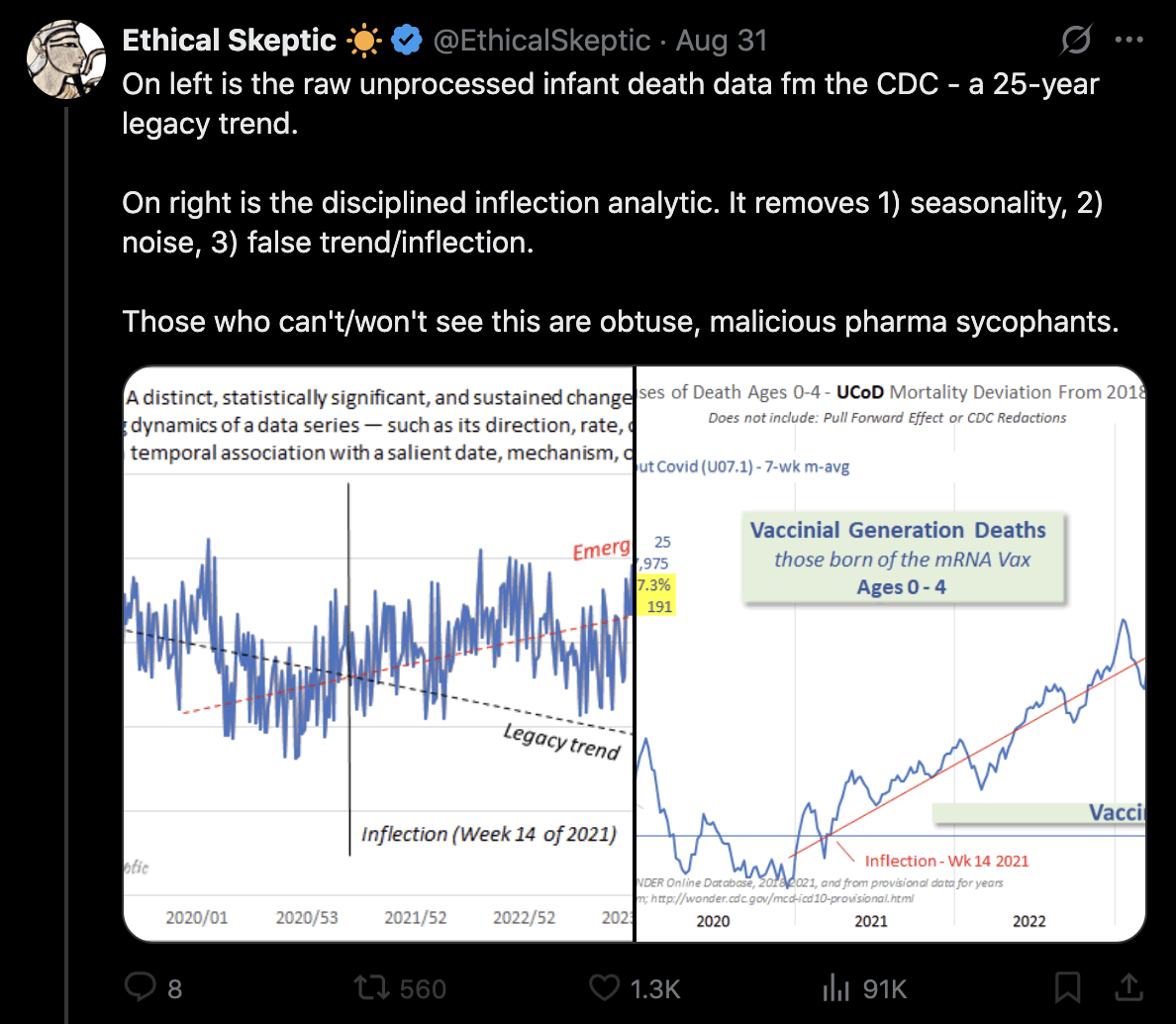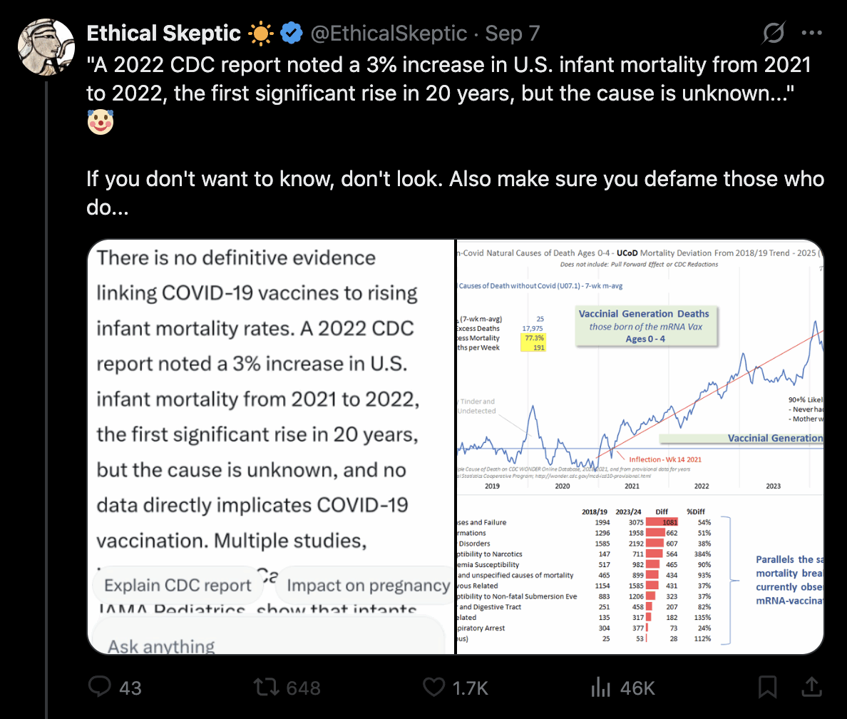 Ethical Skeptic posted the plots below and wrote: "You completely ignored the 2017 downturn in birth rate (left panel) - which is CONFIRMED by the weekly Wonder data (right panel)." [https://x.com/EthicalSkeptic/status/1970833812050325505]