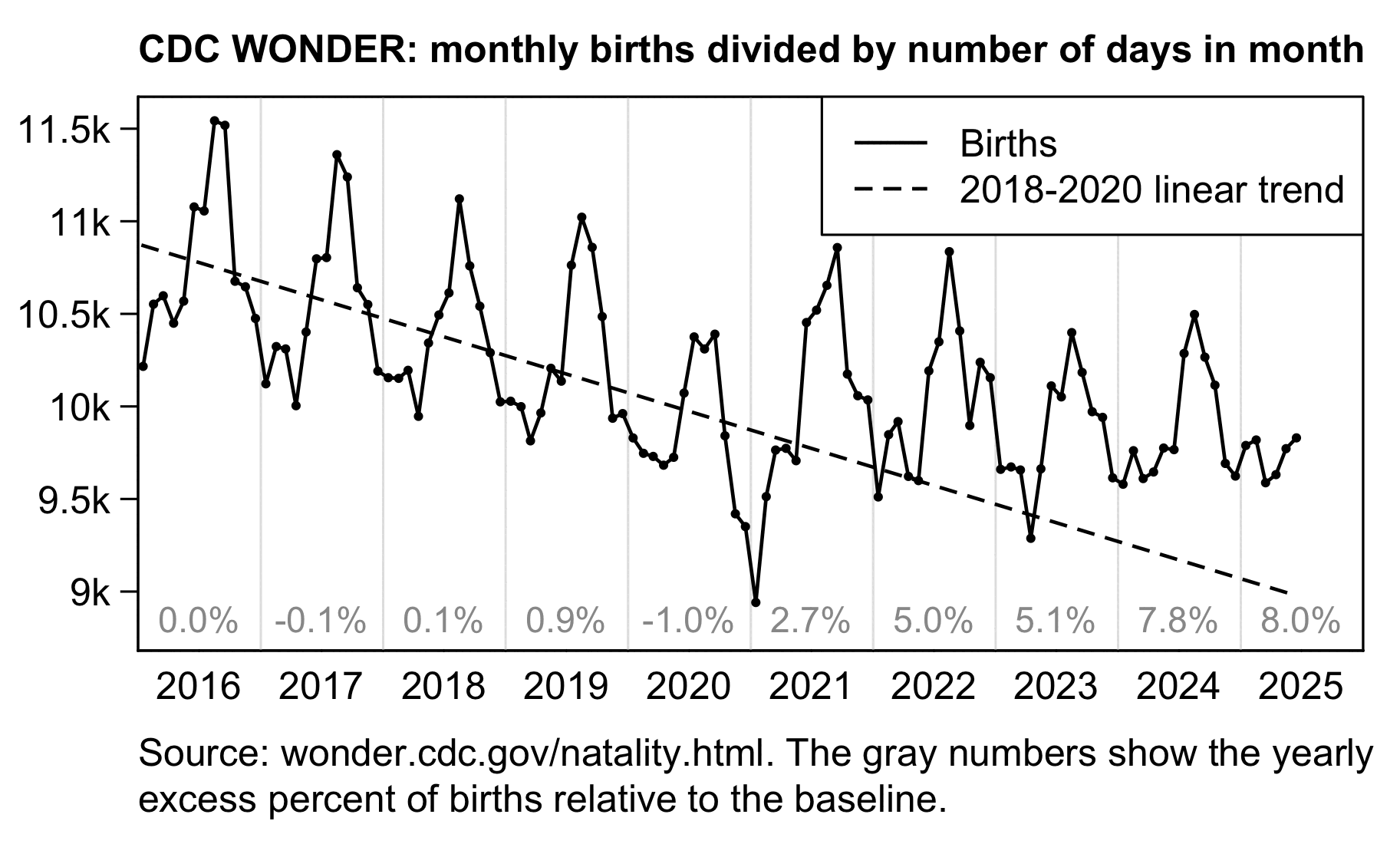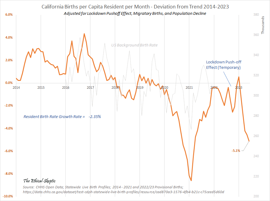 His orange line shows excess births relative to a 2014-2023 trend in California. It's confusing how he didn't plot the baseline and actual births but only the excess births. In the years 2014-2016 there was in fact a fairly high number of births relative to the years before 2014 or the years after 2016, but the drop in births after 2016 wasn't steep enough to justify the extremely steep "legacy trend".