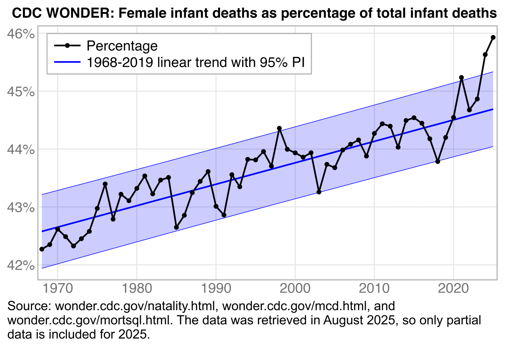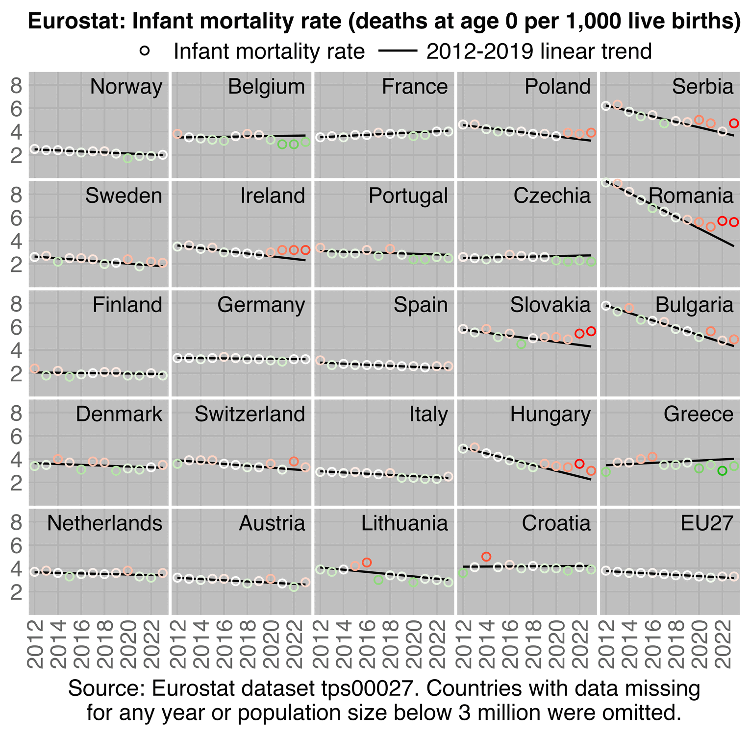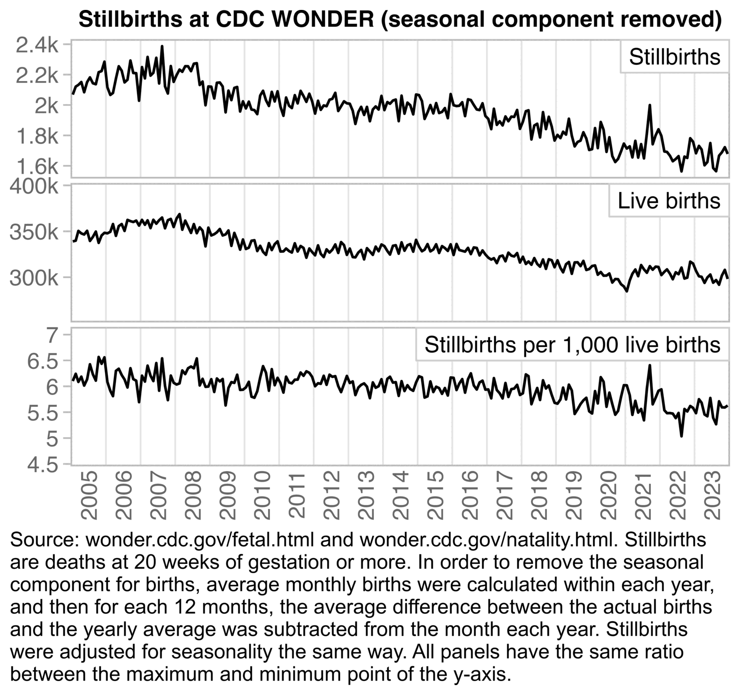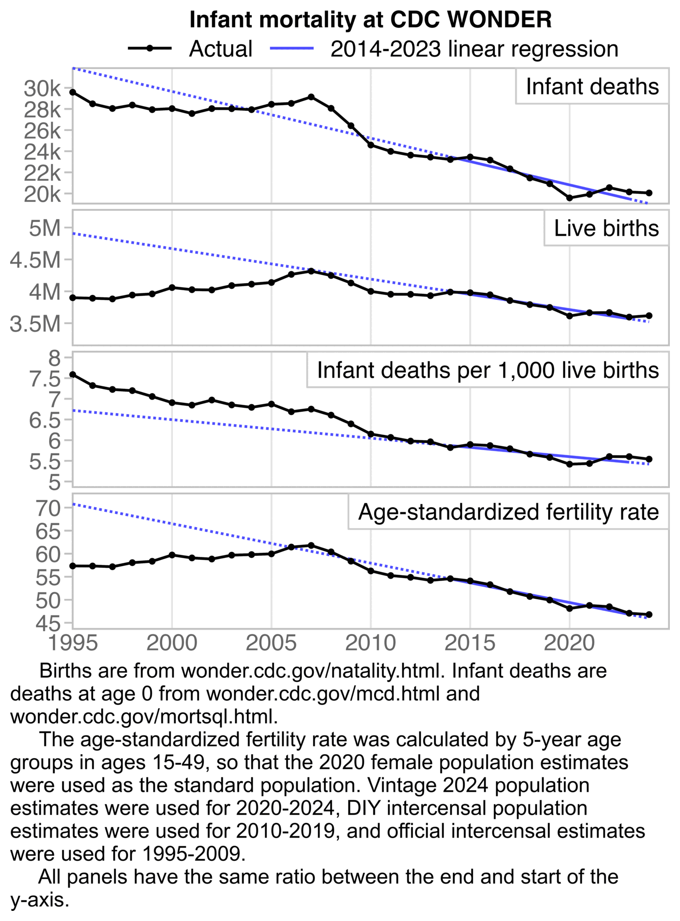 But anyway, regardless of whether you look at infant deaths, live births, infant mortality rate, or age-standardized fertility rate, in the plot above the pre-COVID trend is not as steep as a 2018-2020 trend, because there was an unusually low number of both births and infant deaths in 2020. So 2020 should not be included in the fitting period of the baseline.