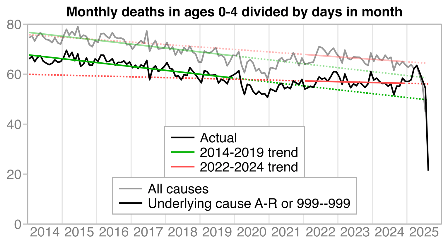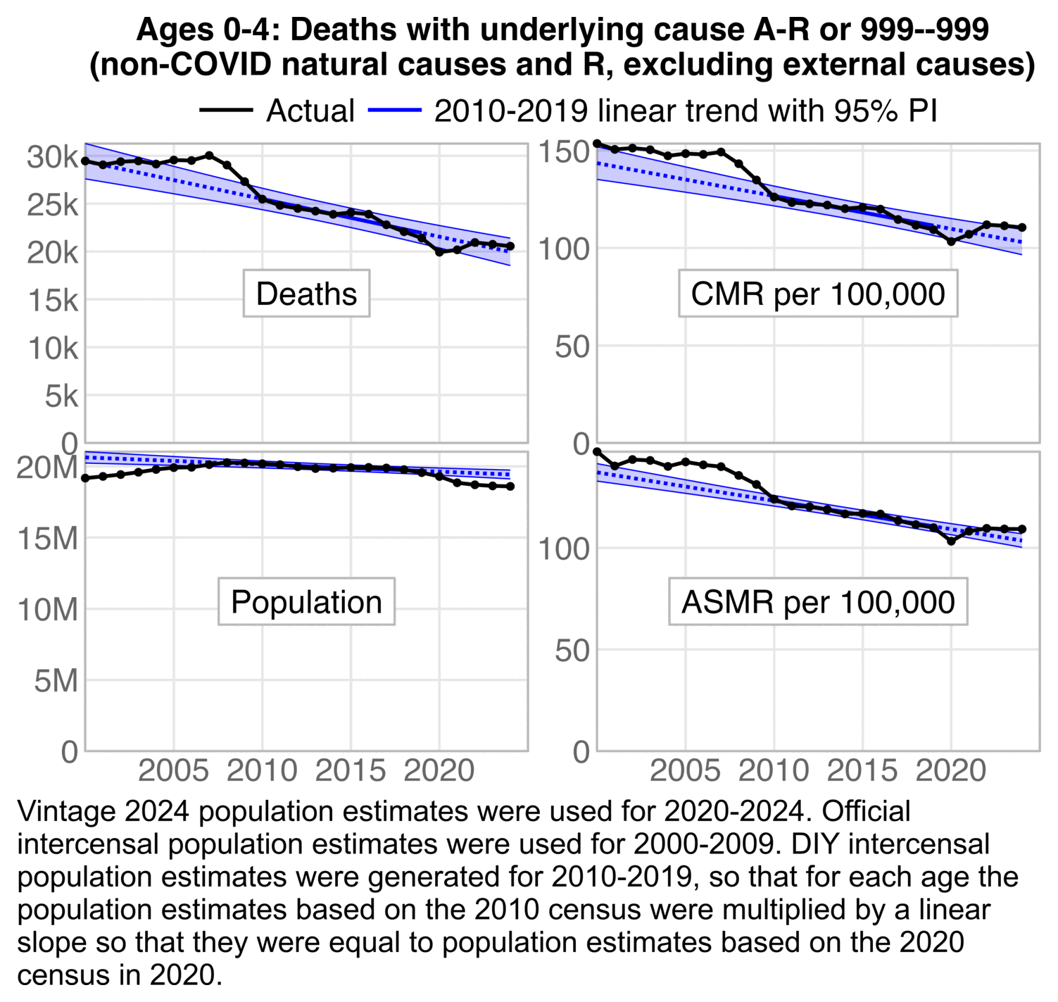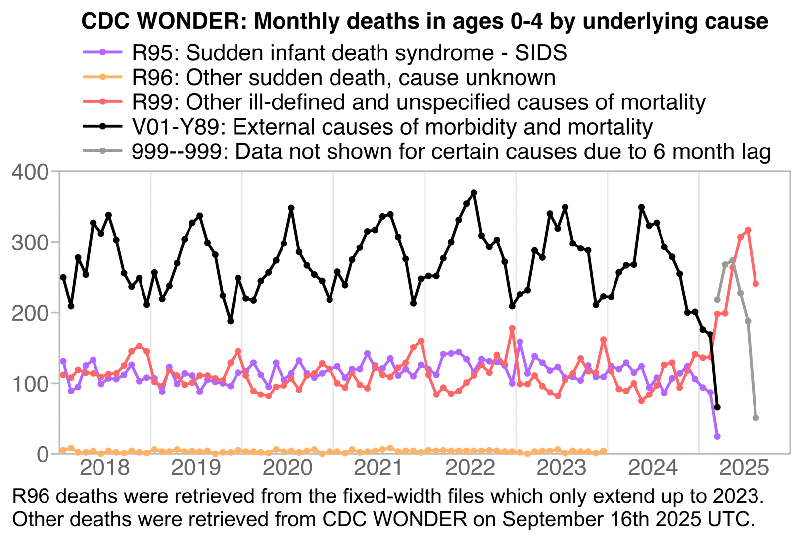 labs(x=NULL,y=NULL,title="CDC WONDER, ages 0-4: Deaths with underlying cause A-R or 999--999\n(natural causes and R, excluding COVID and external causes)")+