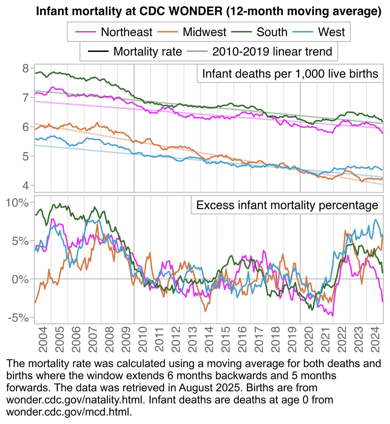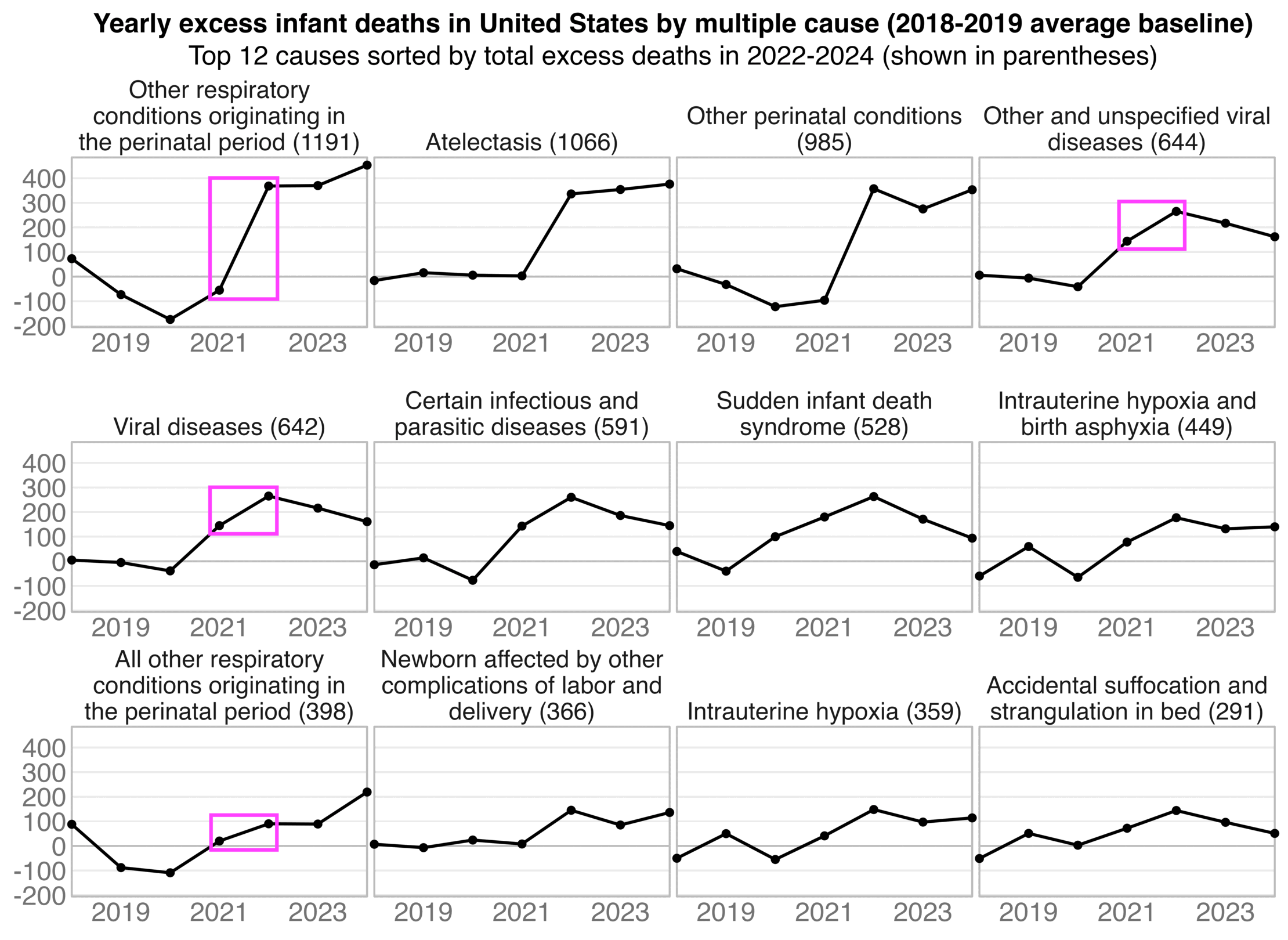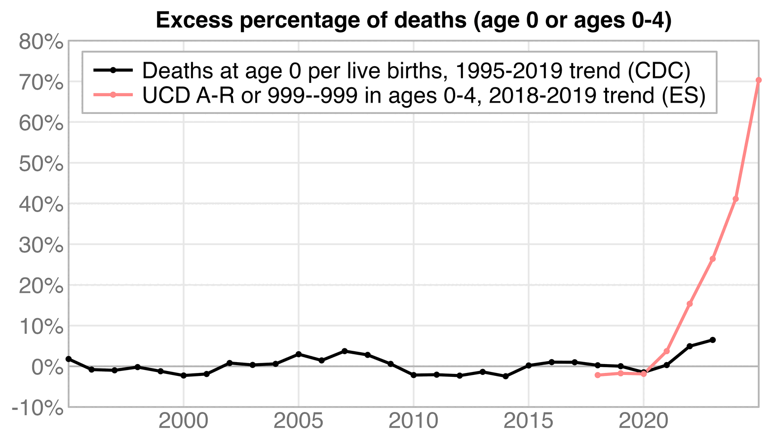 labs(x=NULL,y=NULL,title="CDC WONDER, ages 0-4: Deaths with underlying cause A-R or 999--999\n(natural causes and R, excluding COVID and external causes)")+