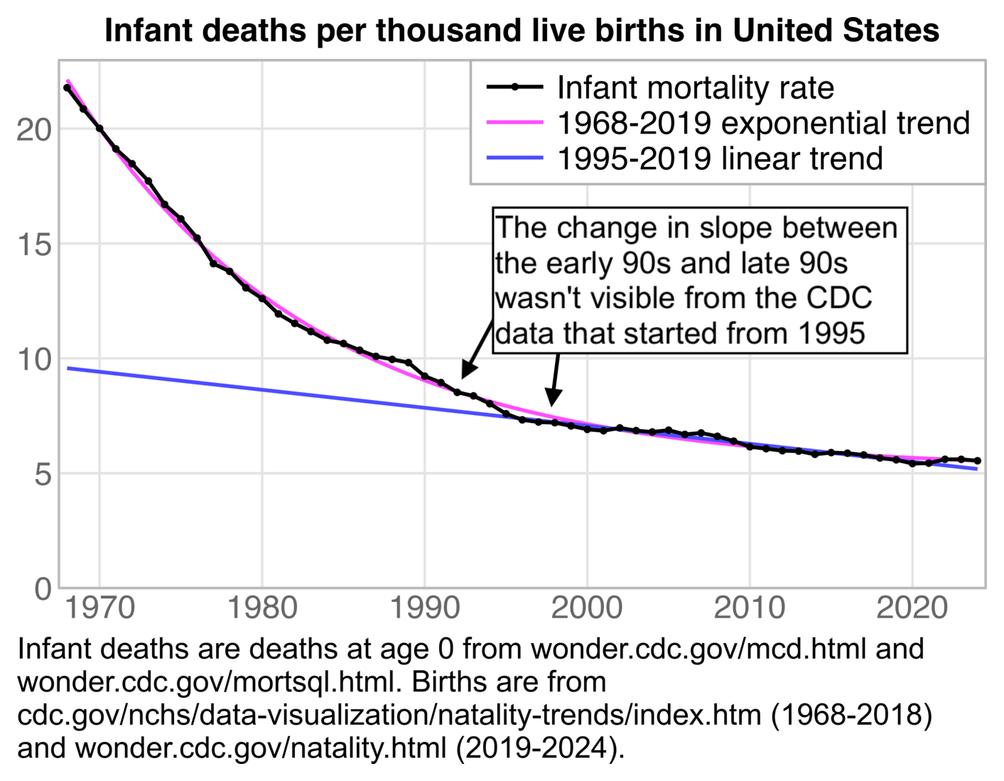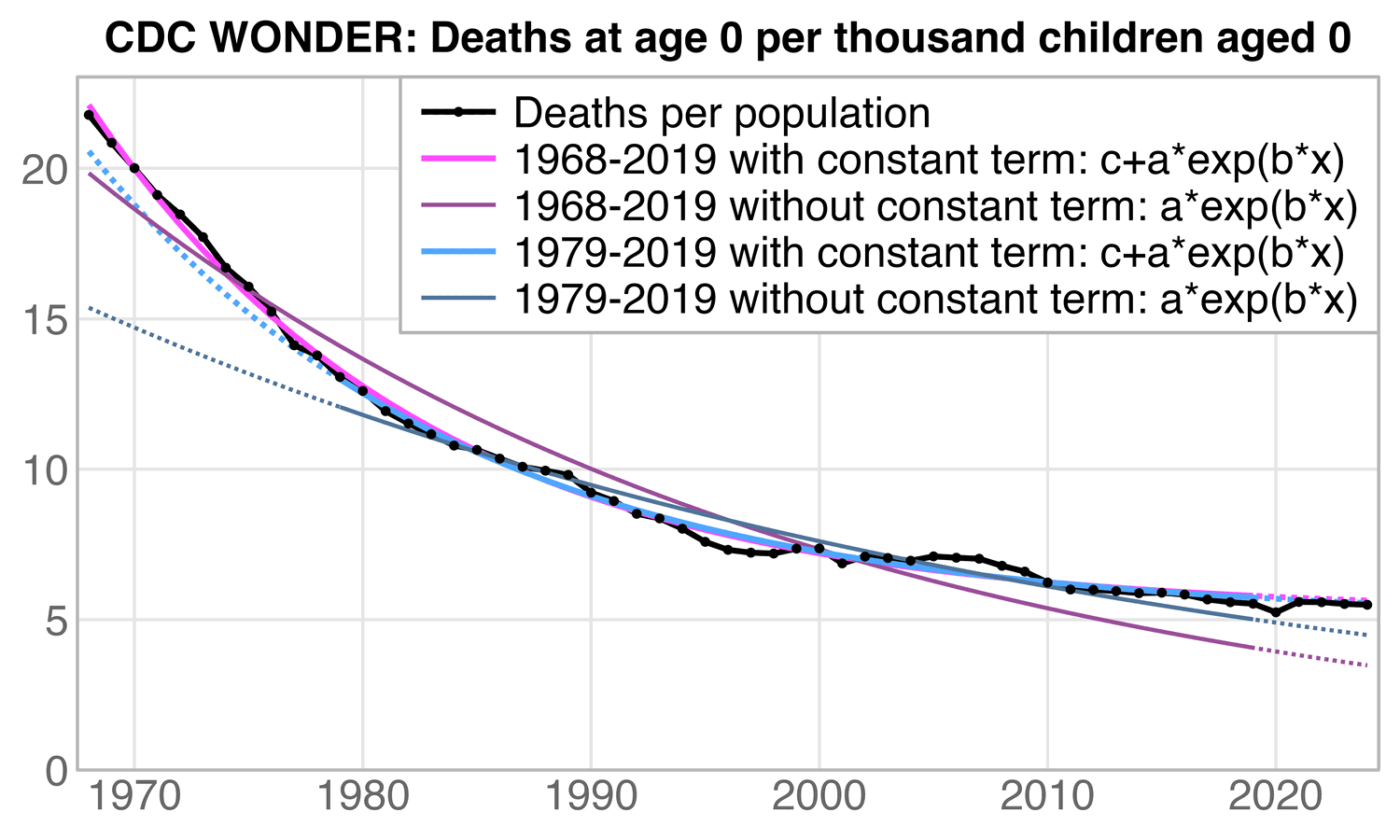 # from cdc.gov/nchs/data/nvsr/nvsr74/nvsr74-07.pdf#page=8 d=CJ(year=1995:2023) d$rate=c(757,730,721,719,704,689,684,695,684,678,686,668,675,661,639,614,607,598,596,582,590,587,579,567,558,542,544,561,561)/100 d$trend=predict(lm(rate~year,d[year%in%2004:2019]),d) d[,(1-trend[year==2022]/trend[year==2004])/18] # 0.01282821 (about 1.3%)