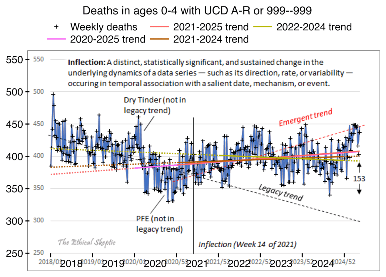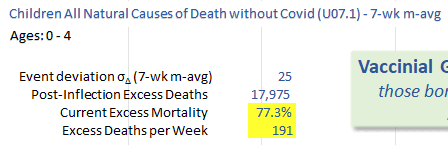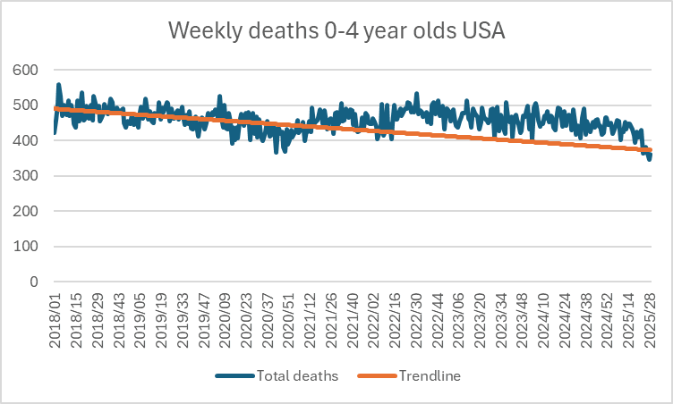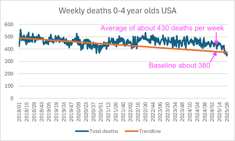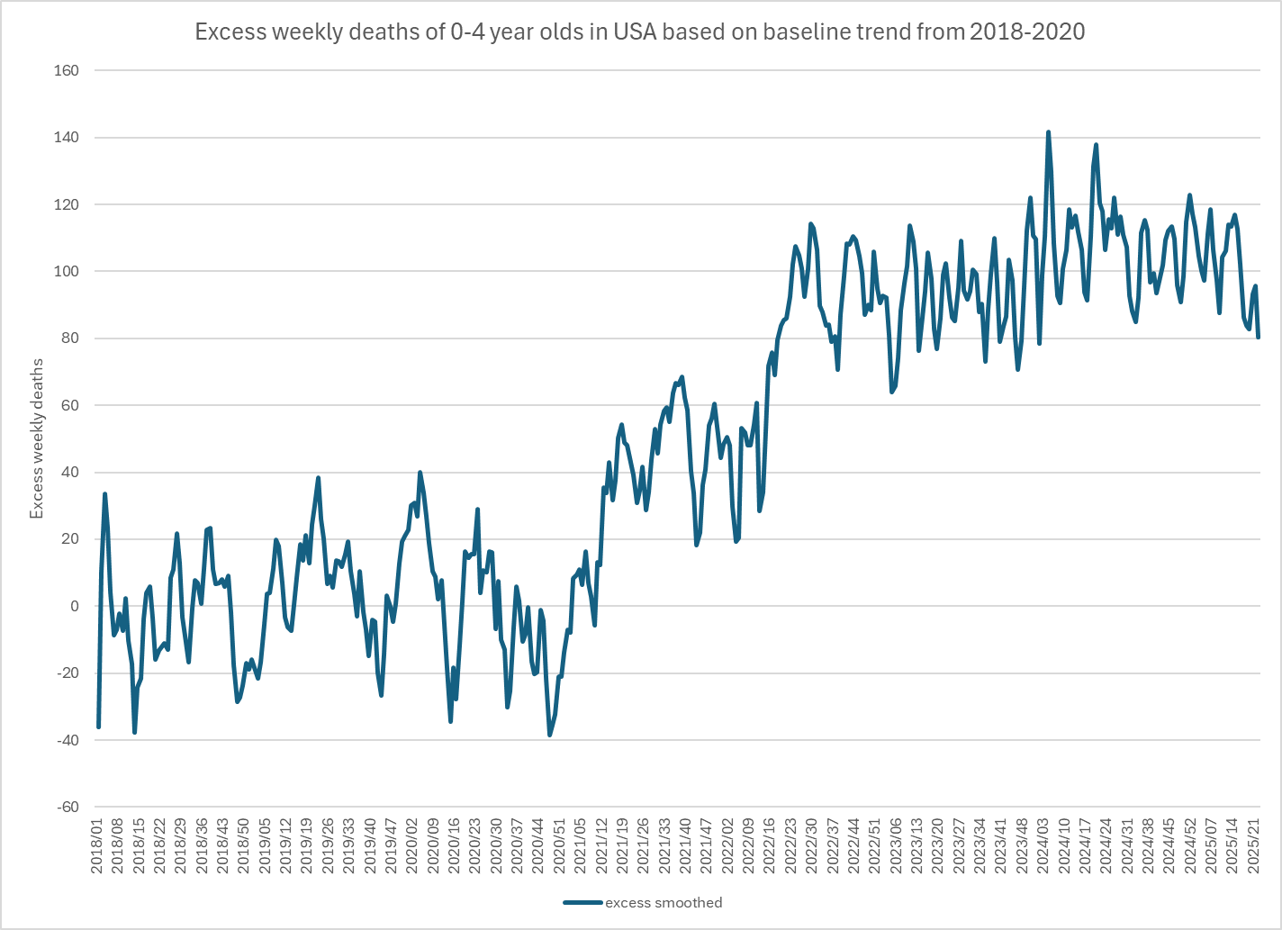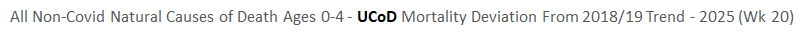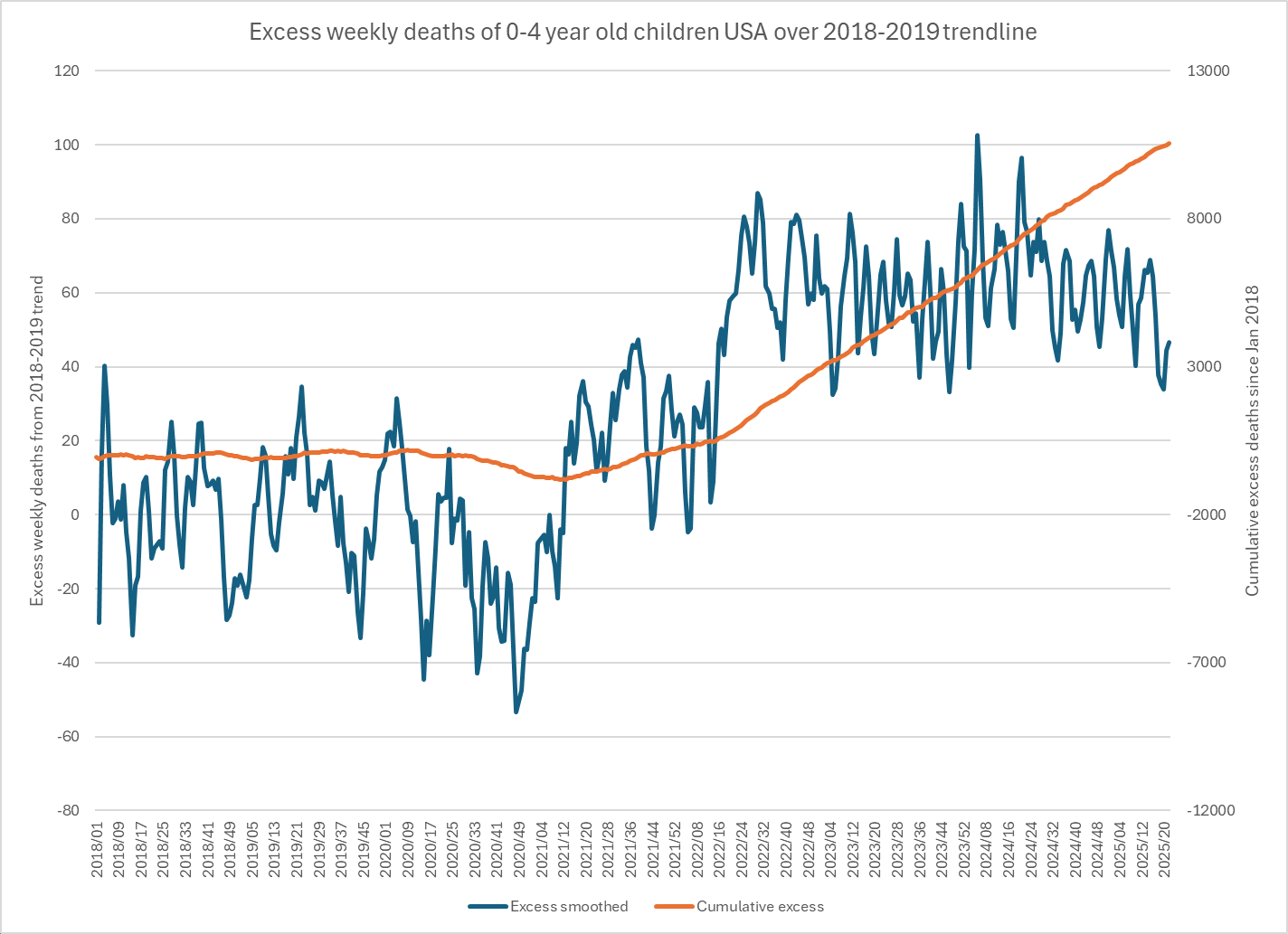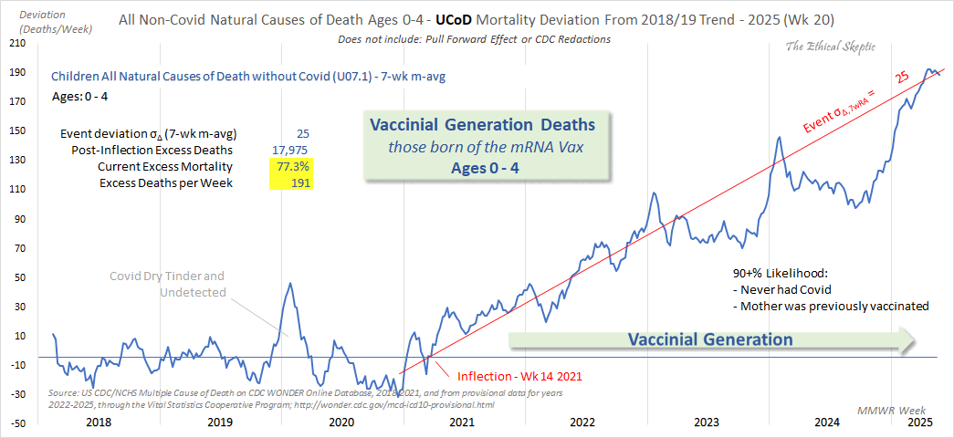 Ethical Skeptic posted this plot of weekly deaths from non-COVID natural causes in ages 0-4, where he got about 77% excess deaths on weeks 14-20 of 2025: [https://web.archive.org/web/20250903223011/https://theethicalskeptic.com/2025/08/19/houston-we-have-another-problem/]