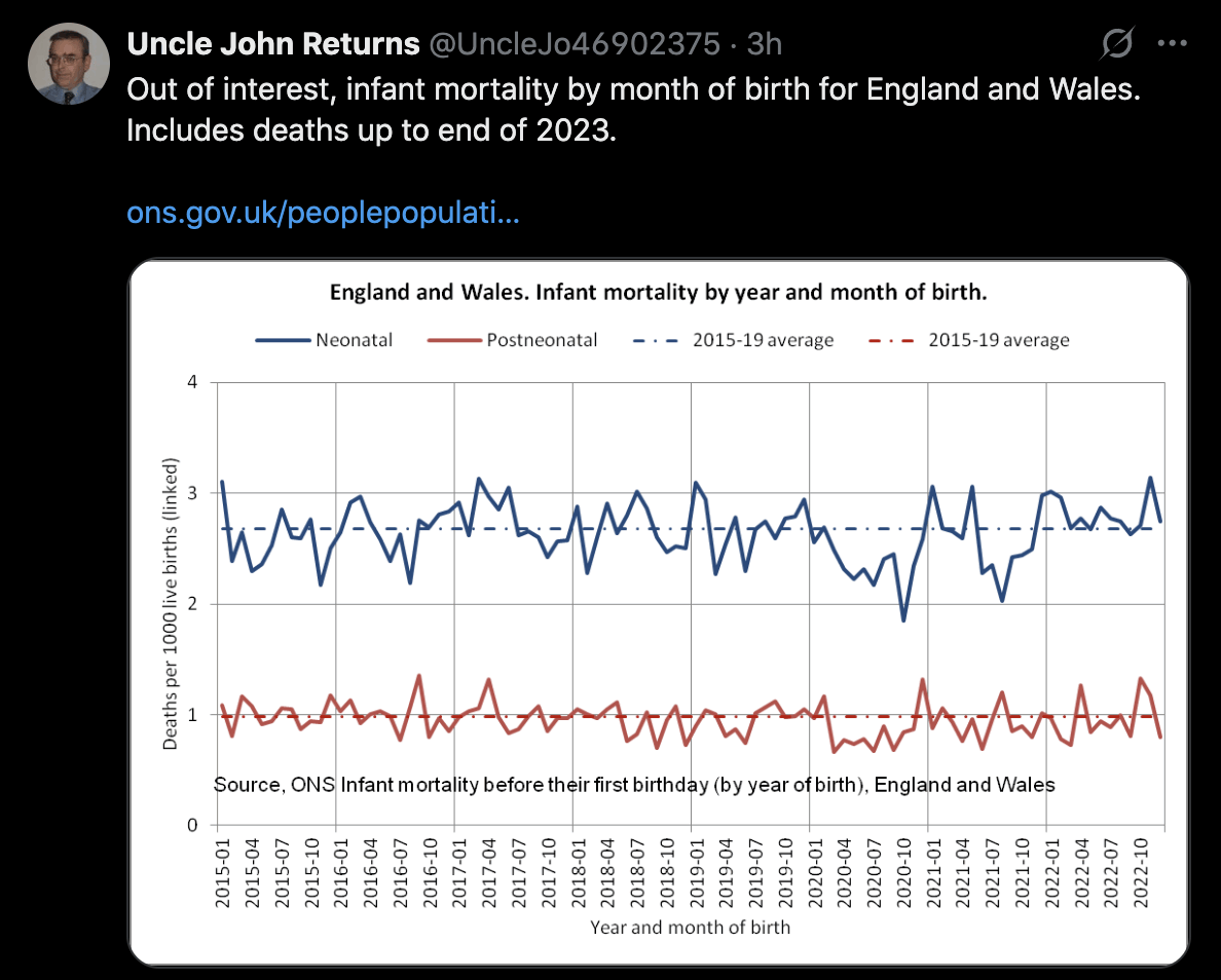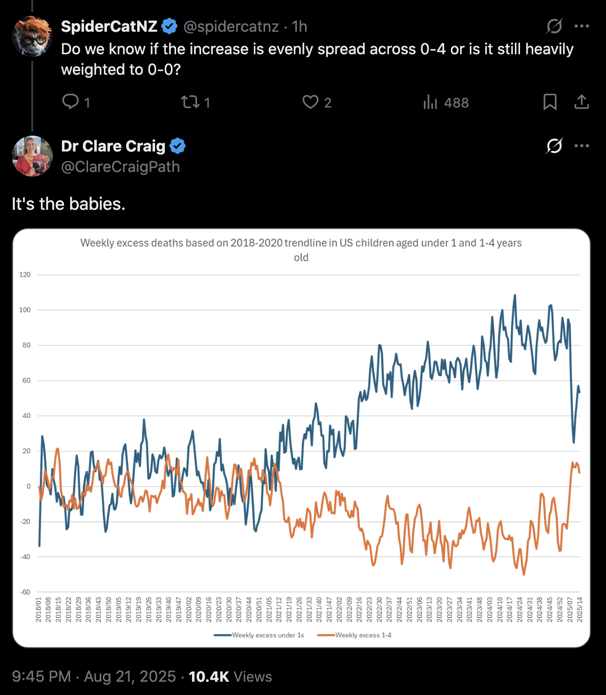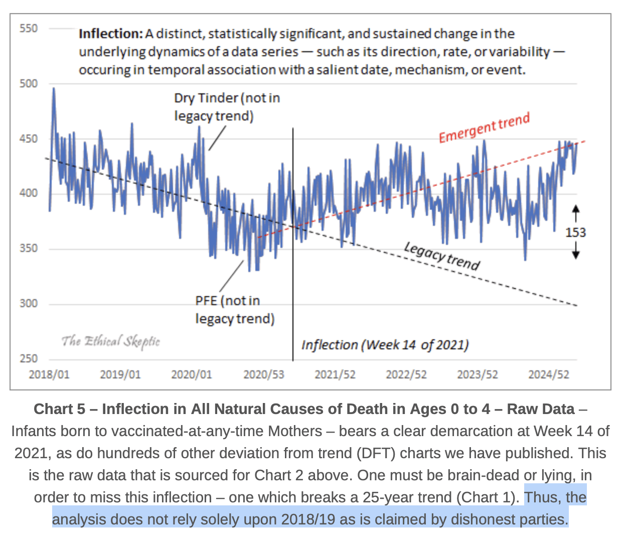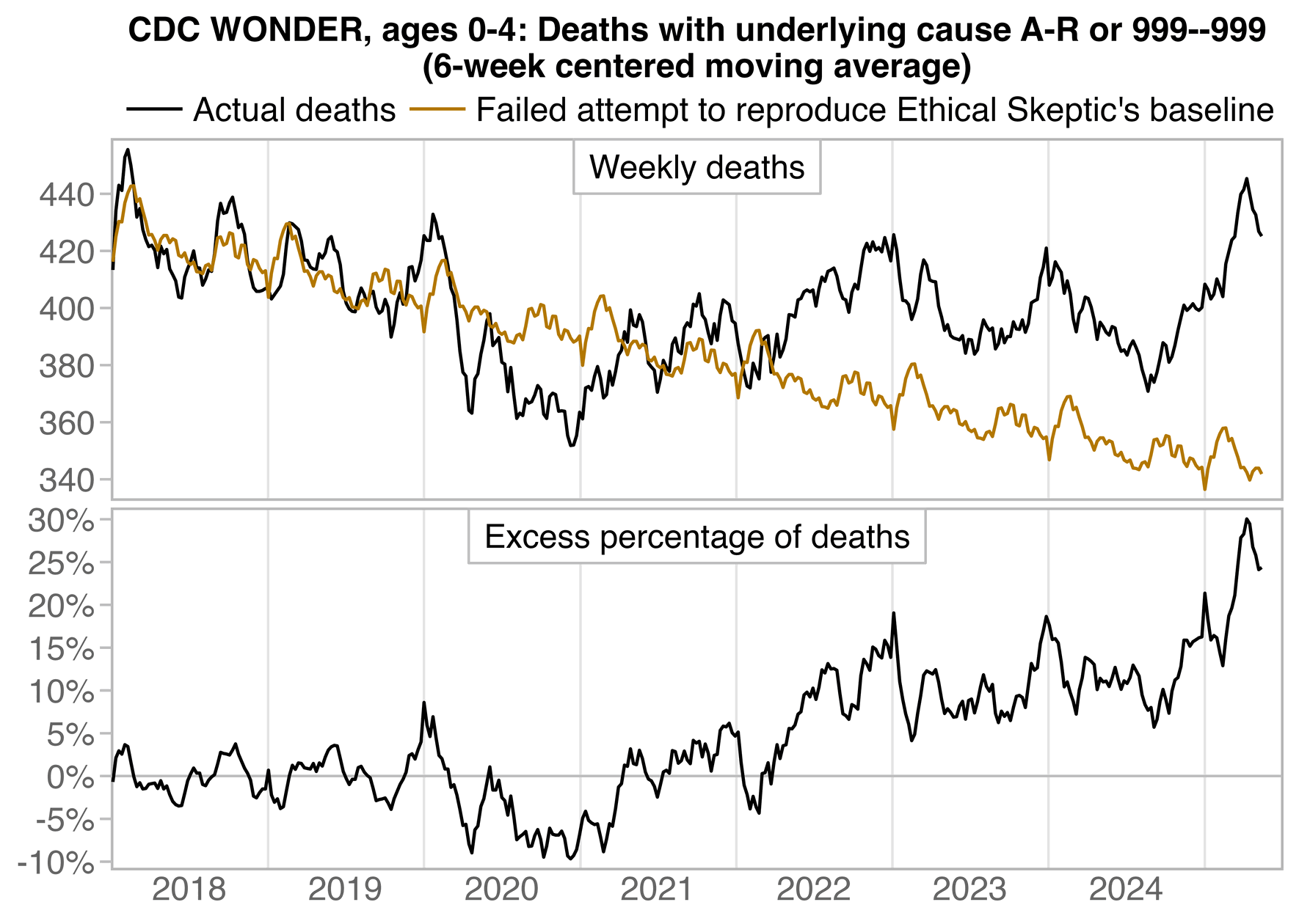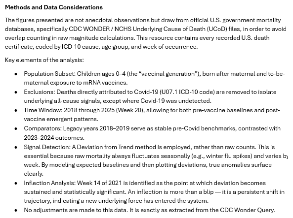 Ethical Skeptic posted this plot of weekly deaths from non-COVID natural causes in ages 0-4, where he got about 77% excess deaths on weeks 14-20 of 2025: [https://web.archive.org/web/20250903223011/https://theethicalskeptic.com/2025/08/19/houston-we-have-another-problem/]