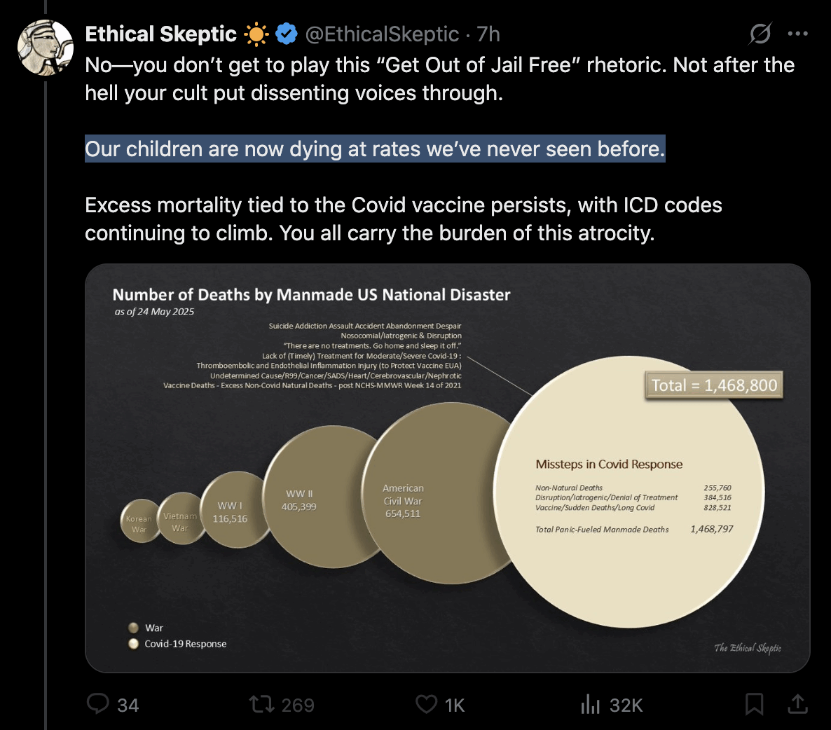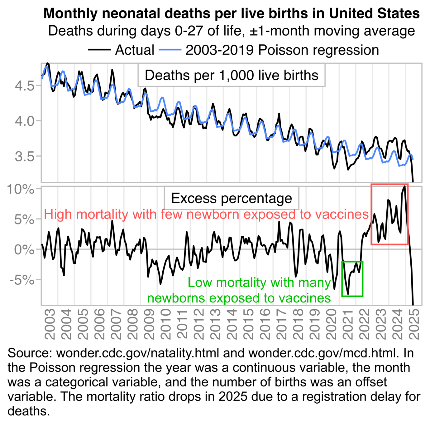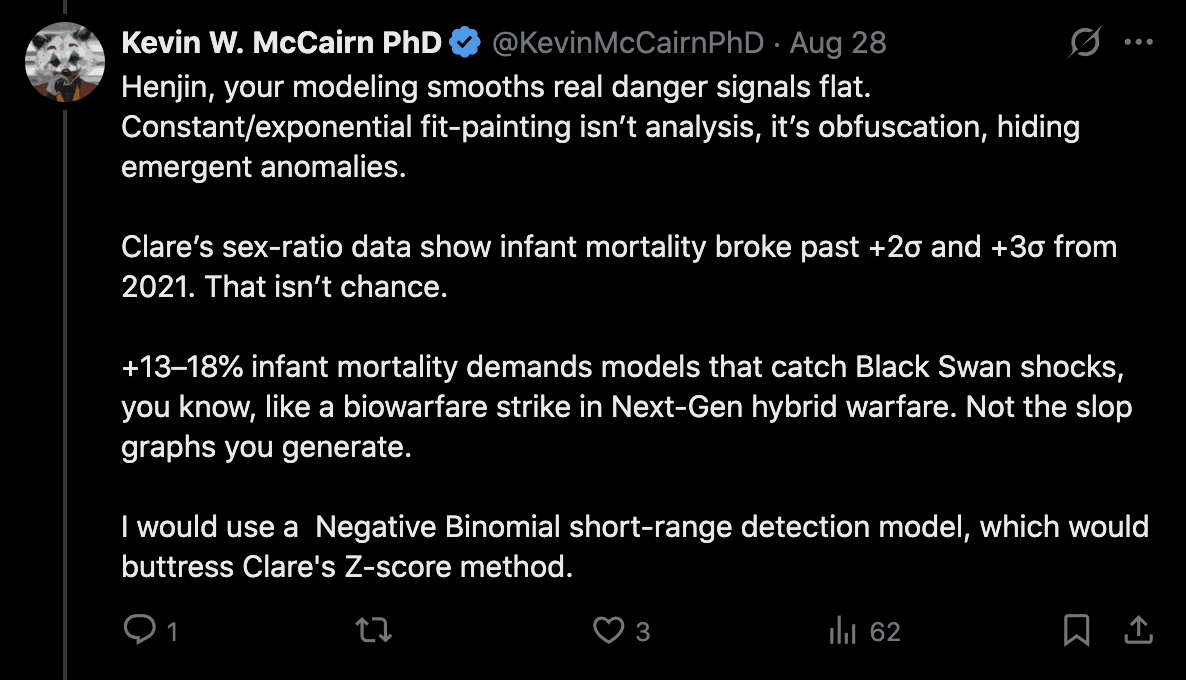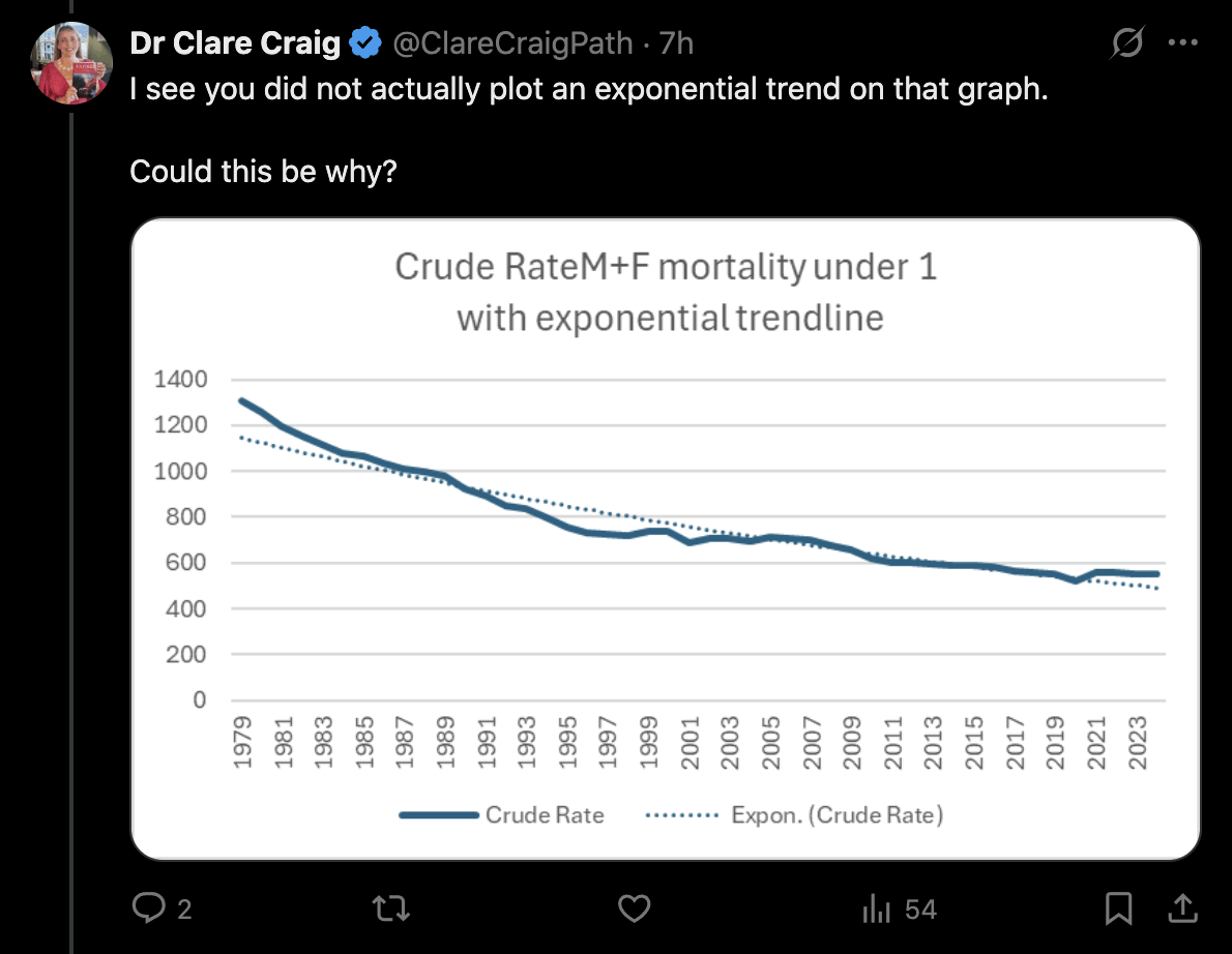 Ethical Skeptic posted this plot of weekly deaths from non-COVID natural causes in ages 0-4, where he got about 77% excess deaths on weeks 14-20 of 2025: [https://web.archive.org/web/20250903223011/https://theethicalskeptic.com/2025/08/19/houston-we-have-another-problem/]