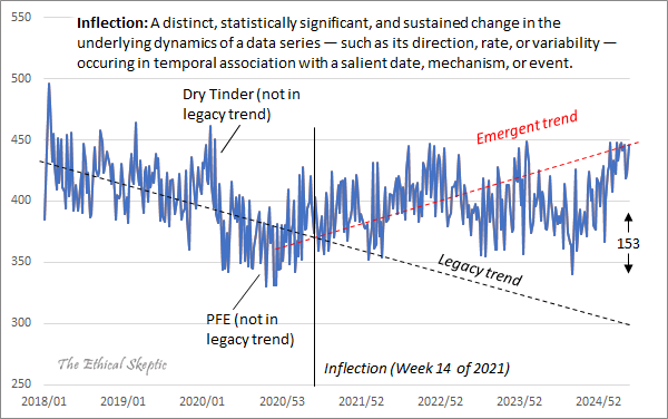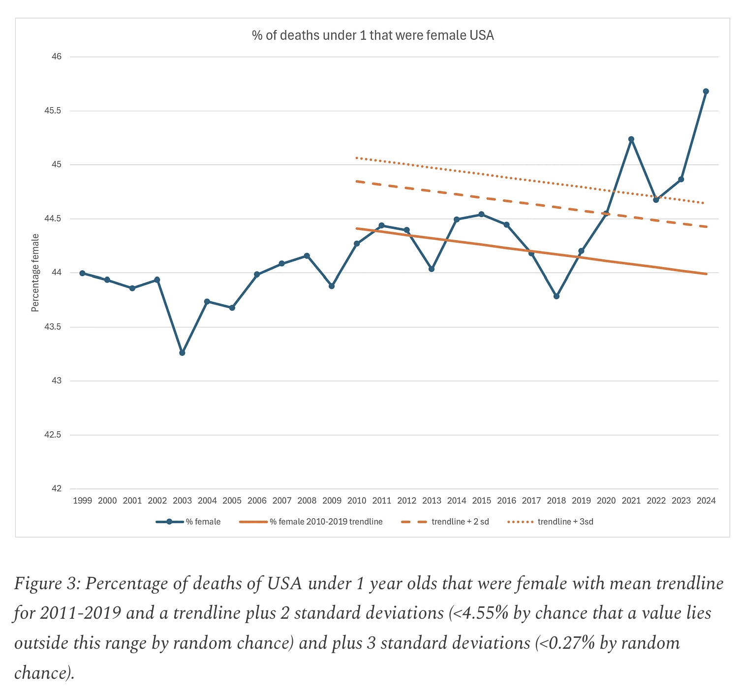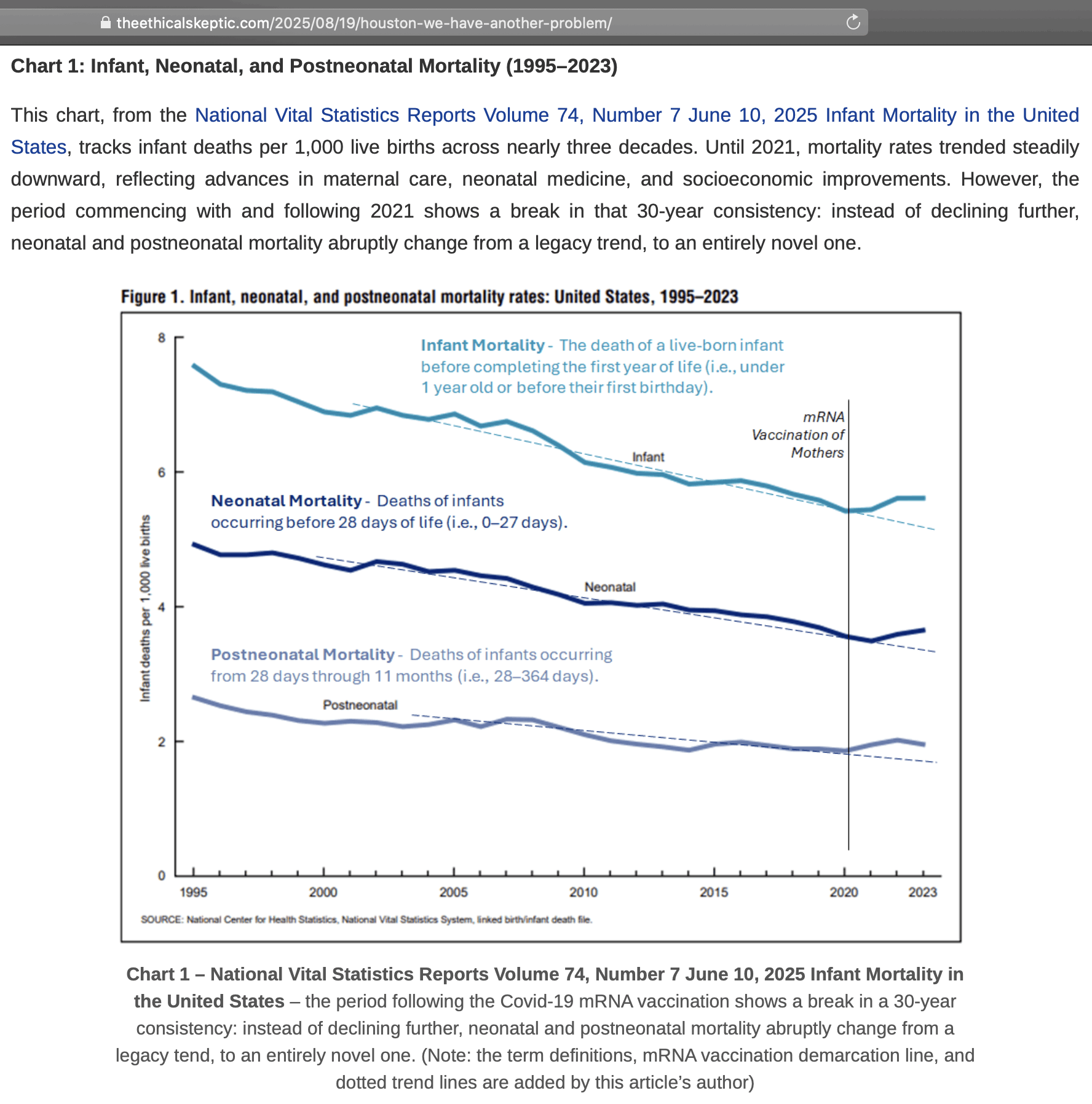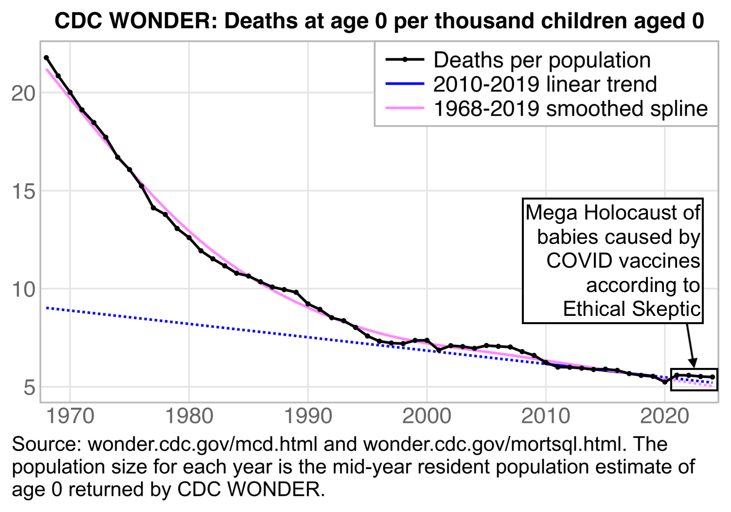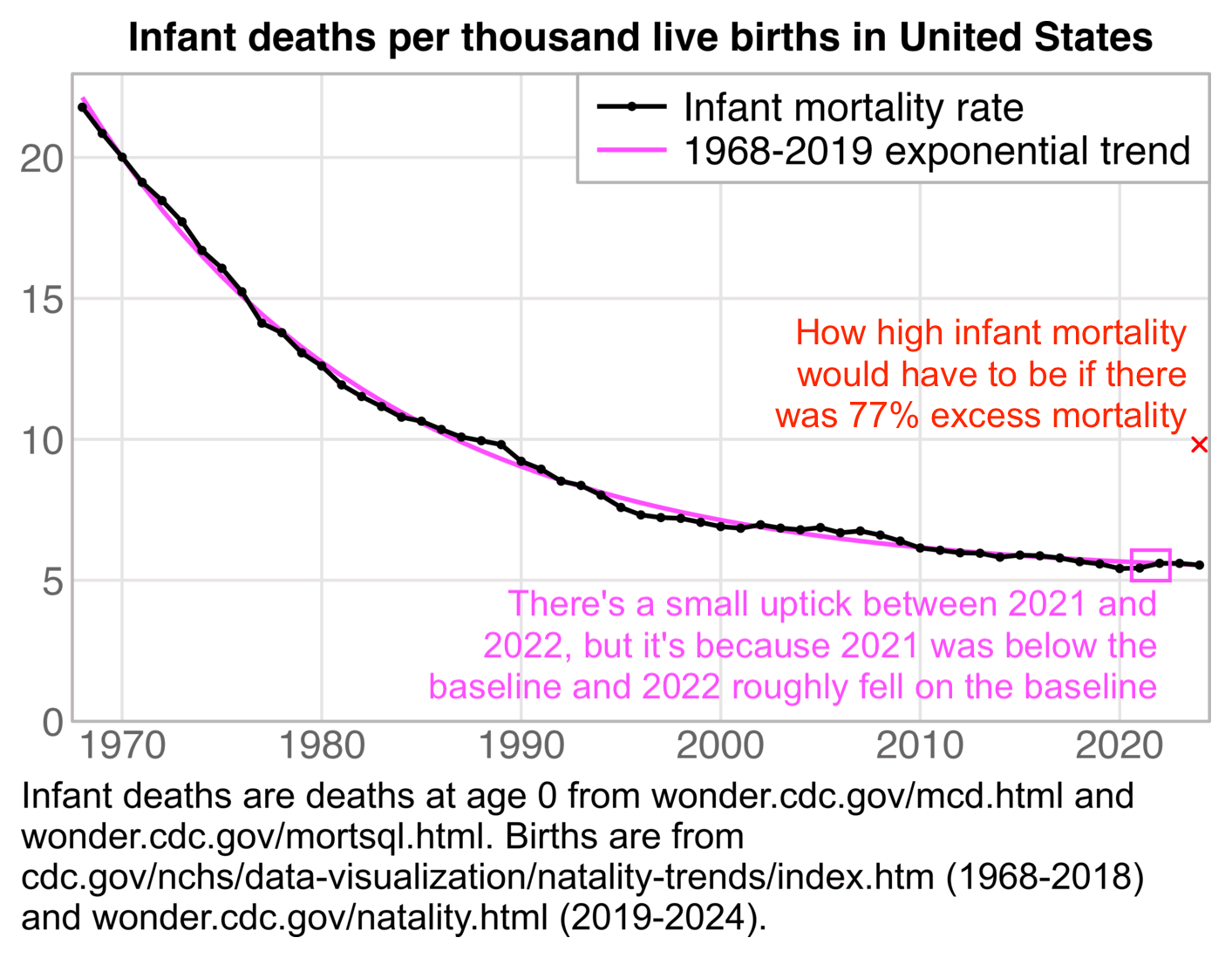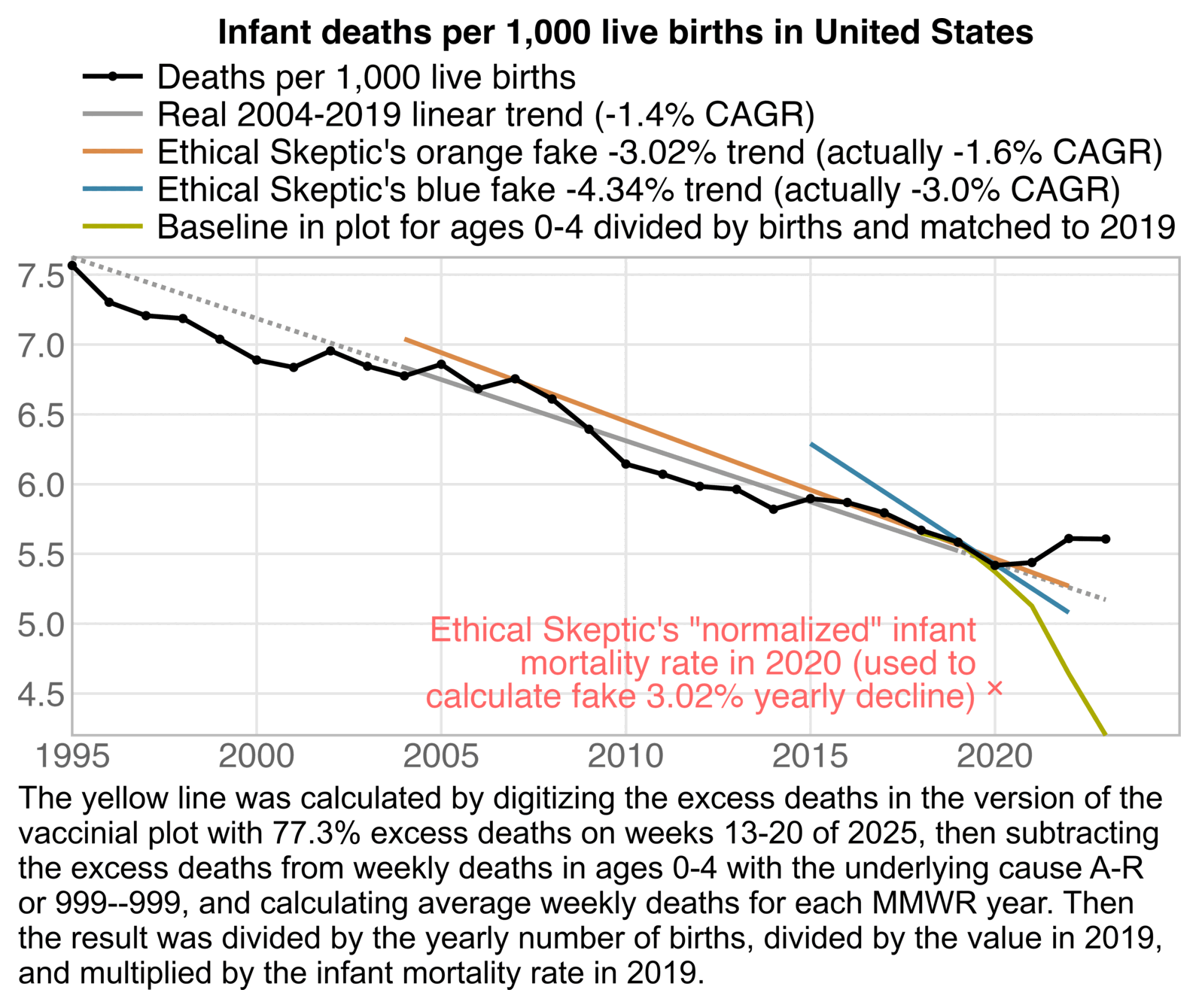 My best guess for how ES derived his "normalized" infant mortality rate is that first he calculated the annual decline percent of his "legacy trend", which was about 4.3%. Then he manually drew a line in the CDC plot that approximated the slope between 2019 and 2020, and he falsely declared that the line decreased by about 4.3% per year. Then he thought that the longer-term rate of decline before COVID looked about a third less steep than his blue line, so he picked a fake infant mortality rate for 2020 that gave him an annual rate of decline of about 3%.