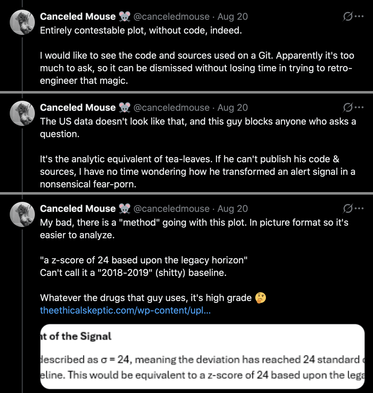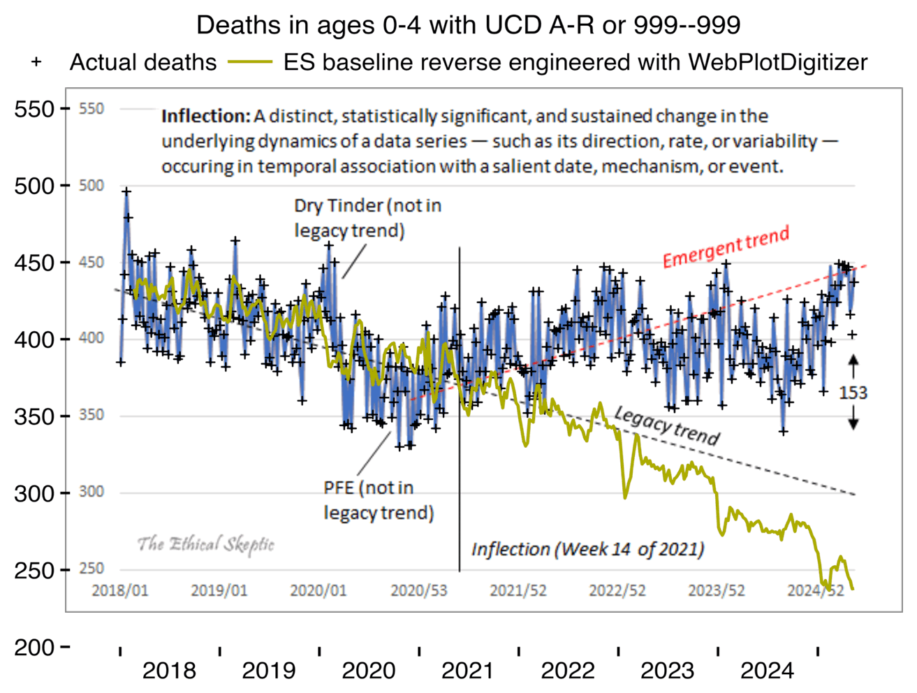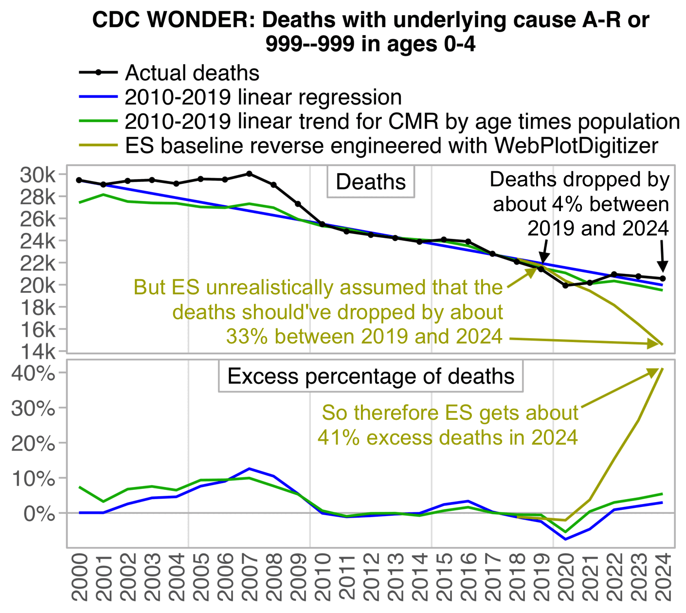 ES has refused to document how he calculated his baseline despite numerous requests. And he hasn't posted any plot that would shown one line for the actual deaths and another line for the baseline.