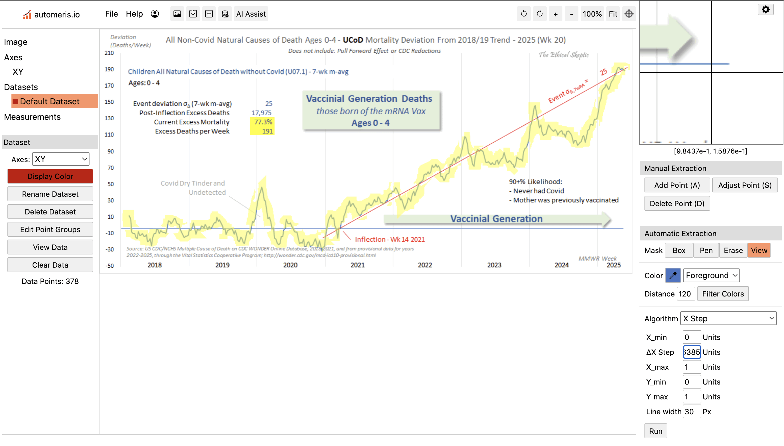 Therefore I reverse engineered his baseline by digitizing the excess deaths and subtracting them from the actual weekly deaths. ChatGPT and Grok were not successful in digitizing the plot, so I used a tool called WebPlotDigitizer instead: