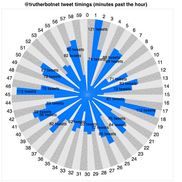 Most of the trutherbots post tweets at 15 minute intervals or multiples thereof. The sole exception is @trutherbotnet, which seems to aggregate tweets from the others via IFTTT (the other 12 tweet via custom apps with the same name as the account in question.)