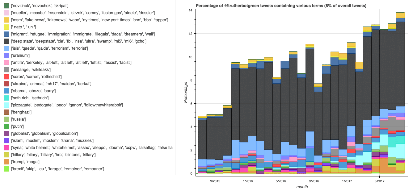 What do the trutherbots tweet? Mostly memes, with "deep state" material in second place. These charts show some examples of the common terms - one includes a category for the memes to demonstrate the relative proportion. The others shows tweet topics with the meme tweets removed.
