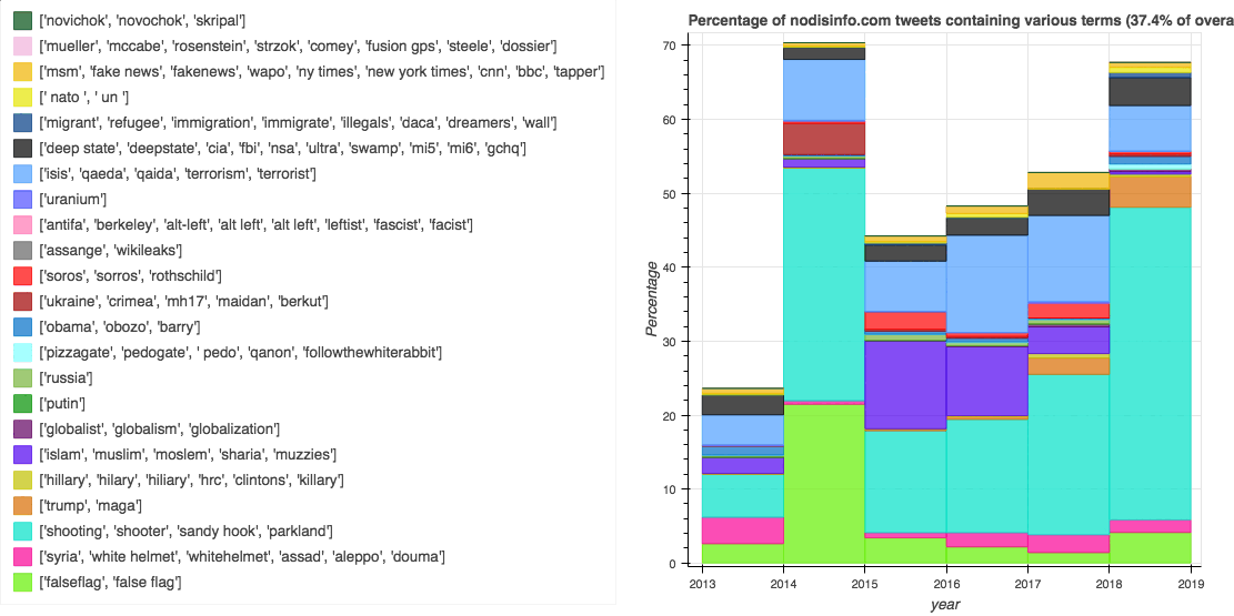 This chart shows the frequency of various terms in tweets linking to nodisinfo(dot)net from a sample of 1487 accounts (probably should have gone for one more). The overarching theme: everything from chemical attacks in Syria to school shootings to 9/11 is a false flag.
