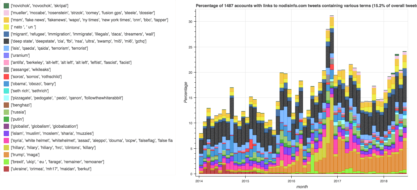 What else do the accounts that link to nodisinfo(dot)net tweet about? The "deep state" category is quite popular; the interest in Crimea and Ukraine in 2014 is notable.