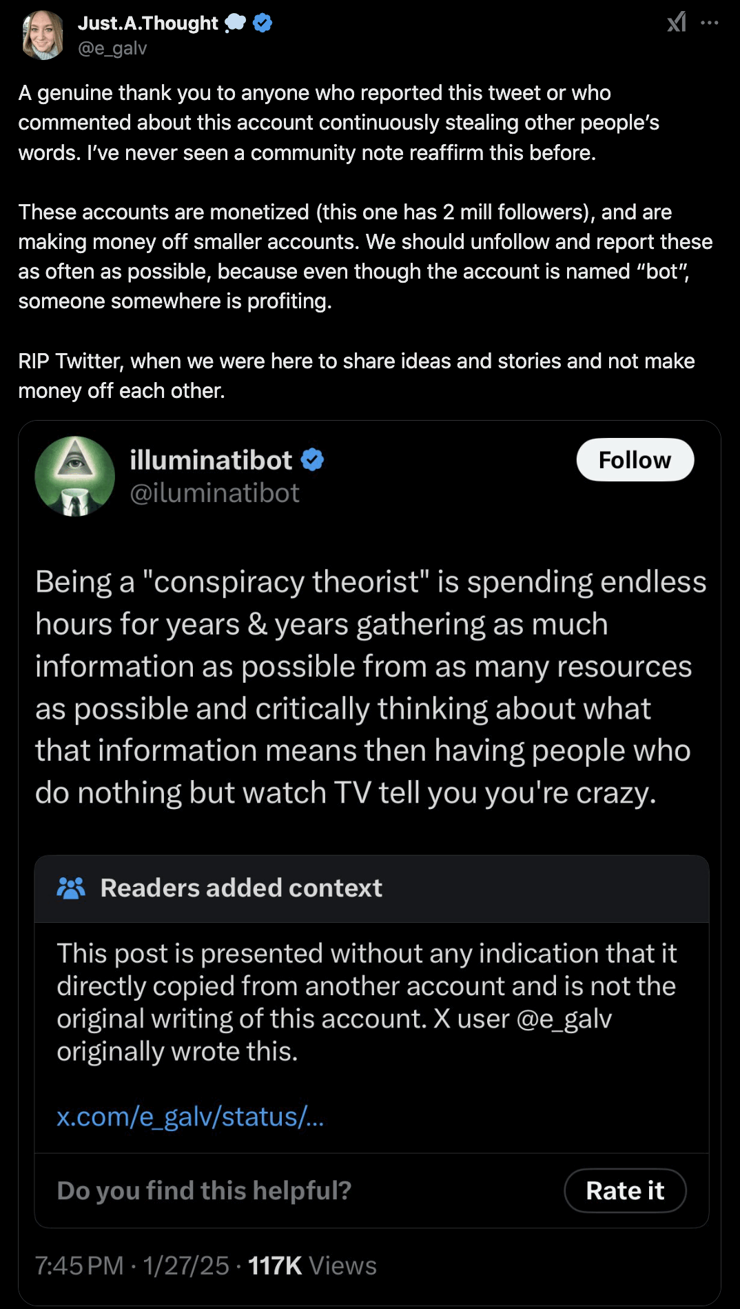 In January 2025 iluminatibot got this community note after it copied a tweet from a real user called e_galv: [https://x.com/e_galv/status/1884256273706721294]
