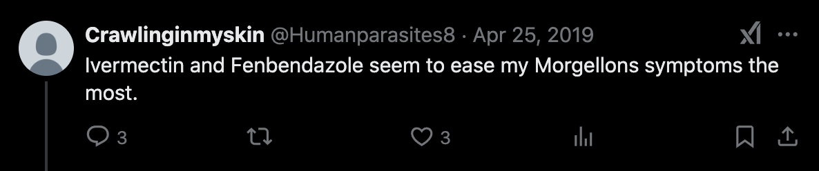 Both ivermectin and fenbendazole were used to treat Morgellons disease before turbo cancer: [https://x.com/Humanparasites8/status/1121415232071581696]