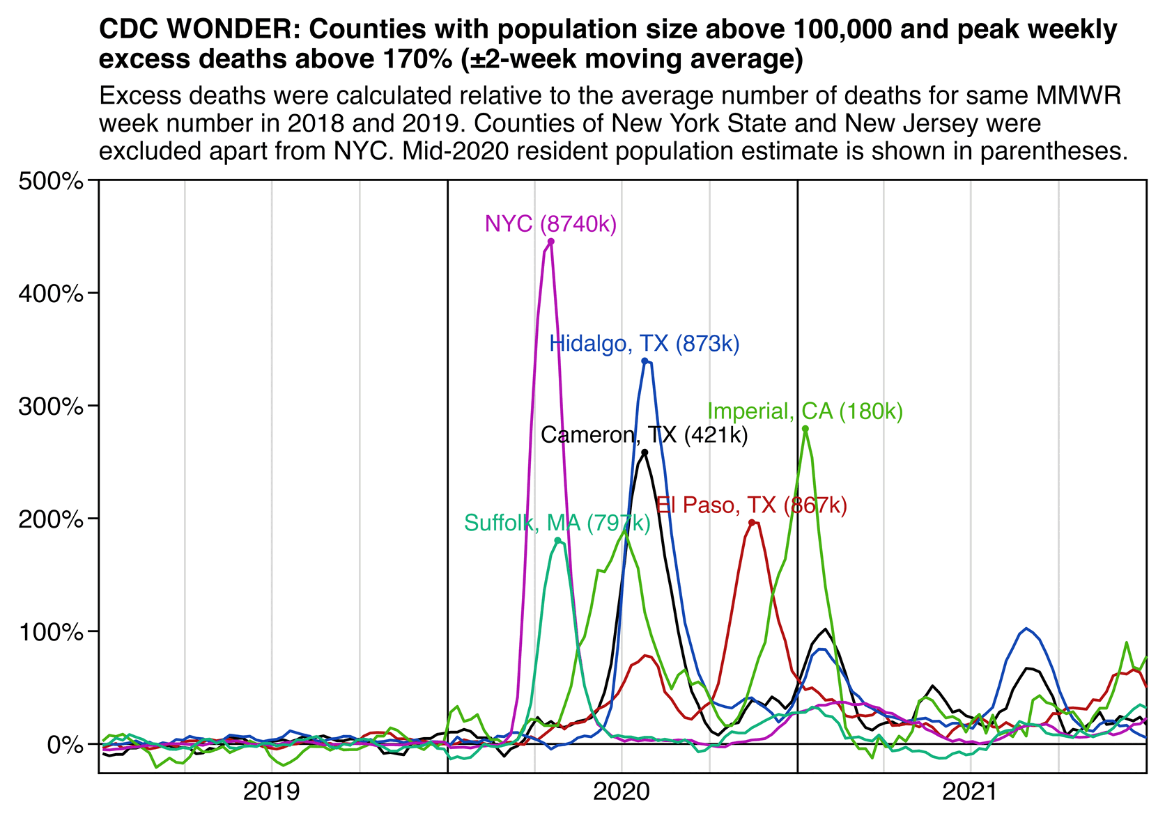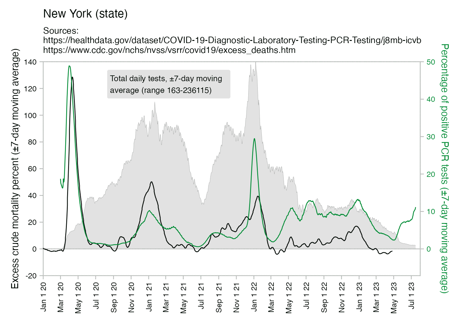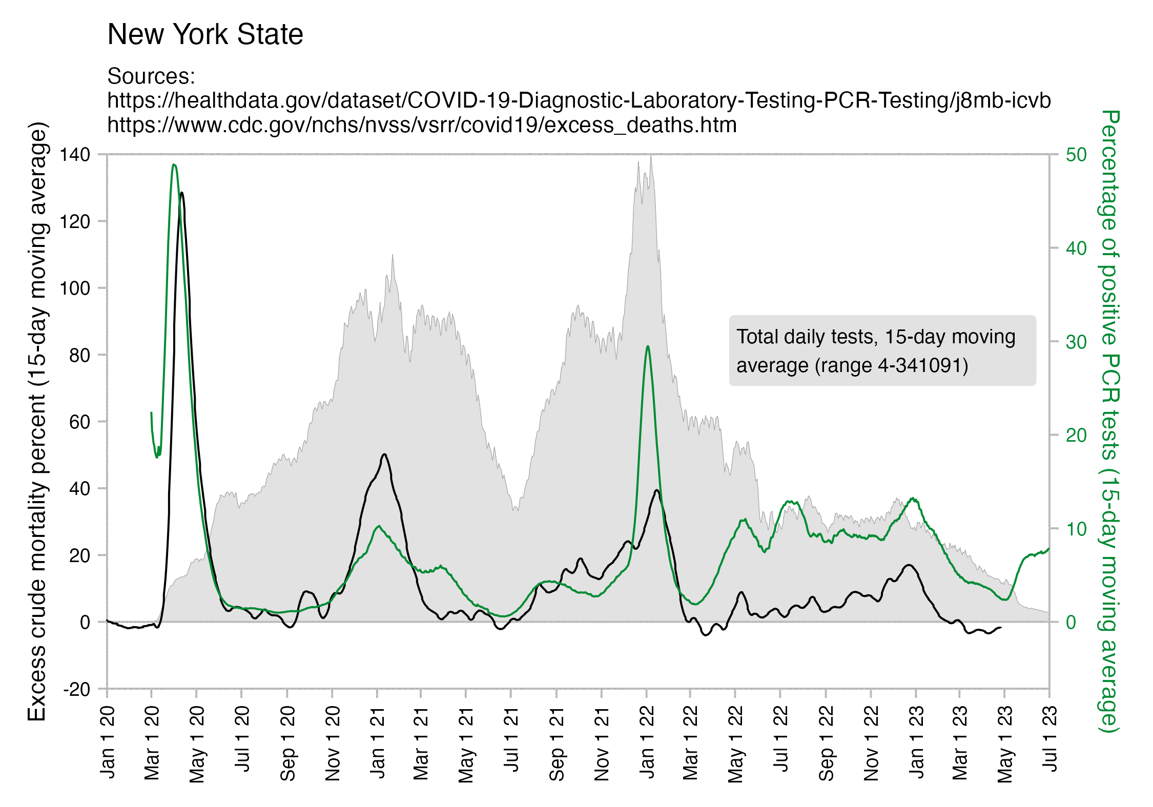 Hong Kong has a similar population size as NYC, and it had about 170% excess deaths in March 2022 according to OWID. At Worldometers the curve for COVID deaths in February to April 2022 in Hong Kong looks smooth like the curve for NYC, and it also has a similar shape where it goes from zero to maximum and back to zero within a period of about two months, and it takes about twice as long for the curve to fall back down from the maximum as it takes to rise up to the maximum value: [https://www.worldometers.info/coronavirus/country/china-hong-kong-sar/]