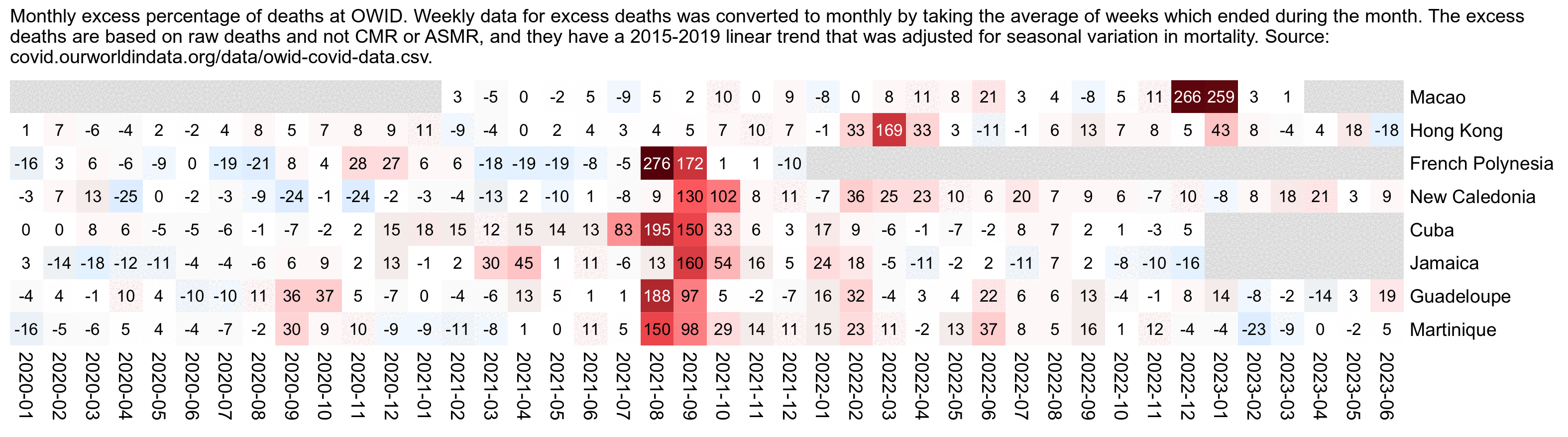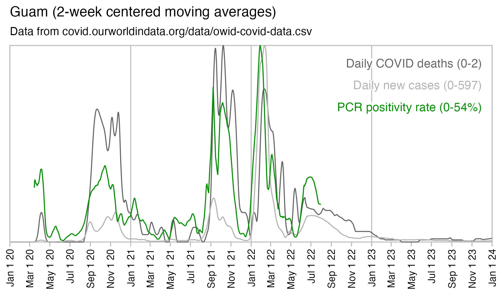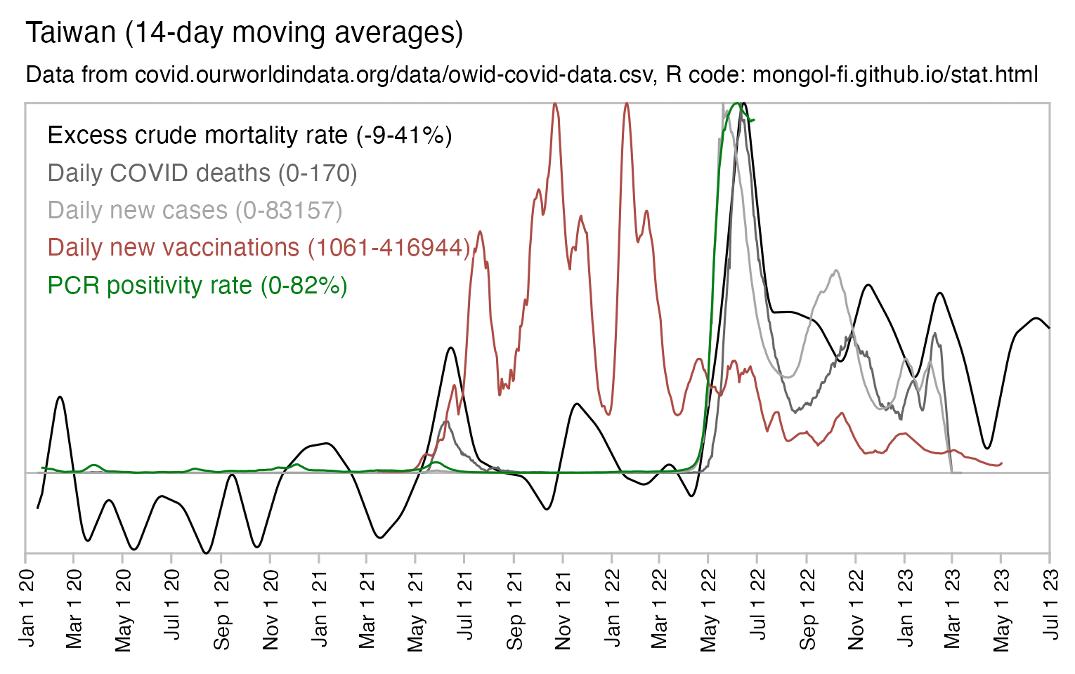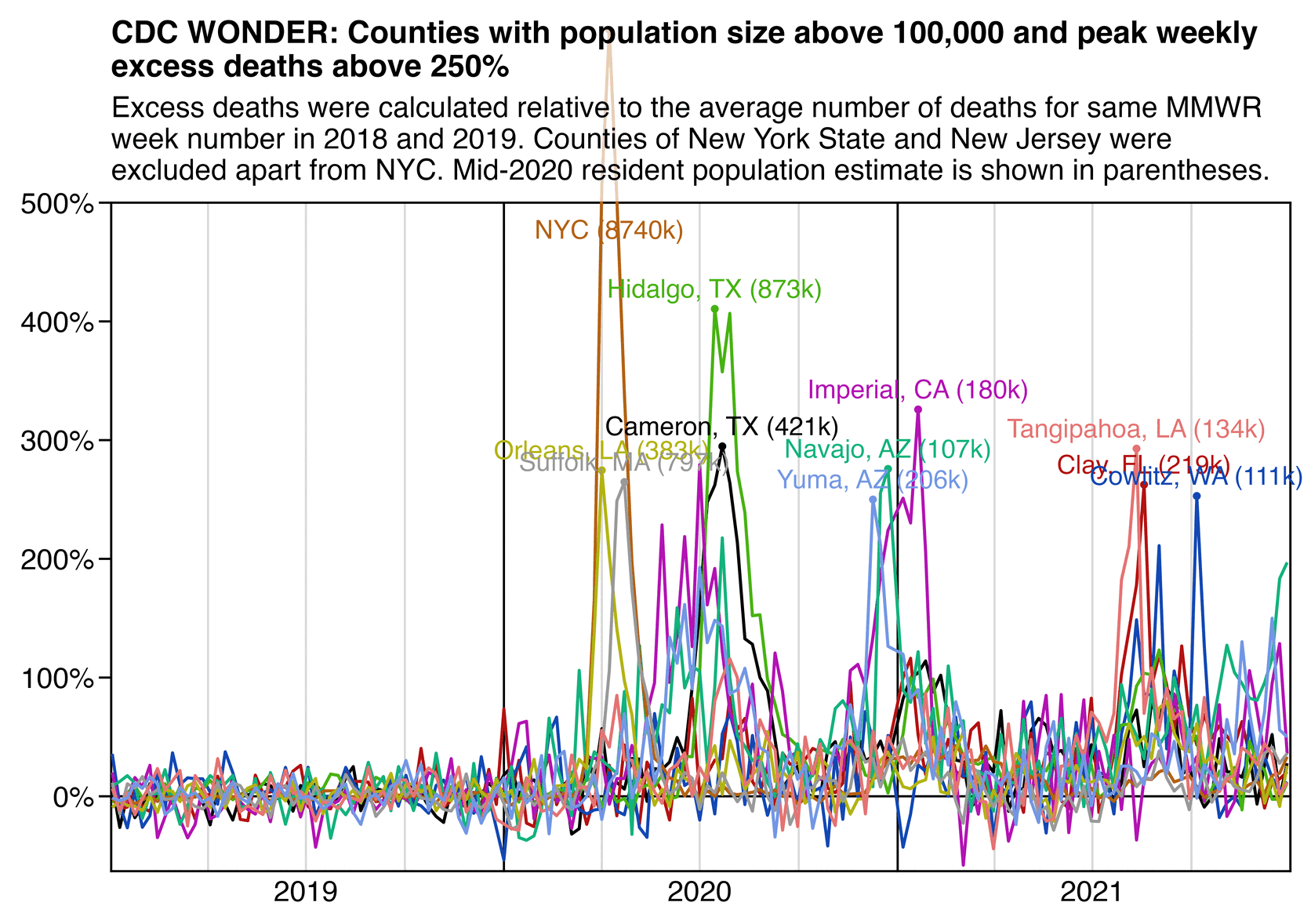 Hong Kong has a similar population size as NYC, and it had about 170% excess deaths in March 2022 according to OWID. At Worldometers the curve for COVID deaths in February to April 2022 in Hong Kong looks smooth like the curve for NYC, and it also has a similar shape where it goes from zero to maximum and back to zero within a period of about two months, and it takes about twice as long for the curve to fall back down from the maximum as it takes to rise up to the maximum value: [https://www.worldometers.info/coronavirus/country/china-hong-kong-sar/]