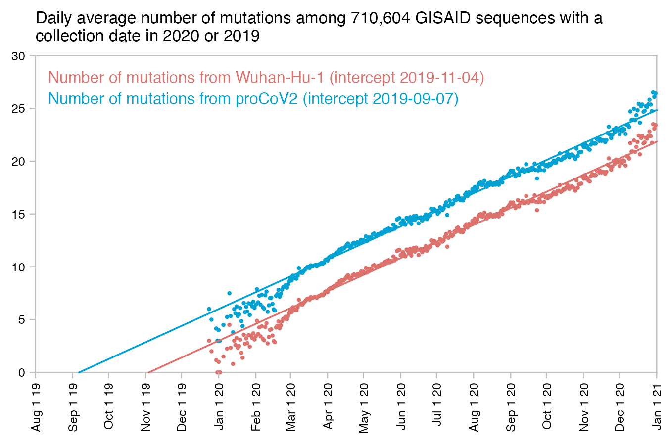 Kumar et al. reconstructed an ancestor of known strains of SARS-CoV-2, which they called proCoV2 and which has only 3 mutations relative to Wuhan-Hu-1, which are C8782T, C18060T, and T28144C. [https://academic.oup.com/mbe/article/38/8/3046/6257226] The identical set of three mutations is found in the WA1 sample, which is supposed to have come from the first known COVID patient in the US who has become known as the "Snohomish County man". Based on a linear regression for the number of mutations from proCoV2/WA1 in GISAID samples collected in 2020, the date of divergence between known strains of SARS-CoV-2 would be around early September 2019 (even though the trend in early 2020 doesn't actually seem to be linear, and in the plot below if you imagine drawing a curved regression line based on the distribution of points in early 2020, it would appear to cross the x-axis closer to the end of 2019):