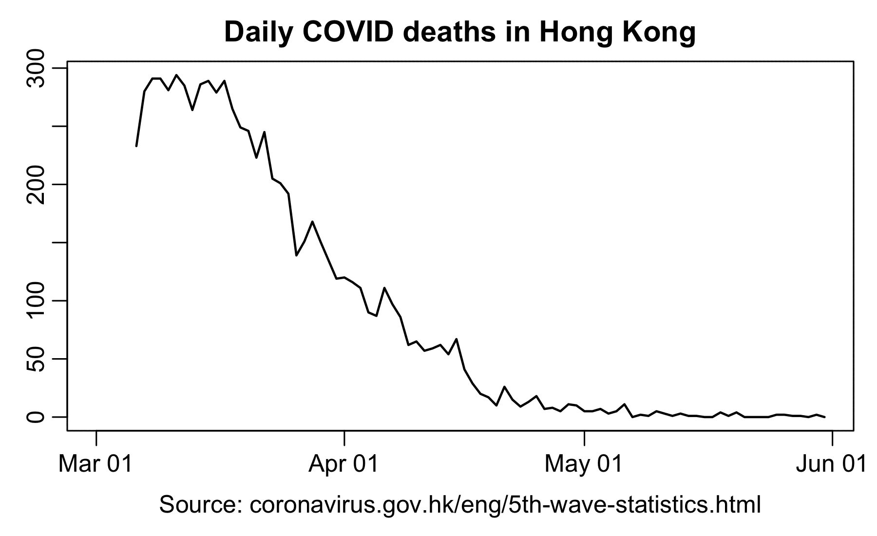 The CSV files only included data from March 5th onwards which was near the peak in COVID deaths, so in the plot below I was not able to include earlier data. The curve for COVID deaths in Hong Kong looks more smooth than the curve for Hubei but slightly less smooth than the curve for NYC, even though it might be because the peak number of daily COVID deaths was over twice as high in NYC as Hong Kong, so NYC had less noise because it had a bigger sample size for deaths even though NYC and Hong Kong have a similar population size: