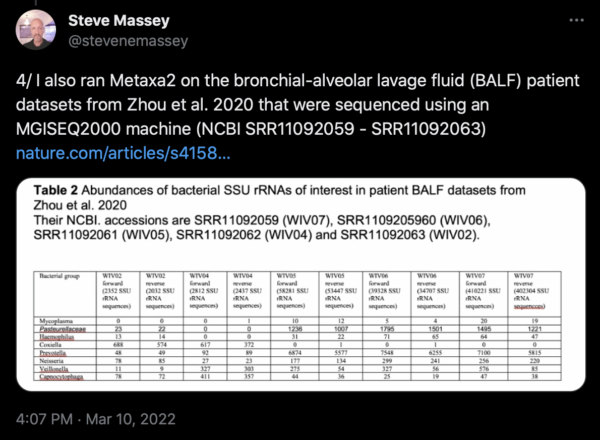 However JC's theory is probably wrong, because even though the NCBI's Sequence Read Archive contains about 11 million of genetic sequencing runs that were published before 2020, and even though there's many metagenomic sequencing runs of human lung samples or respiratory samples, and there's many metagenomic sequencing runs that contain reads from all kinds of viruses, there's only a handful of runs that were published before 2020 and that match sarbecoviruses.