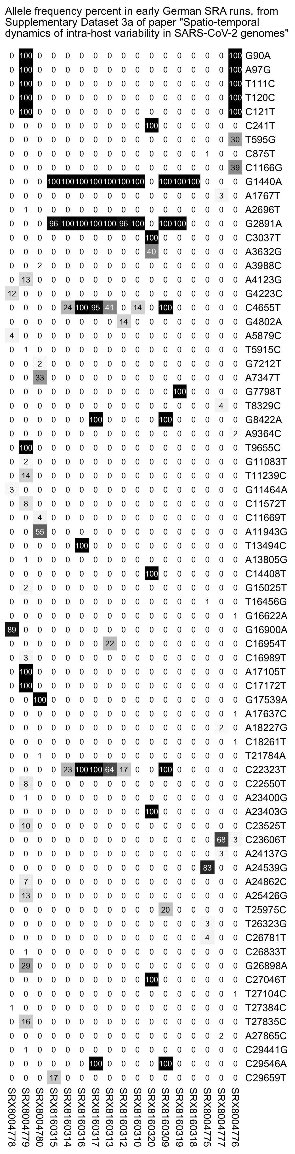 In Supplementary Dataset 3a and 3b there's tables of allele frequencies of various SRA runs grouped by country, where the minimum frequency listed is also 0.01. I'm using the table for Germany as an example because it's small enough to display as a single heatmap: