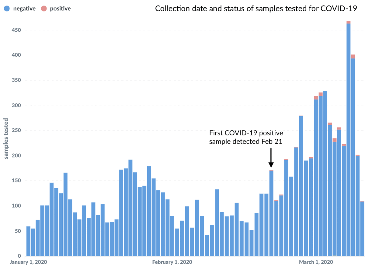 We tested 3600 samples collected in Jan 2020 for COVID-19 status and found zero positives. We tested 3308 samples collected in Feb 2020 and found a first positive on Feb 21 with a total of 10 samples testing positive in Feb.