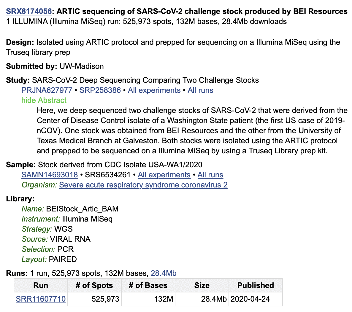 The reads are derived from an isolate that was taken from the first known COVID case in the United States, which was in Snohomish County in Washington State. The consensus sequence of reads from the sample differs from the Wuhan-Hu-1 reference genome by 3 mutations, which are all ancestral in the sense that they are shared with RaTG13 and BANAL-52 (C8782T, C18060T, T28144C).