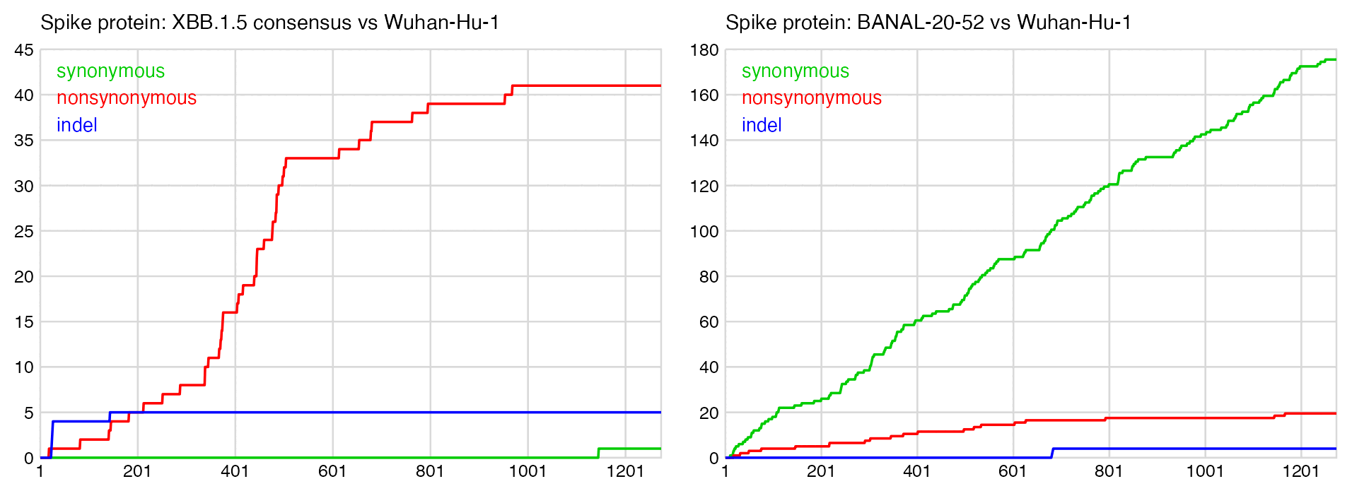 In the output above, the first column shows the publication date, the second column shows the collection date, the seventh column shows the number of nucleotide changes from Wuhan-Hu-1, and the eighth column shows the list of nucleotide changes from Wuhan-Hu-1. There's two samples with more than 10 mutations from Wuhan-Hu-1. The other sample is EPI_ISL_406799 which has 25 mutations, but 22 of them are not found in any other sample submitted before April 2020, and there's also 8 inserted segments which are likely the result of sequencing errors, since there normally wouldn't be such a high ratio of inserts to spot mutations, and the length of most inserts is not even a multiple of 3 so the inserts would result in frameshifts. The other sample is EPI_ISL_406592 which has 27 mutations, but 21 of the mutations are not found in any other sample submitted before April 2020, so they may have been something like the result not using a MAPQ cutoff when doing variant calling, and many of the mutations appear at nearby positions (like 4728, 4729, and 4739; 6834 and 6838; and 26755 and 26759), so the mutations may have been the result of doing global alignment without adapter trimming or without trimming low-quality bases from the ends of reads.