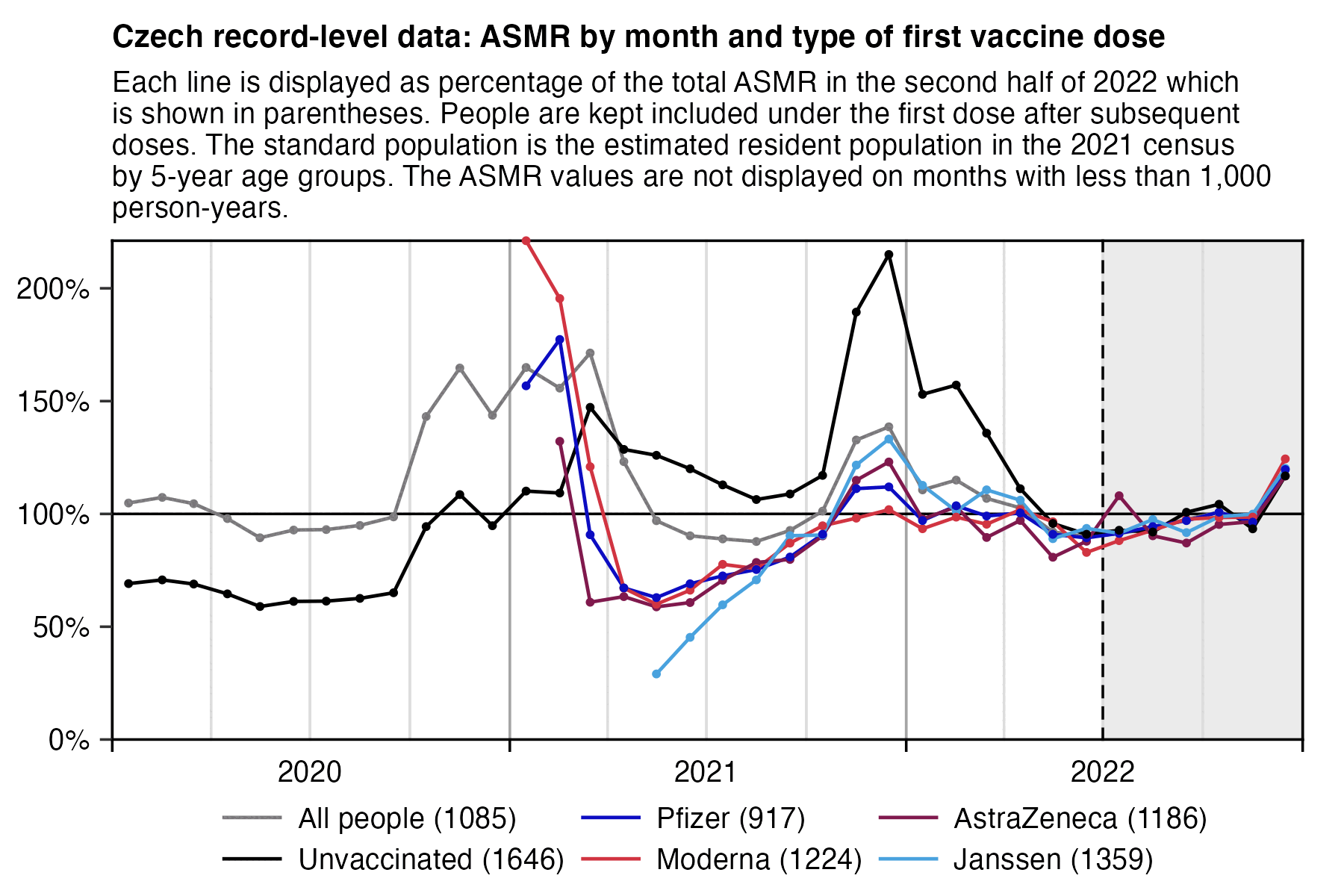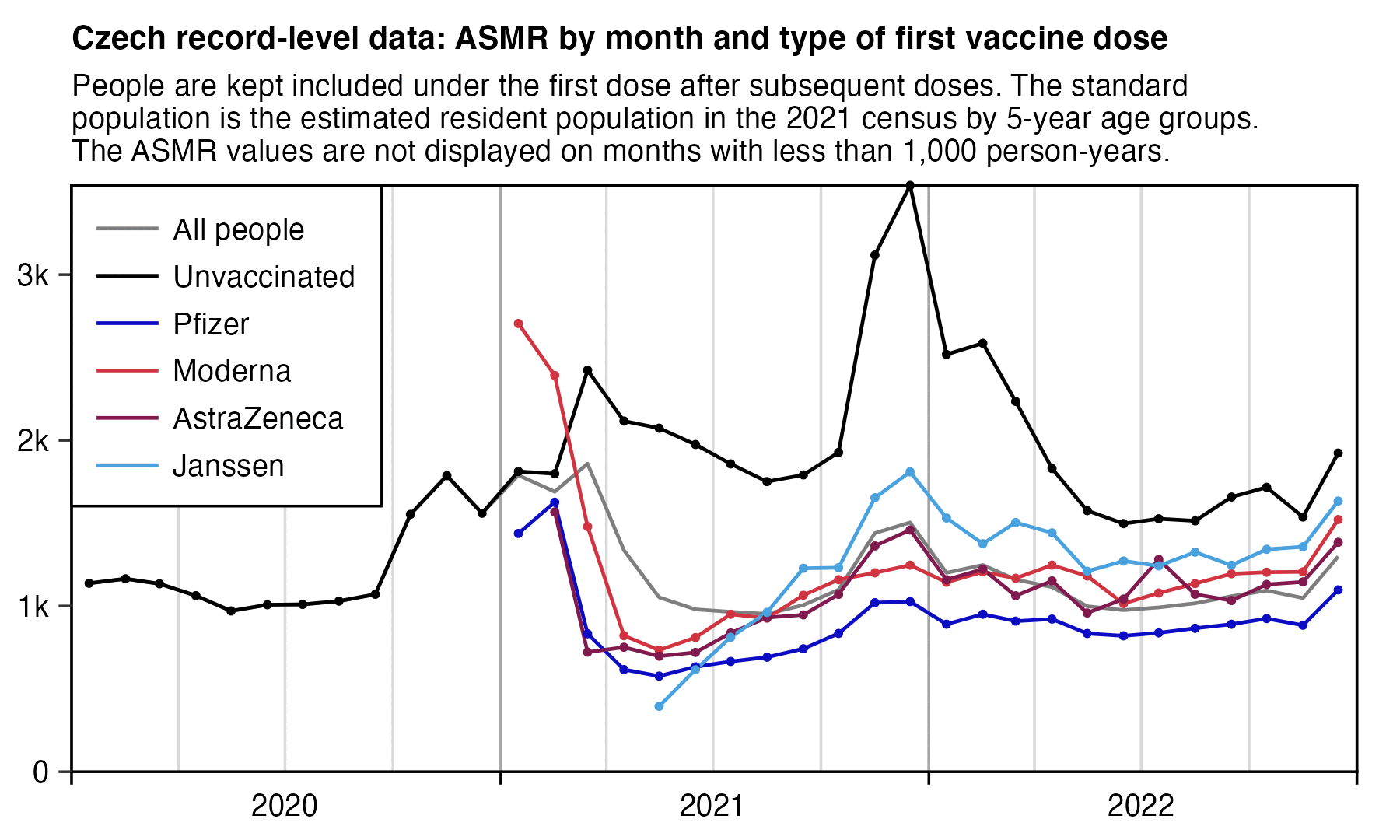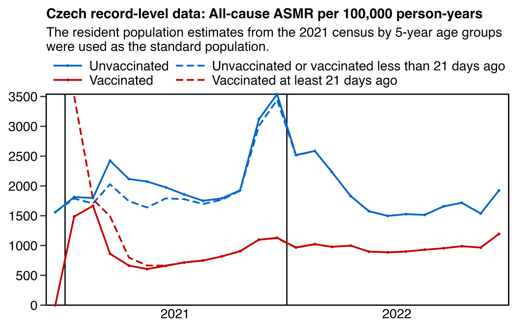 A similar effect can also be seen in the next plot of the Czech record-level data, where the light gray line has a sharp drop during the first weeks after vaccination, because the light gray line is adjusted for the background mortality rate among the entire Czech population during the ongoing month: [connecticut.html#Deaths_by_weeks_since_vaccination]
