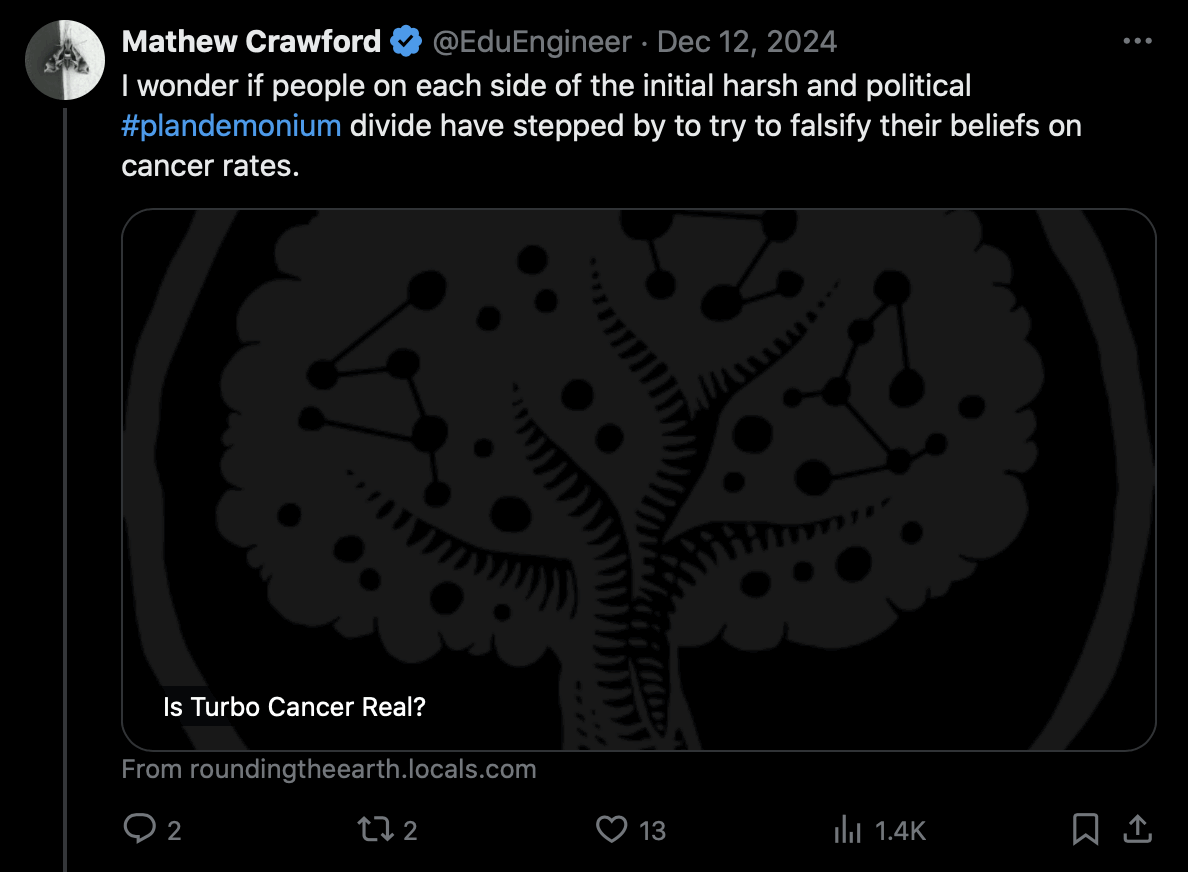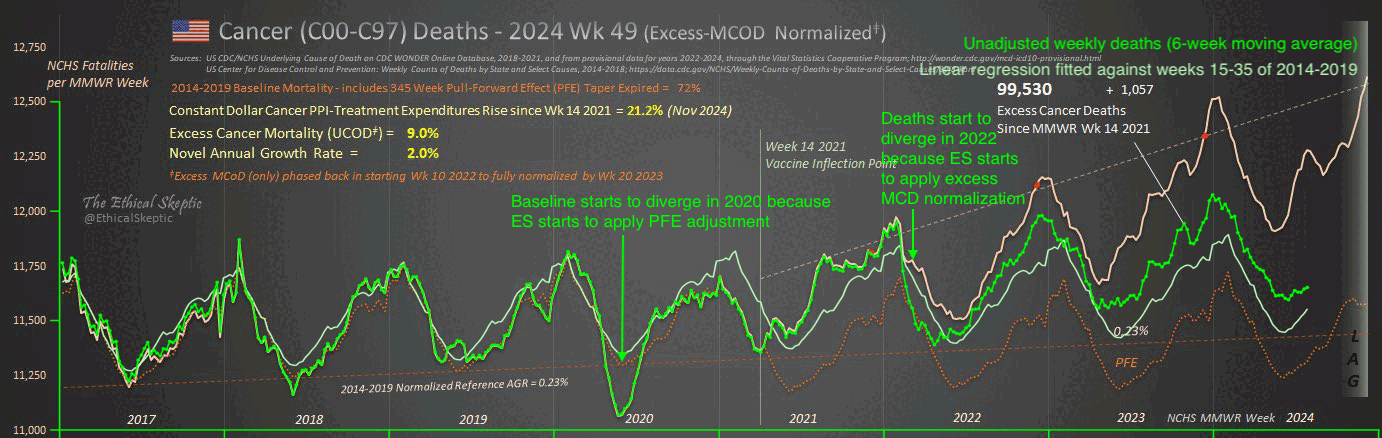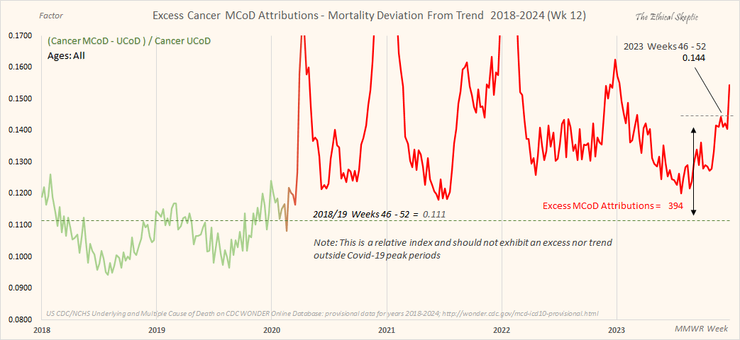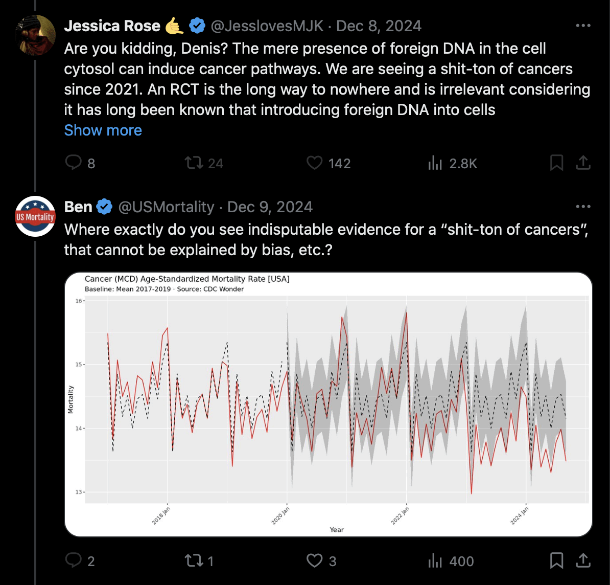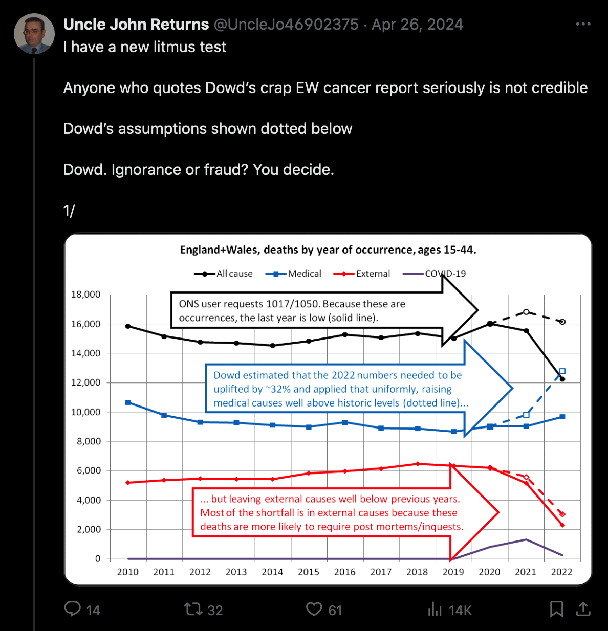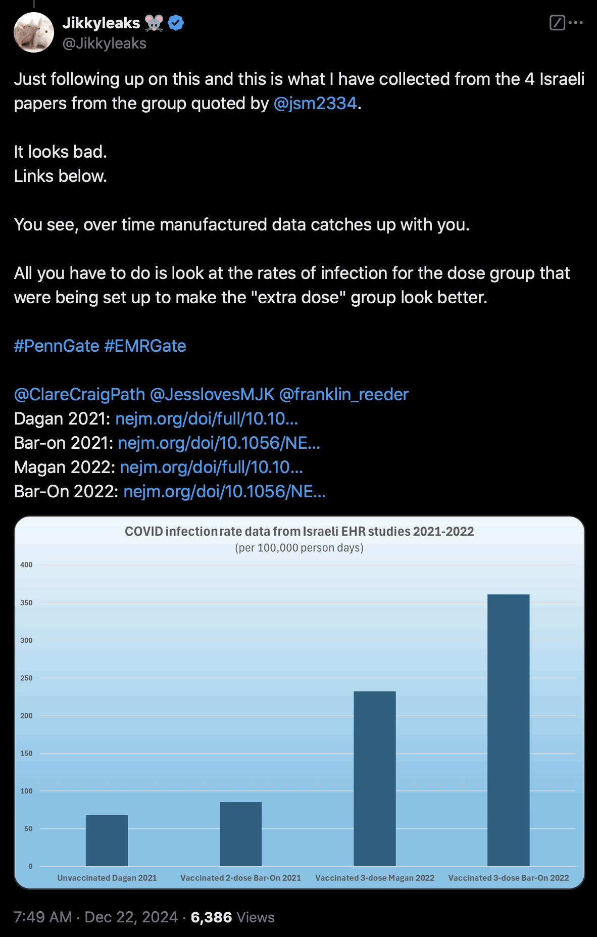 Neil and Fenton's cheap trick paper was recently demolished by Peter Hegarty, who is a professor of mathematics at the University of Gothenburg. [https://x.com/PeterHegarty17/status/1869784526395978142] He found that only about a quarter of the 39 papers listed by Neil and Fenton actually employed the classification delay which Neil and Fenton have dubbed the cheap trick, and none of the papers applied the form of the cheap trick postulated by Neil and Fenton where the classification delay was only applied to the numerator but not to the denominator. Hegarty wrote: "Moreover, their text and simulations suggest they were concerned with an even much more egregious form of the bias, whereby only Covid cases amongst the partially vaccinated contributed to the infection rate for the unvaccinated. In other words, partially vaccinated cases were counted in the numerator of the infection rate for the unvaccinated, but partially vaccinated individuals were counted in the denominator for the fully vaccinated. We can state categorically that we found no evidence in any of the 39 studies of this 'trick' being employed."
