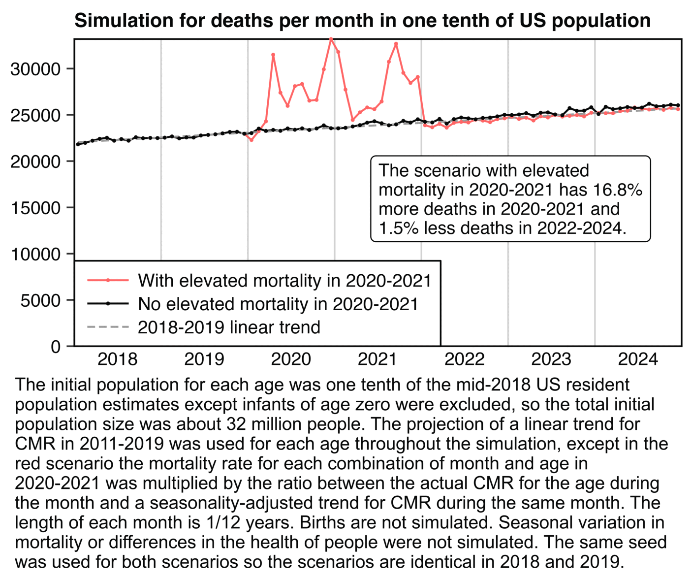 And in the next plot if you look at the dark gray line which is not adjusted for the monthly background mortality rate, the temporal HVE only seems to last about 3 weeks because there is a dent in deaths around the 4th week, even though it's because the rising trend in deaths due to waning out of the HVE is counteracted by the falling trend in background mortality rate. But in the light gray line which is adjusted for background mortality rate, the temporal HVE seems to last around 20 weeks instead:
