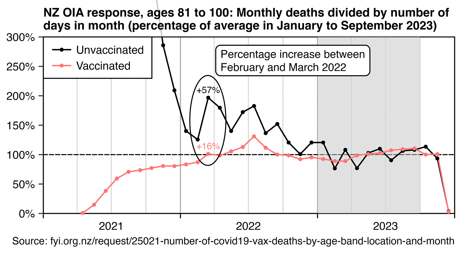 However there weren't very many people who only got their first vaccine dose after January 2022. So one way the FOIA response can be employed to estimate if the vaccines were effective or not is to look at the percentage increase in deaths in March 2022 when New Zealand was first hit by COVID. But for example in ages 81-100 between February and March 2022, the number of deaths divided by days in month increased by about 57% in unvaccinated people but only by about 16% in vaccinated people: [moar.html#Deaths_in_ages_81_in_Chris_Johnstons_OIA_response]