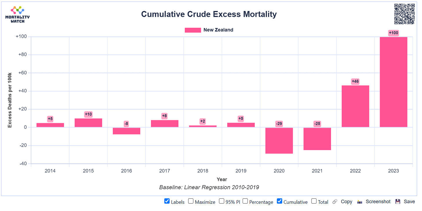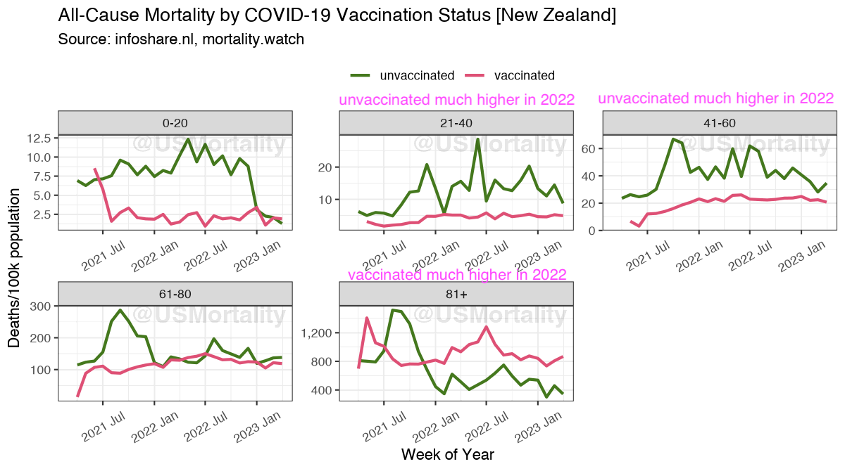 USMortality wrote: "On the other hand, data from New Zealand provides a contrasting perspective. It shows that mortality rates for vaccinated and unvaccinated groups are similar, and the country experienced no statistically significant excess mortality during the pandemic."