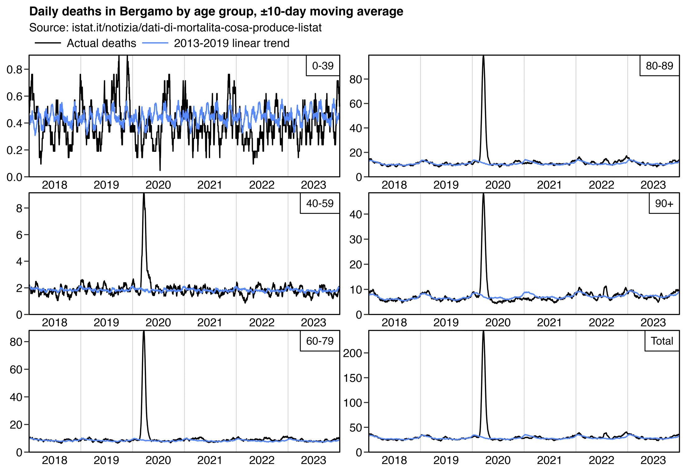 age nz barry # deaths per 100,000 person-years 0-20 33 30 # the `nz` column includes both vaccinated and unvaccinated people 21-40 67 62 # the `barry` column includes only vaccinated people 41-60 297 295 61-80 1562 1519 81+ 10944 9914