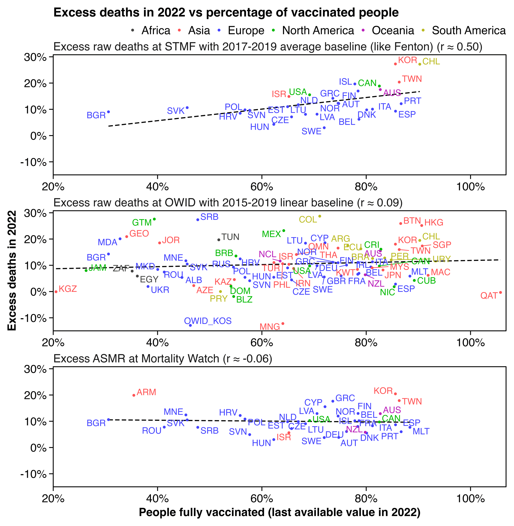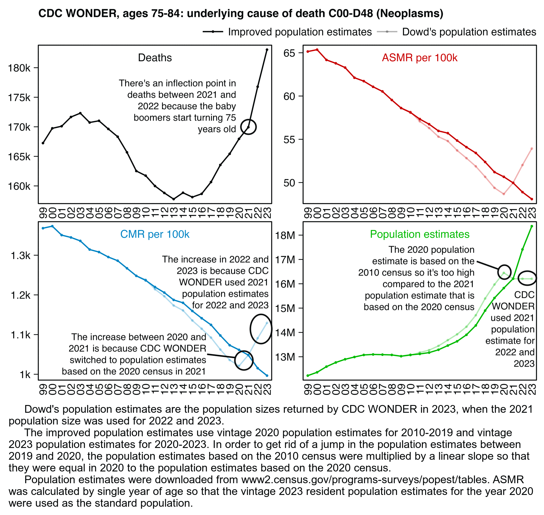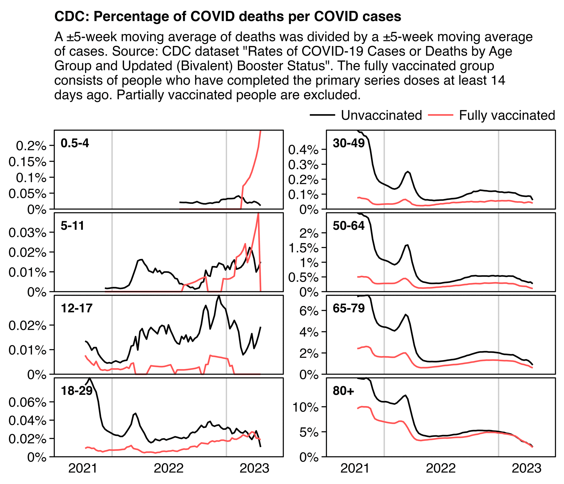 In this plot by USMortality if you look at the CMR in 2022 only, it's over twice as high in unvaccinated people as vaccinated people in ages 0-20, 21-40, and 41-60, but ages 81+ follow the opposite pattern so vaccinated people have about twice as high CMR as unvaccinated people. That should've served as a basic sanity check to USMortality that his population sizes were so inaccurate that he shouldn't even have published his analysis: [https://www.usmortality.com/p/new-zealands-all-cause-deaths-and]