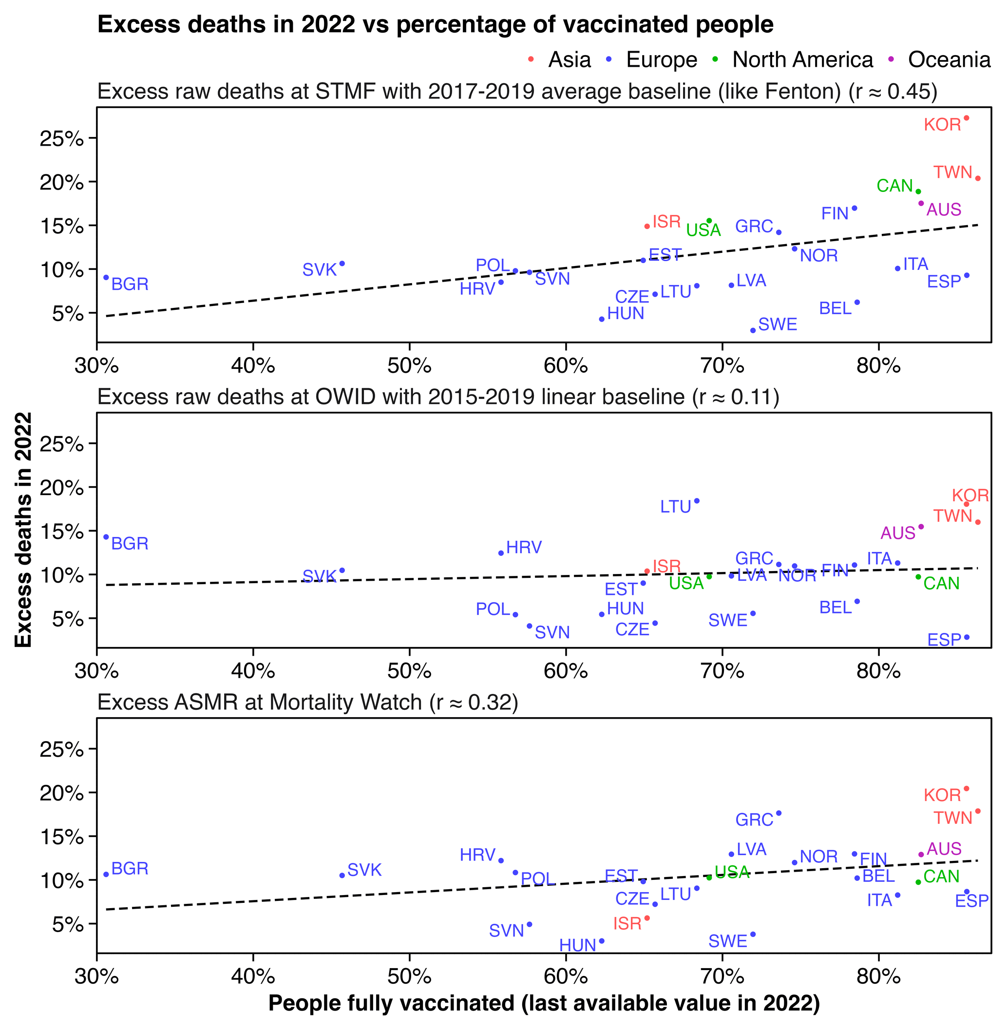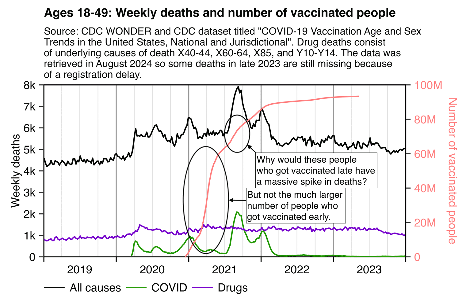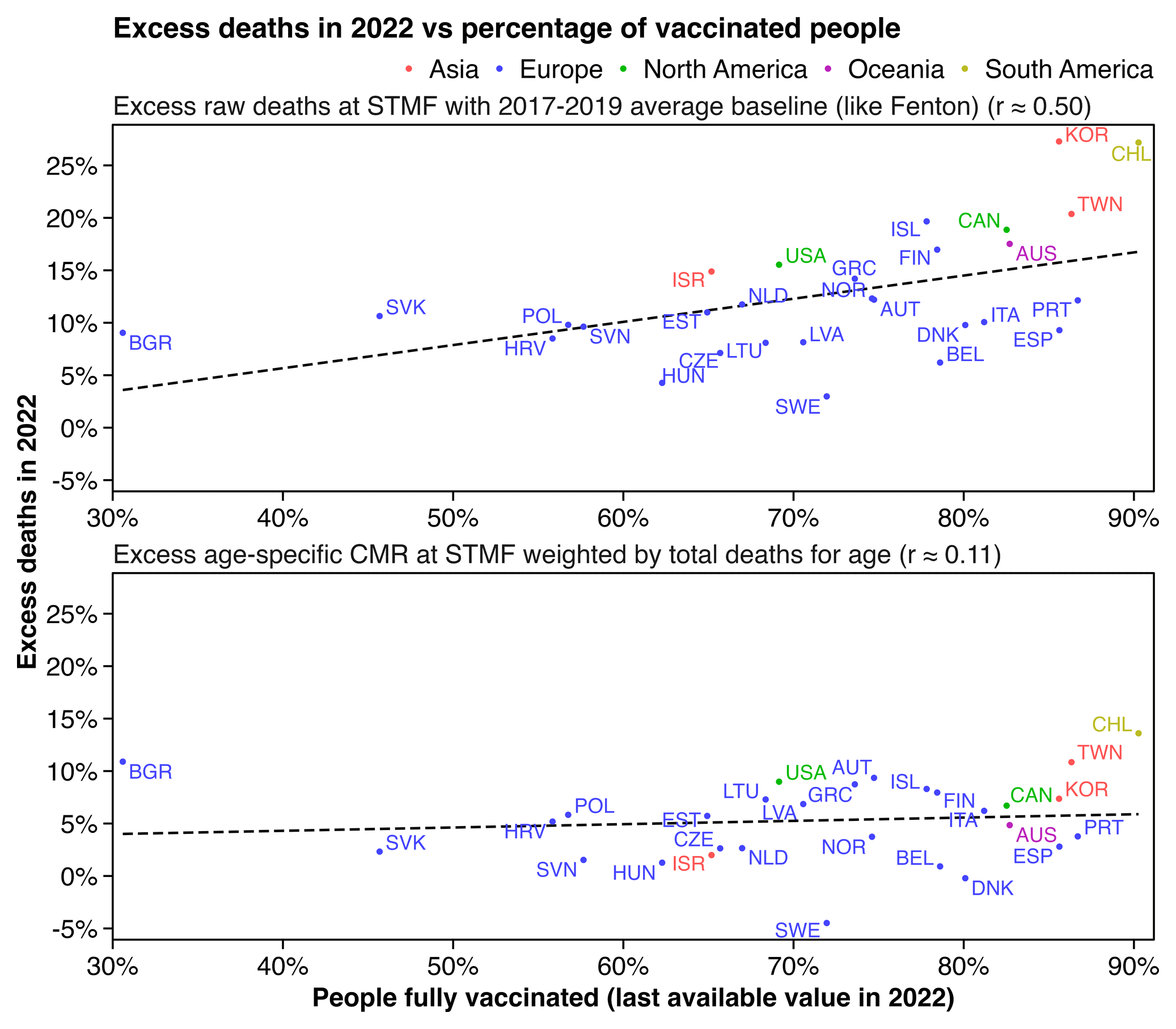 In this plot by USMortality if you look at the CMR in 2022 only, it's over twice as high in unvaccinated people as vaccinated people in ages 0-20, 21-40, and 41-60, but ages 81+ follow the opposite pattern so vaccinated people have about twice as high CMR as unvaccinated people. That should've served as a basic sanity check to USMortality that his population sizes were so inaccurate that he shouldn't even have published his analysis: [https://www.usmortality.com/p/new-zealands-all-cause-deaths-and]