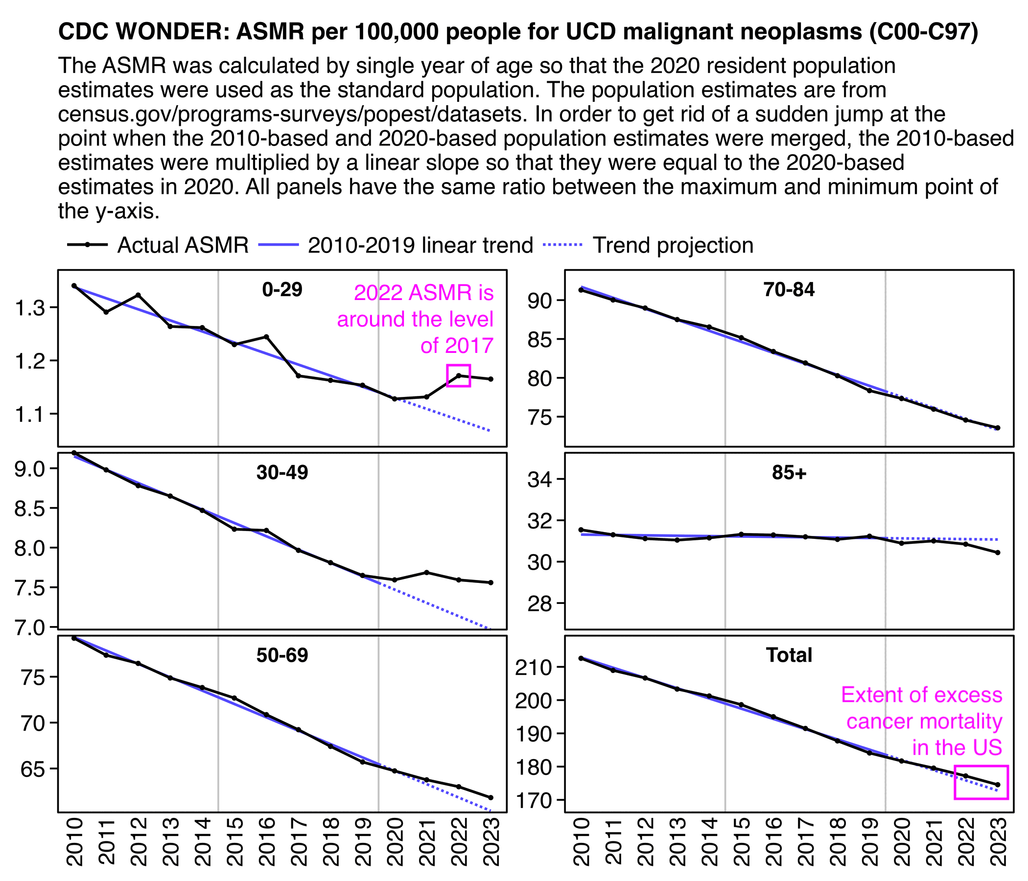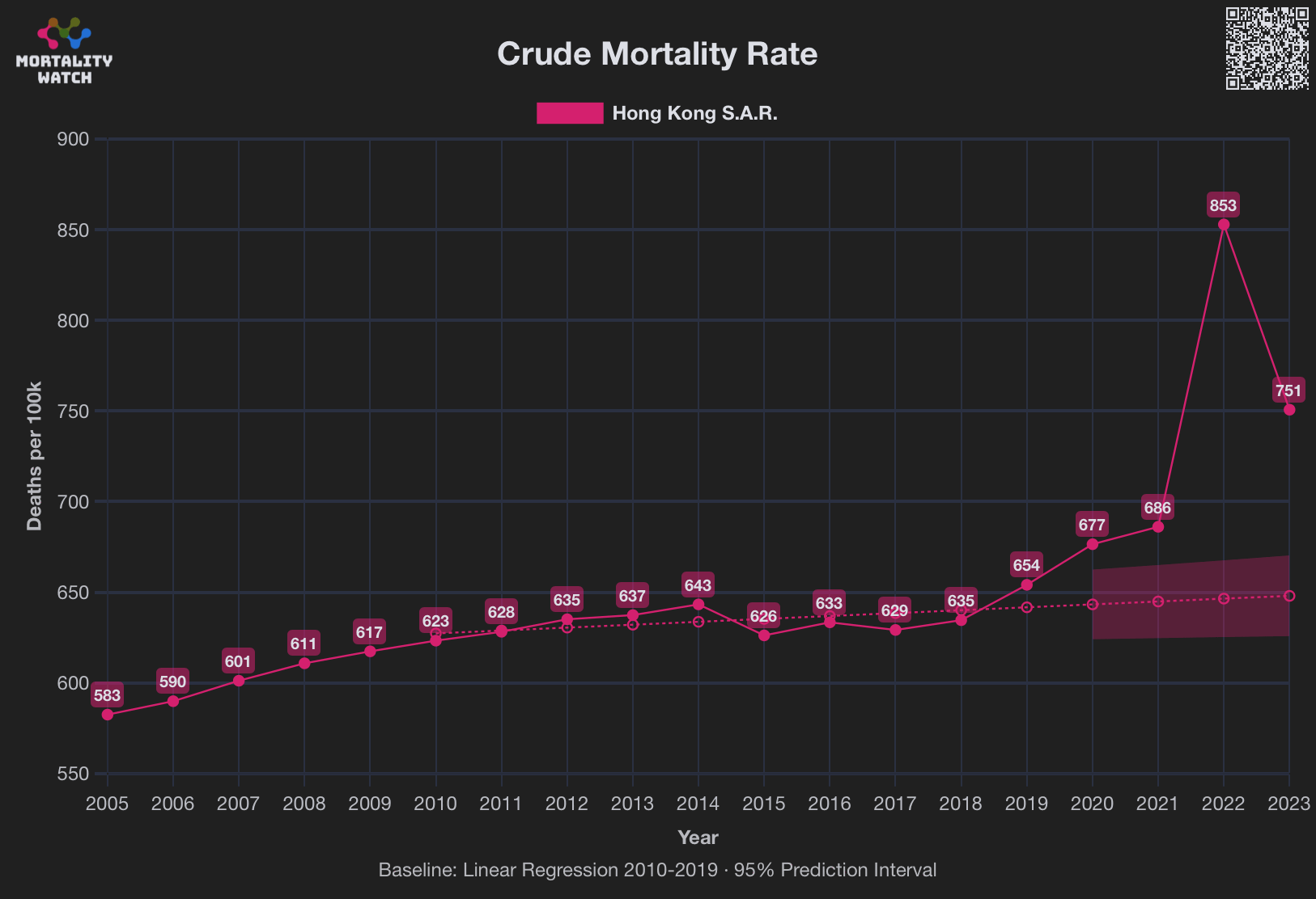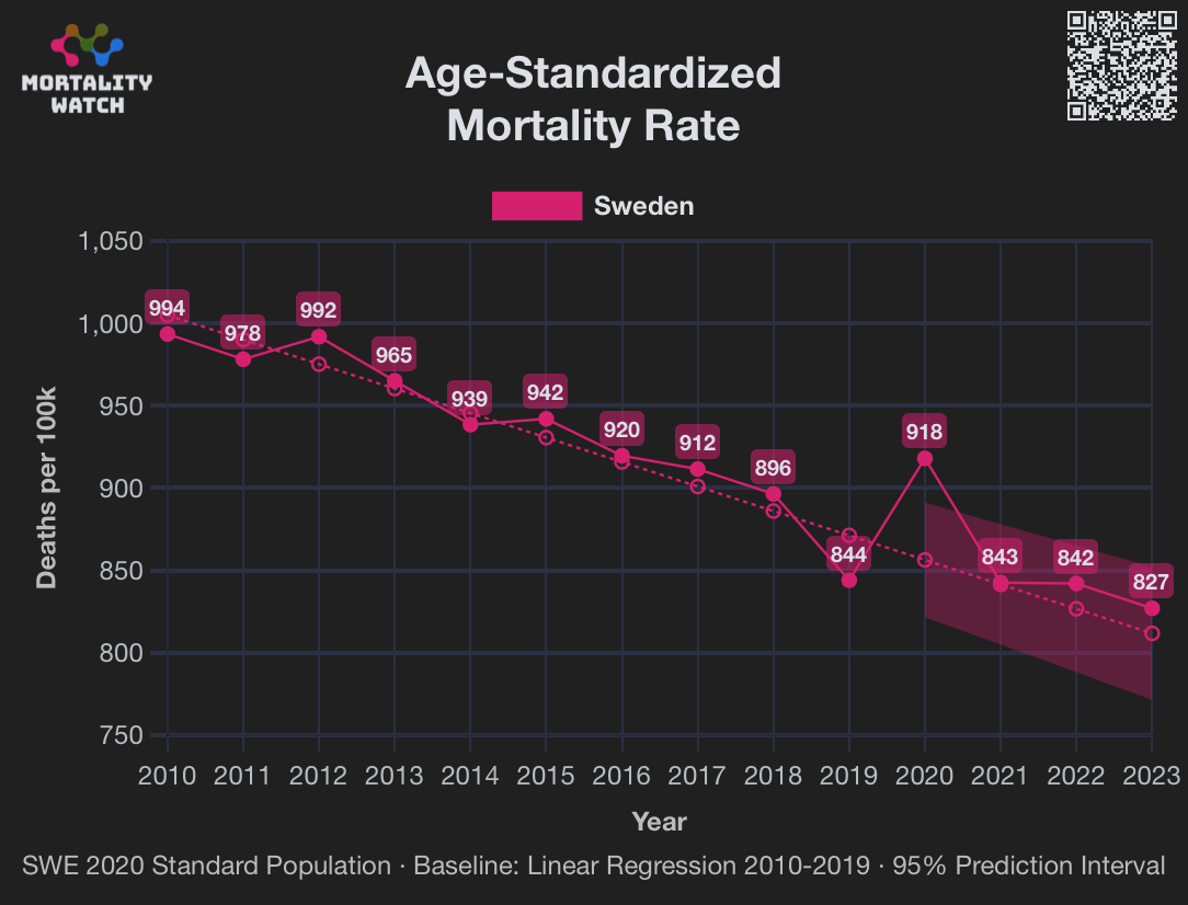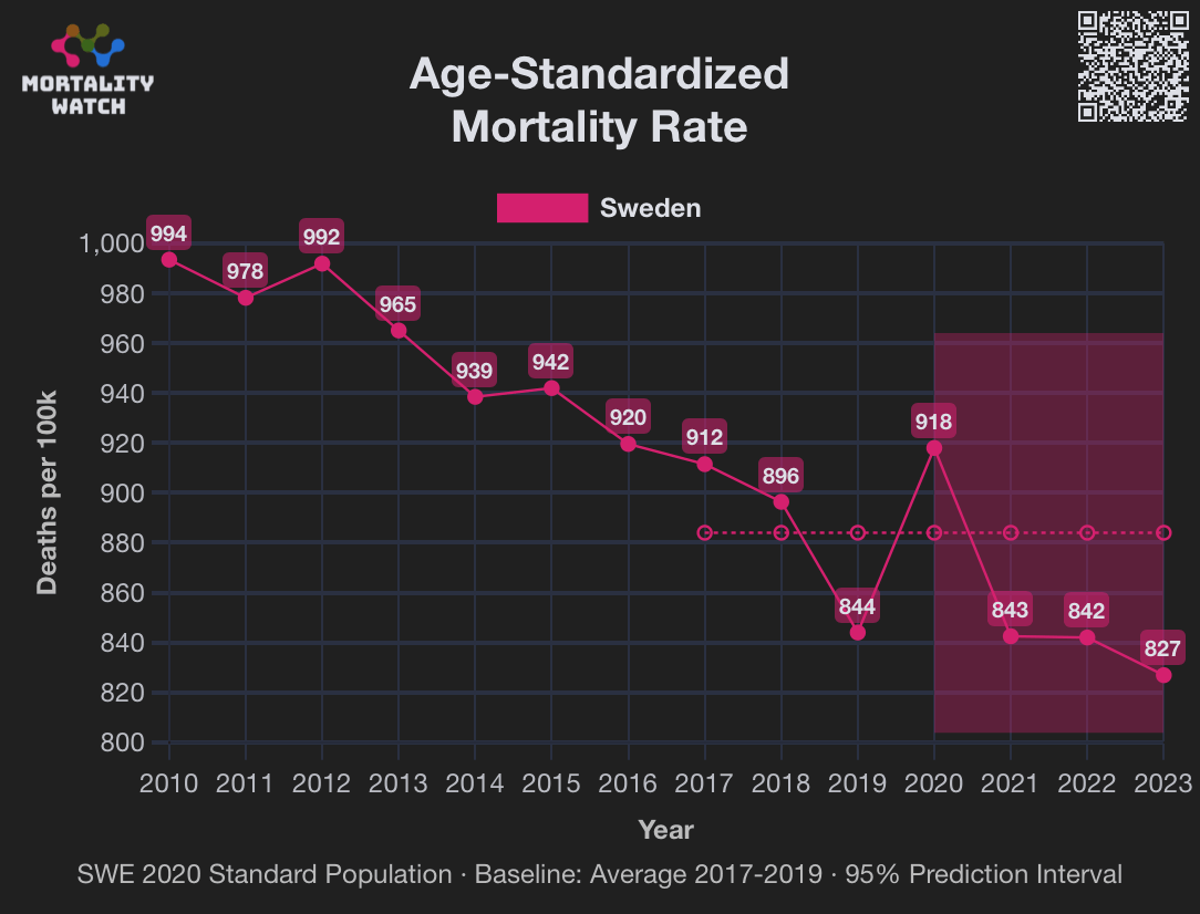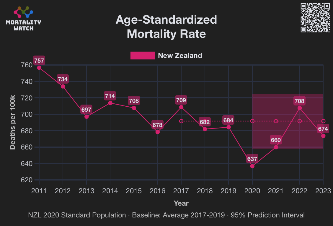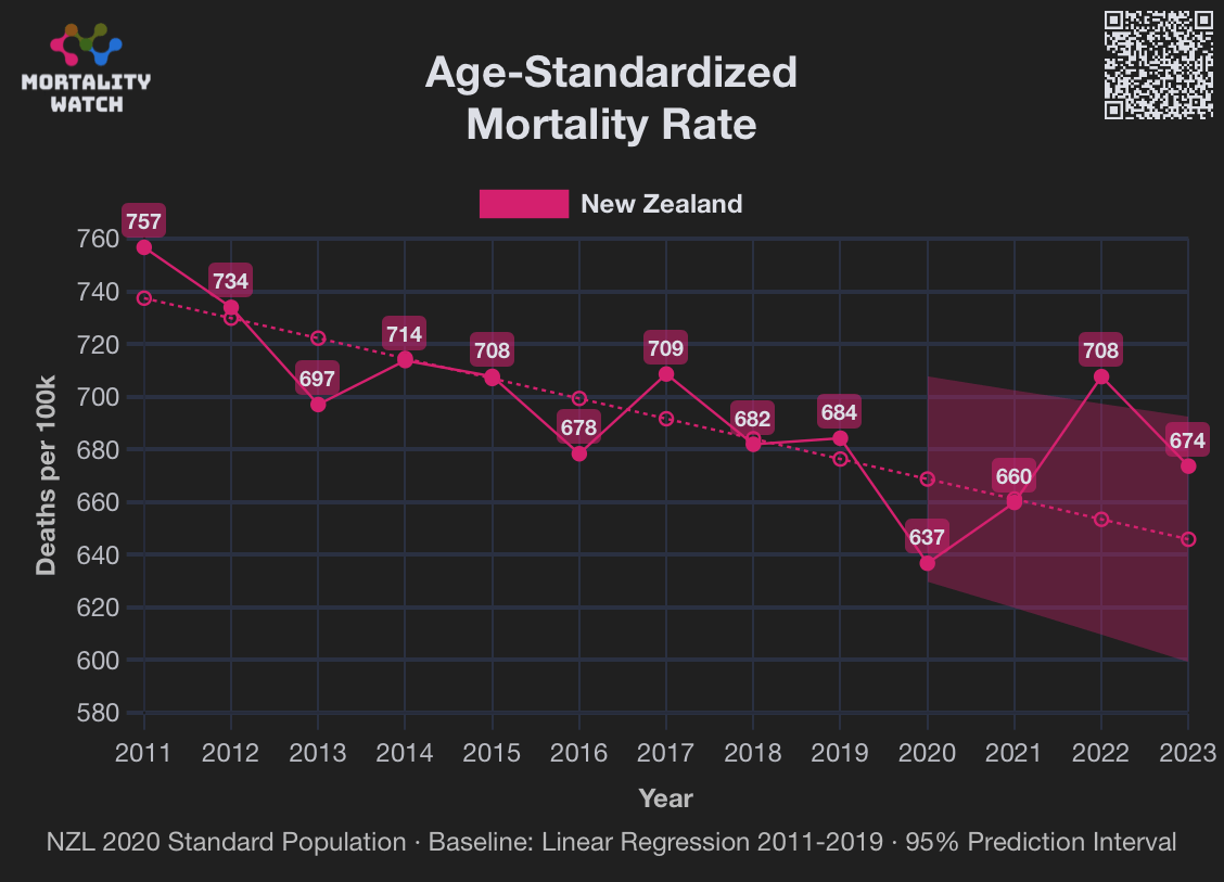 In his Substack post USMortality wrote that New Zealand "experienced no statistically significant excess mortality during the pandemic". He may have again meant that the yearly ASMR didn't cross above the 95% PI when he used a 2017-2019 average baseline. But the yearly ASMR would have crossed above the 95% PI if he would've used a 2011-2019 linear baseline instead: [https://www.mortality.watch/explorer/?c=NZL&df=2011&bm=lin_reg]