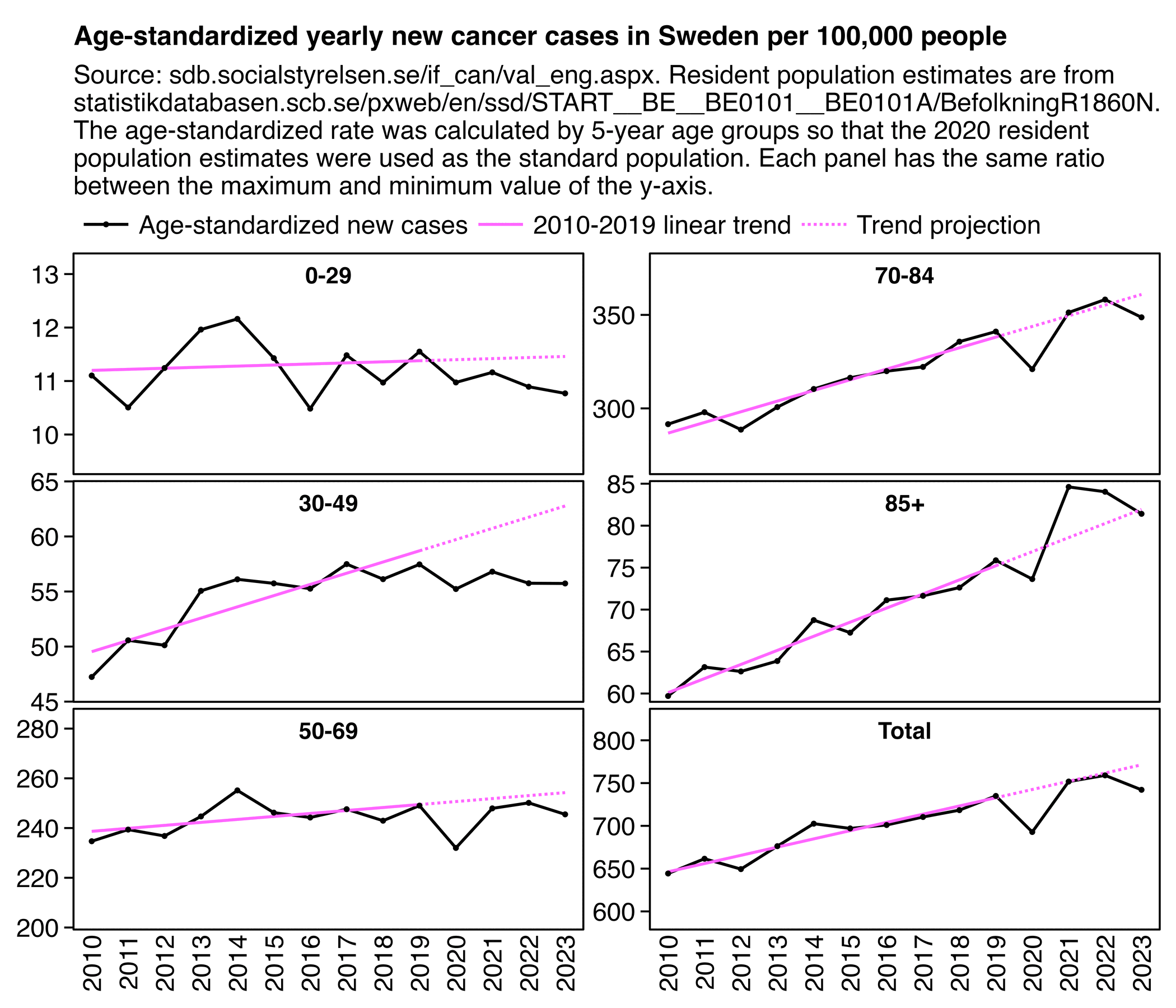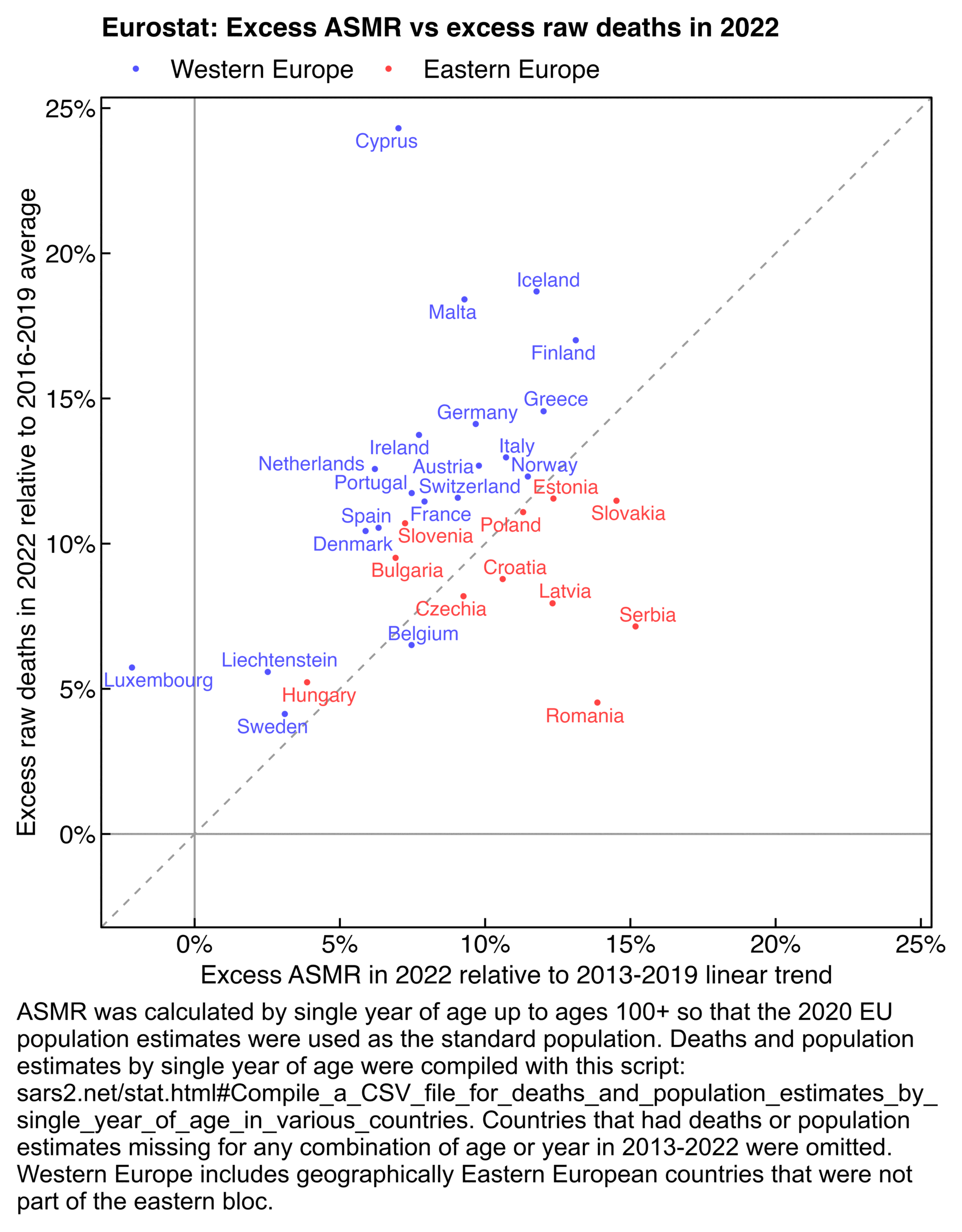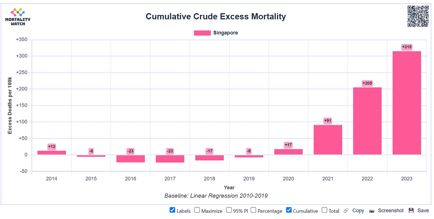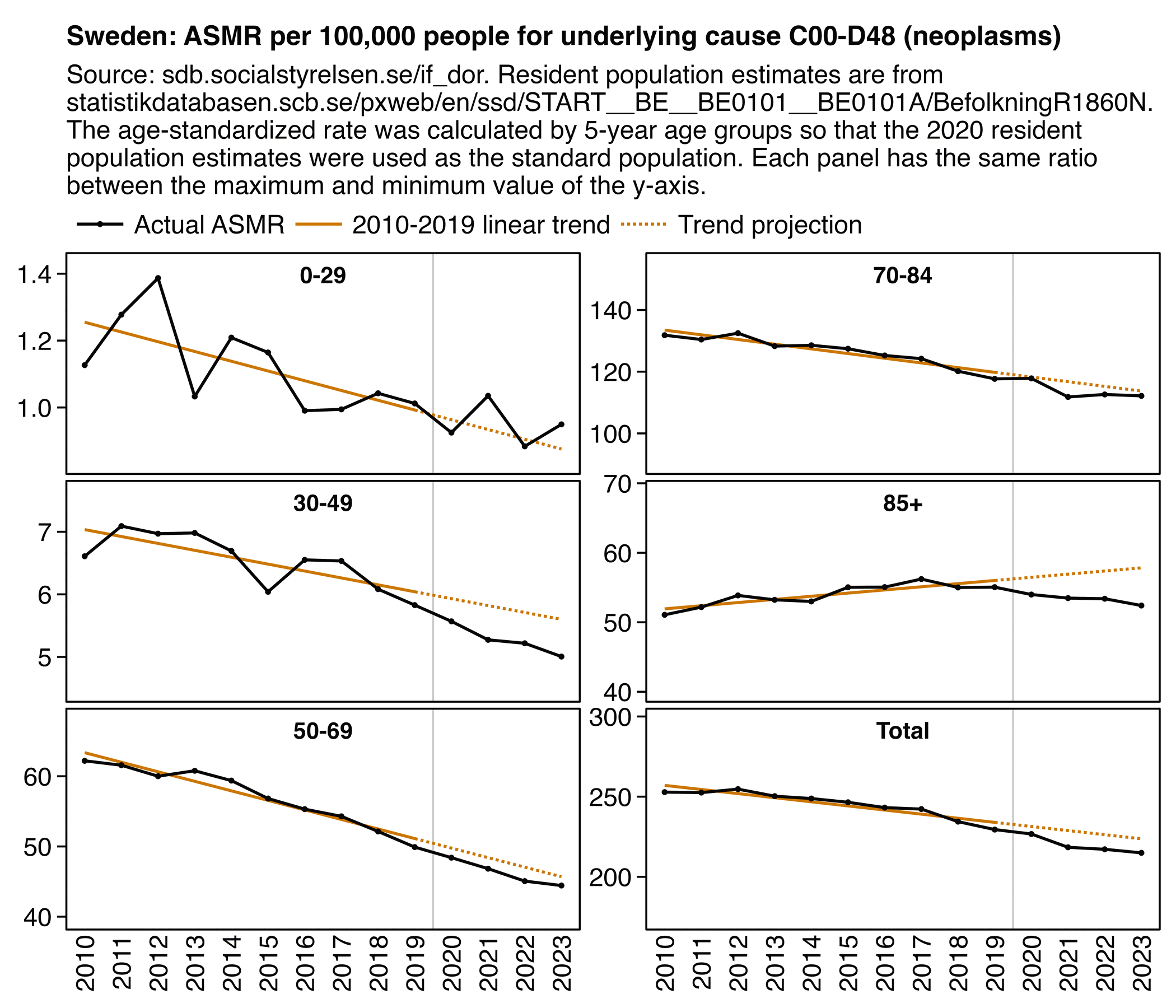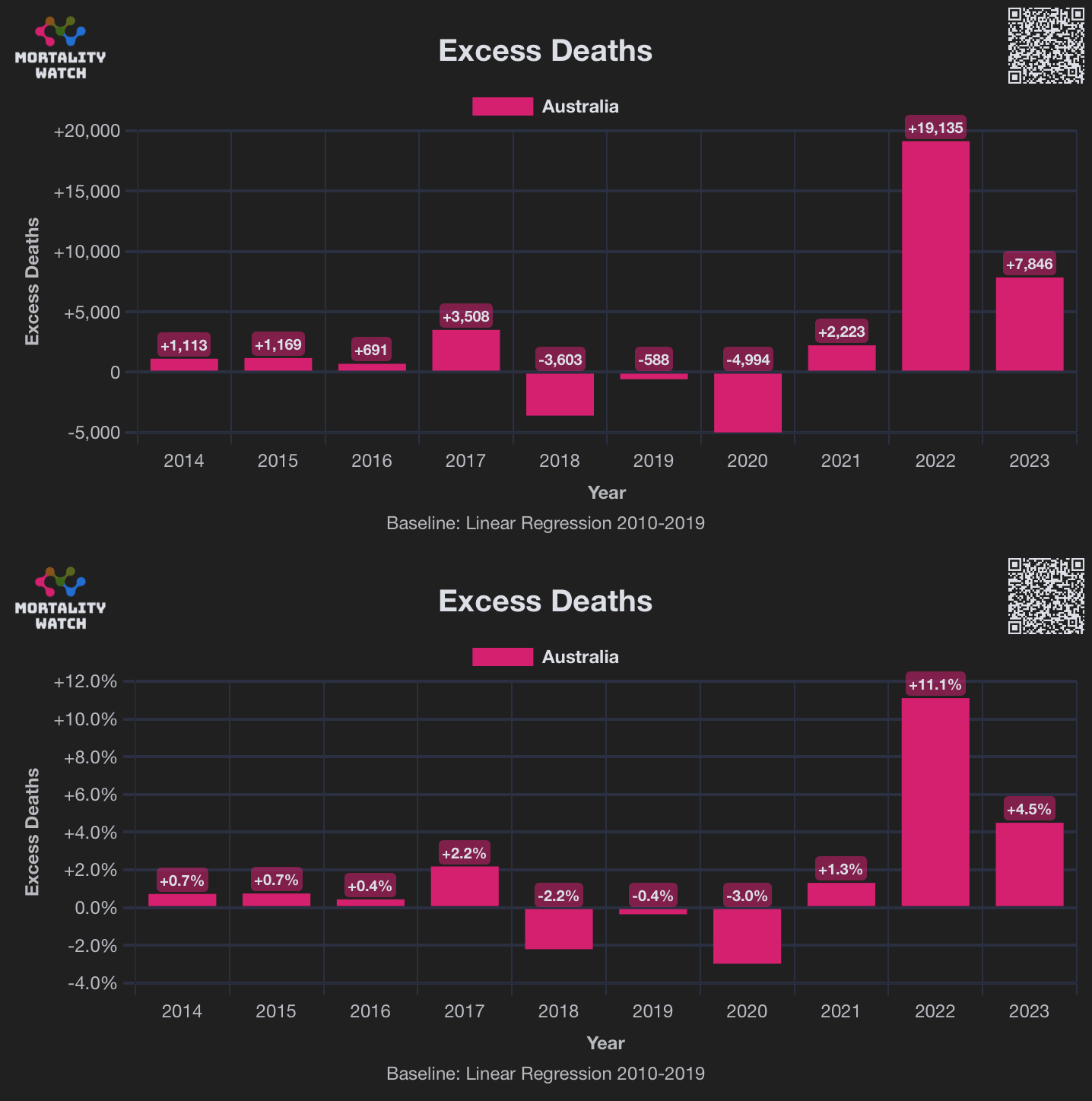 In his Substack post USMortality wrote that New Zealand "experienced no statistically significant excess mortality during the pandemic". He may have again meant that the yearly ASMR didn't cross above the 95% PI when he used a 2017-2019 average baseline. But the yearly ASMR would have crossed above the 95% PI if he would've used a 2011-2019 linear baseline instead: [https://www.mortality.watch/explorer/?c=NZL&df=2011&bm=lin_reg]
