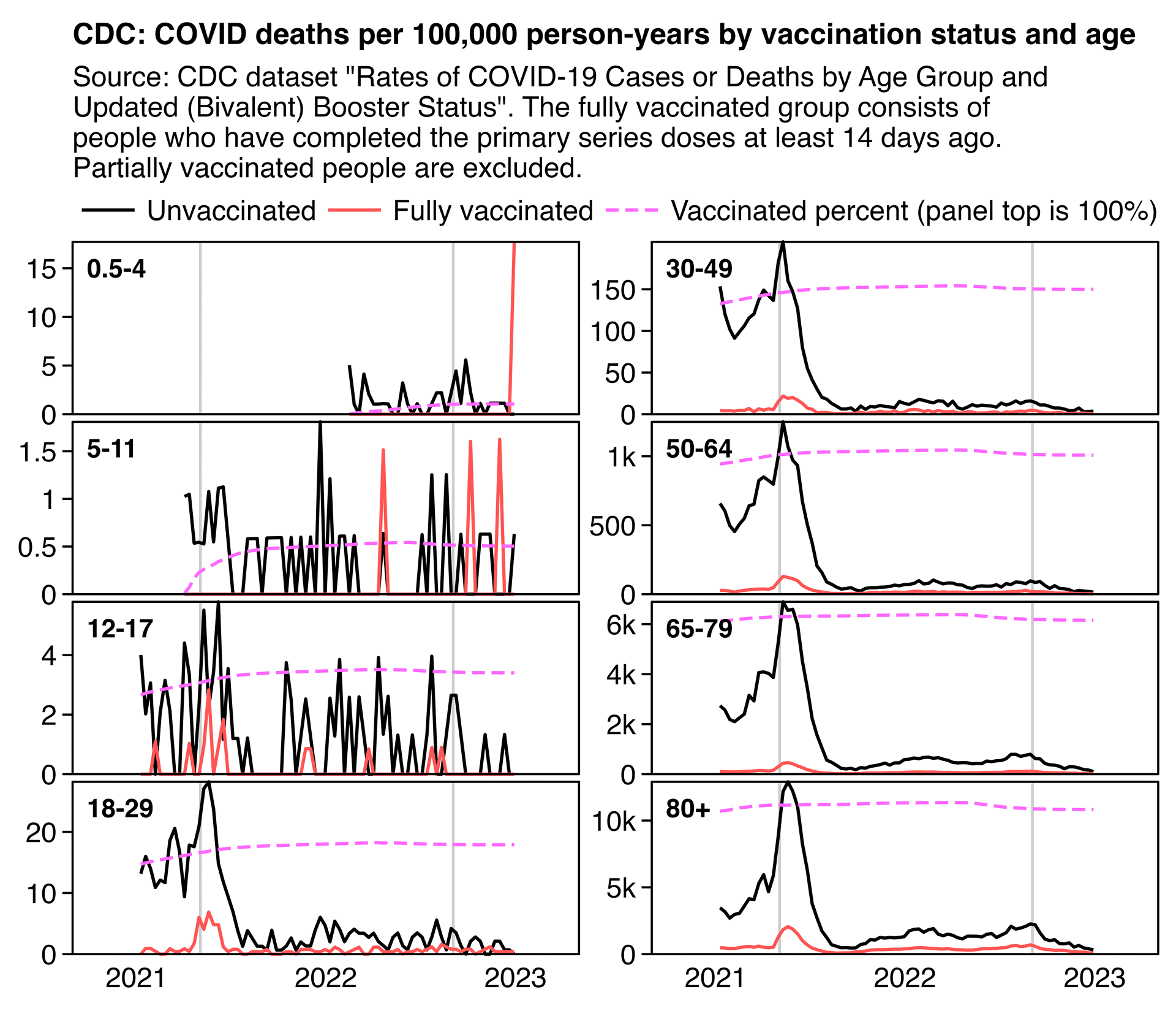 labs(title="CDC: COVID cases per 100,000 person-years by vaccination status and age",subtitle=paste0("Source: CDC dataset \"Rates of COVID-19 Cases or Deaths by Age Group and Updated (Bivalent) Booster Status\". The fully vaccinated group consists of people who have completed the primary series doses at least 14 days ago. Partially vaccinated people are excluded.")|>stringr::str_wrap(76),x=NULL,y=NULL)+
