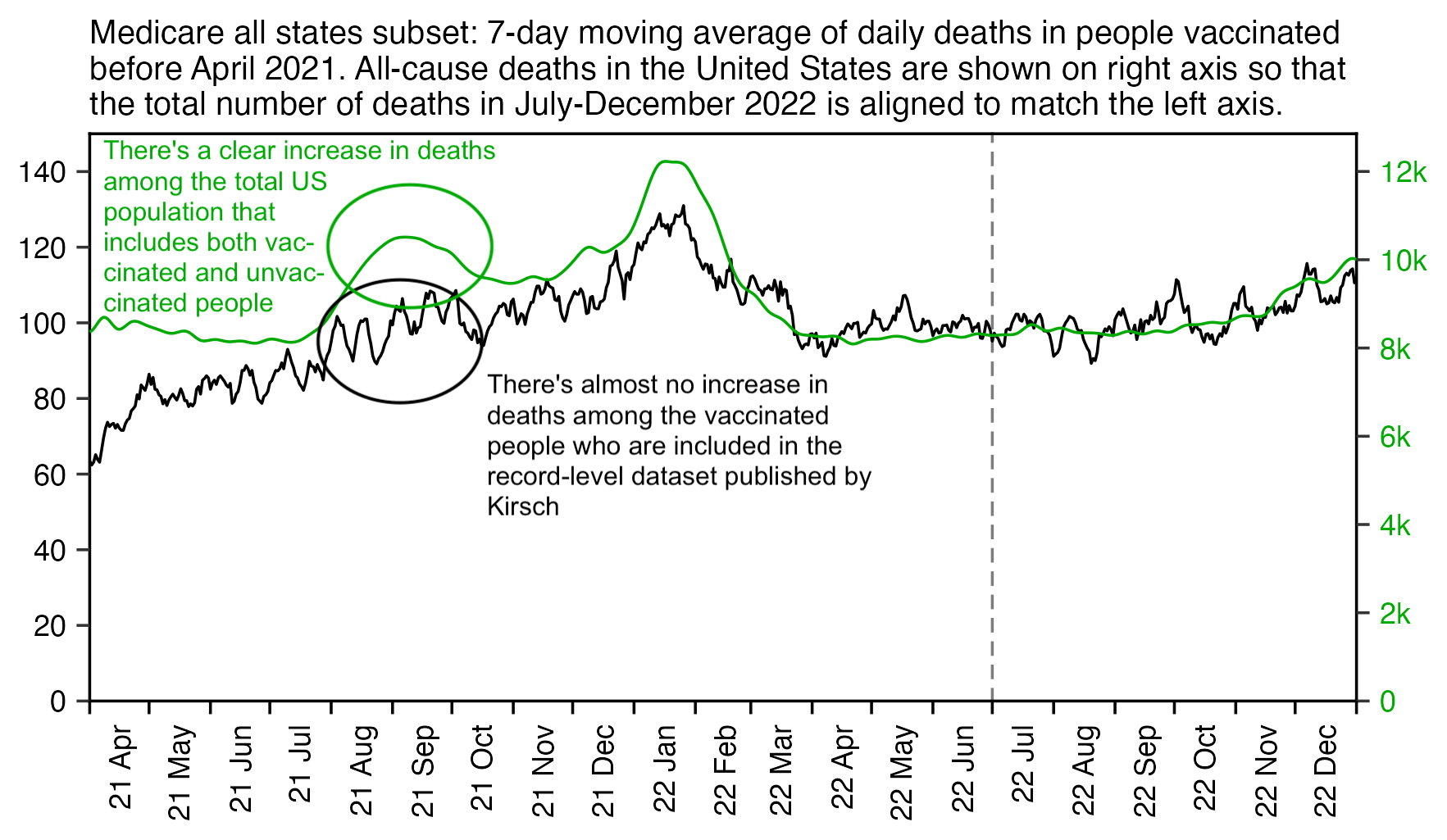 In the Medicare datasets Kirsch has published, there are many people who are actually vaccinated but who are listed as unvaccinated because they had no vaccine dose listed in the Medicare ddatabase. There are also many people who were listed as unvaccinated until they got a booster dose:
